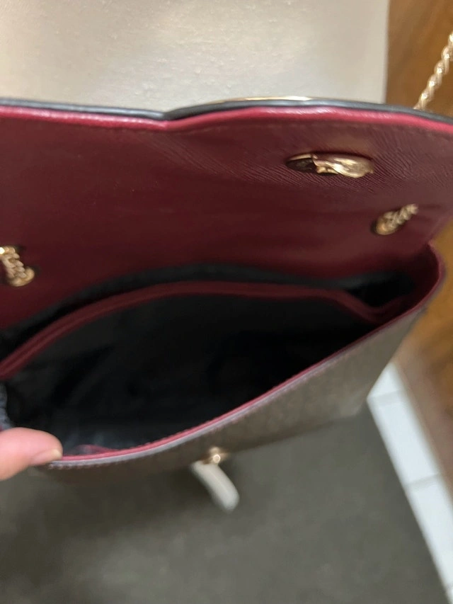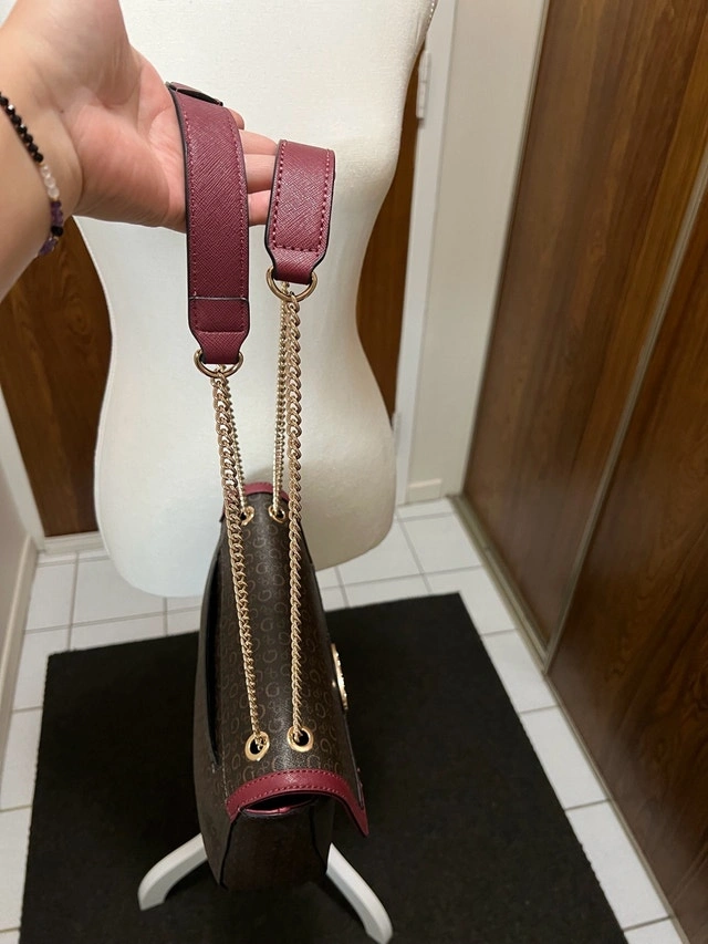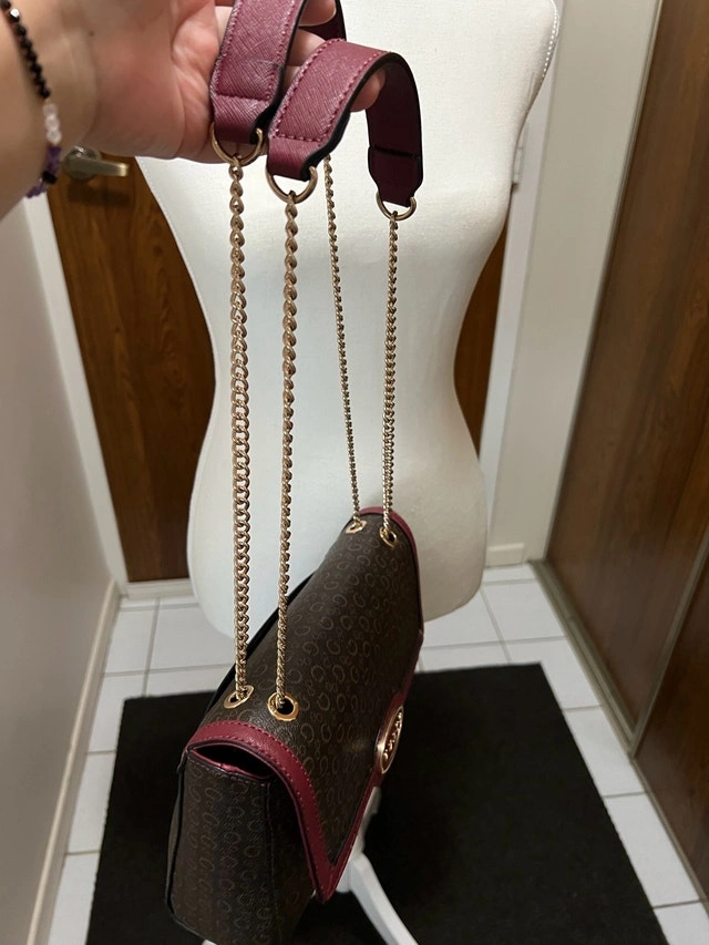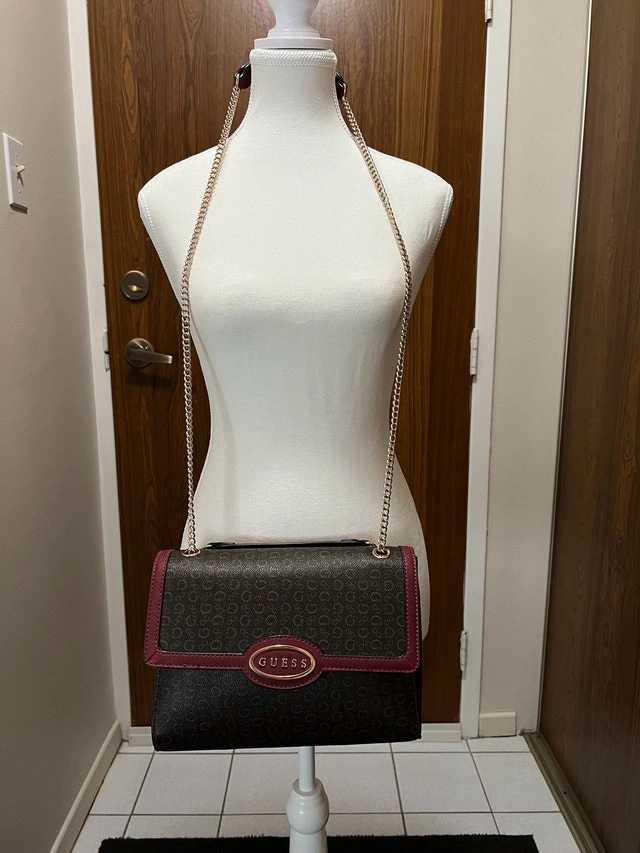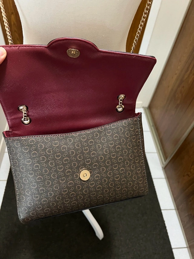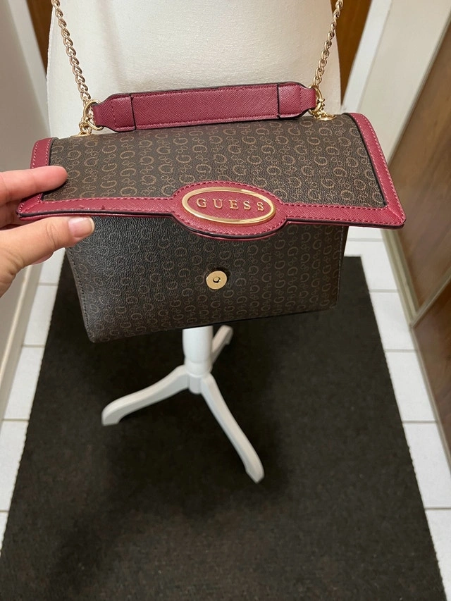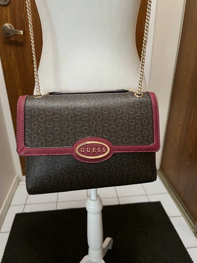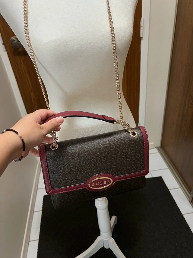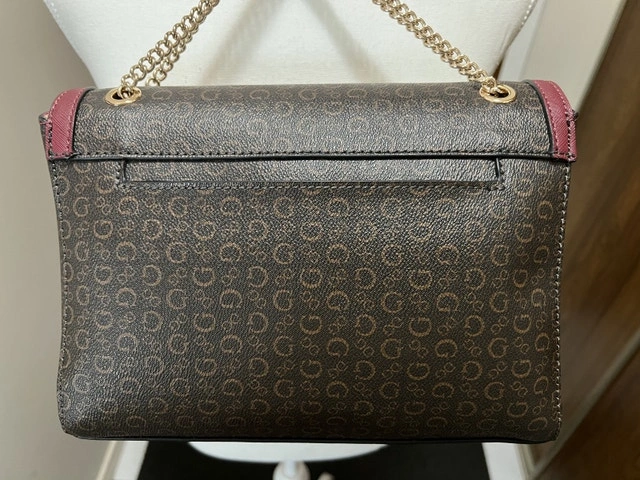 This Guess handbag features a stylish monogram pattern with a maroon trim, perfect for adding a touch of sophistication to any outfit. It's in good, used condition. The strap is gold.
