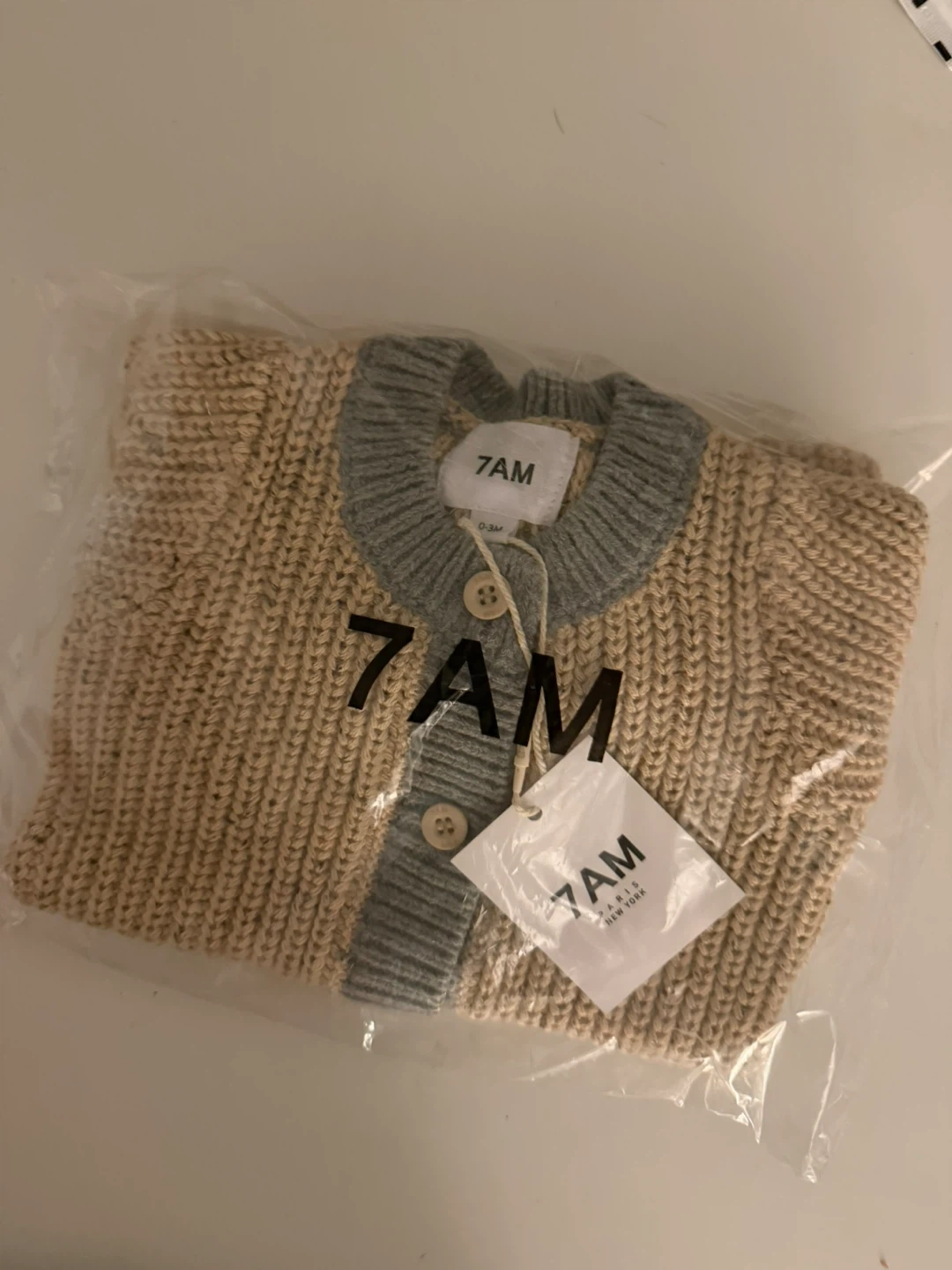 This is a brand new 7AM Enfant long sleeve chunky knit jumpsuit in size 0-3 months! It's a super cute and cozy outfit for your little one. The item is still in its original packaging.
