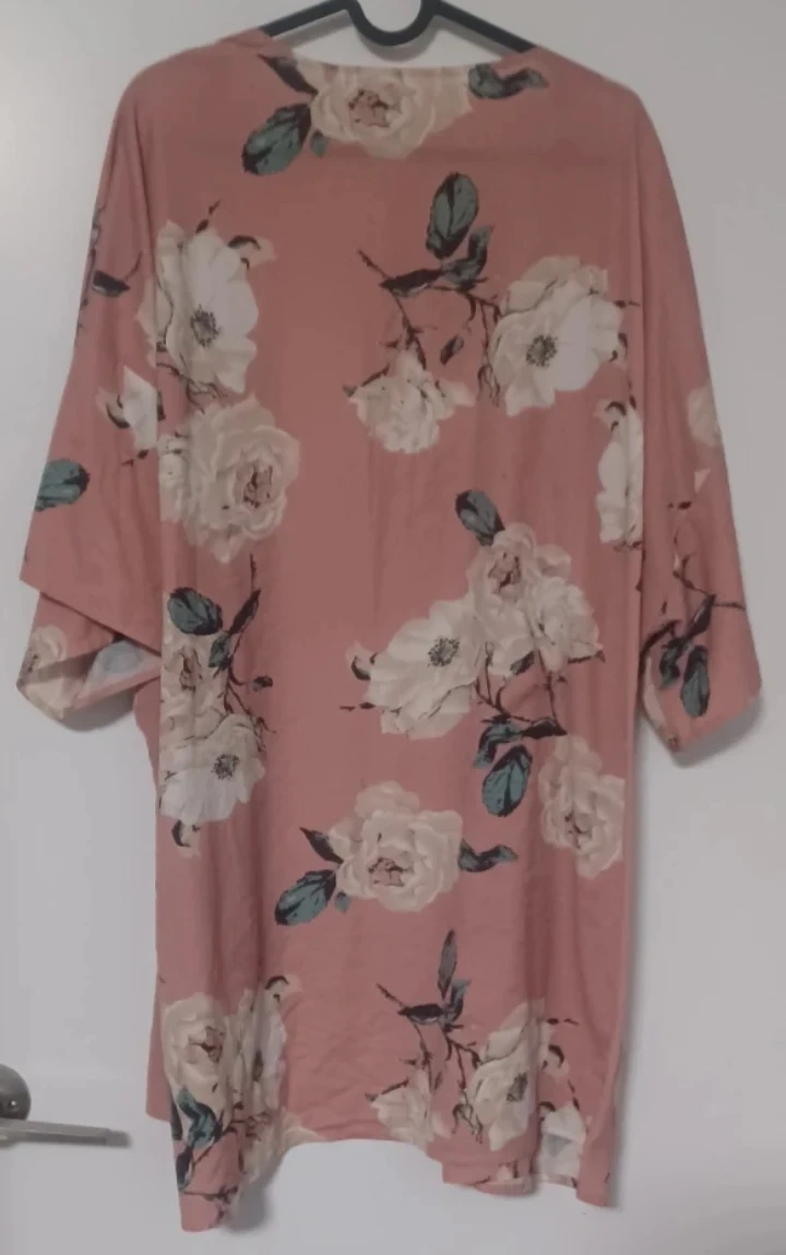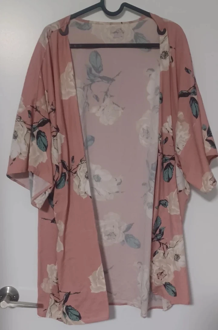 Selling a comfy floral kimono in a lovely pink colour! It's perfect for layering or wearing as a light cover-up. The material is soft and flowy, great for spring or summer. It has a beautiful floral pattern with white roses and green leaves and it was used primarily as a house coat.