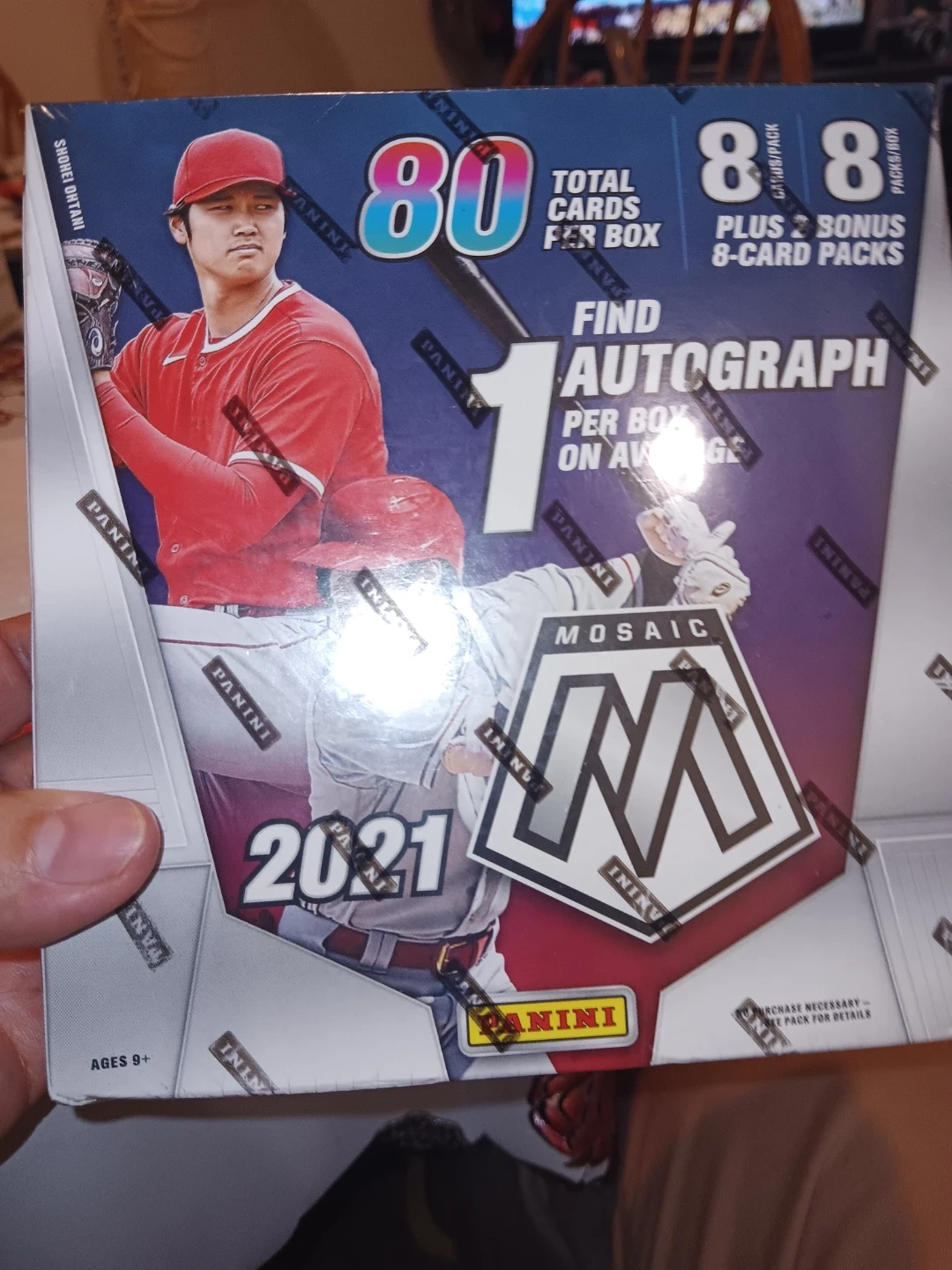 Selling a box of Panini Mosaic 2021 baseball cards! The box contains 80 total cards, plus 2 bonus 8-card packs. There's a chance to find an autograph per box, on average. Ages 9+ sealed box.