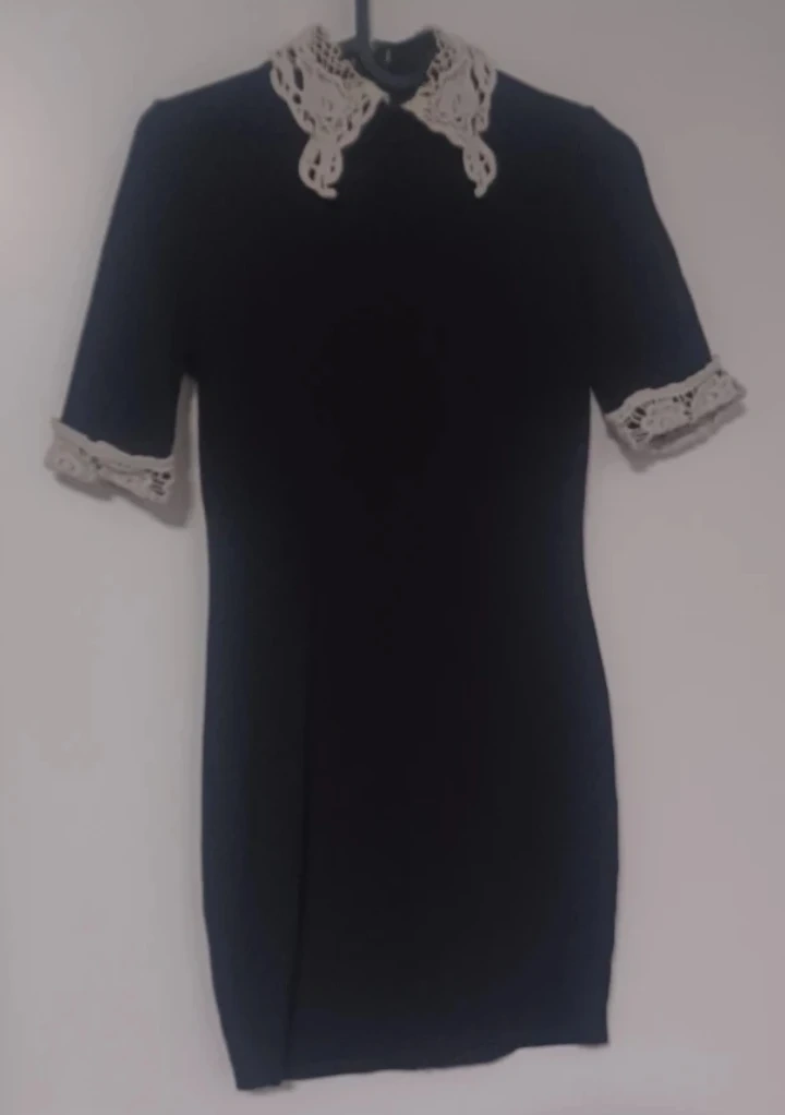 Cute black mini dress with a unique lace collar and sleeve detail! It's perfect for a night out or a special occasion (also passes as a Wednesday Costume!)