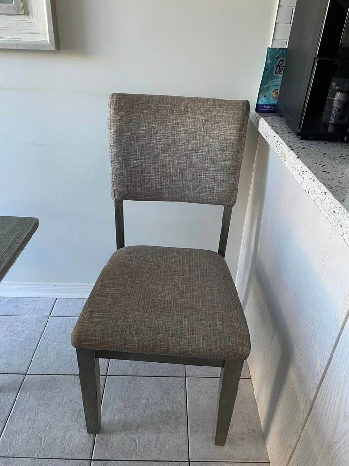 Used with wear and tear. Table and legs have scratches and chips and the chairs need a deep shampoo cleaning. This can all be completely restored and the table and chairs are all functionally very sturdy.