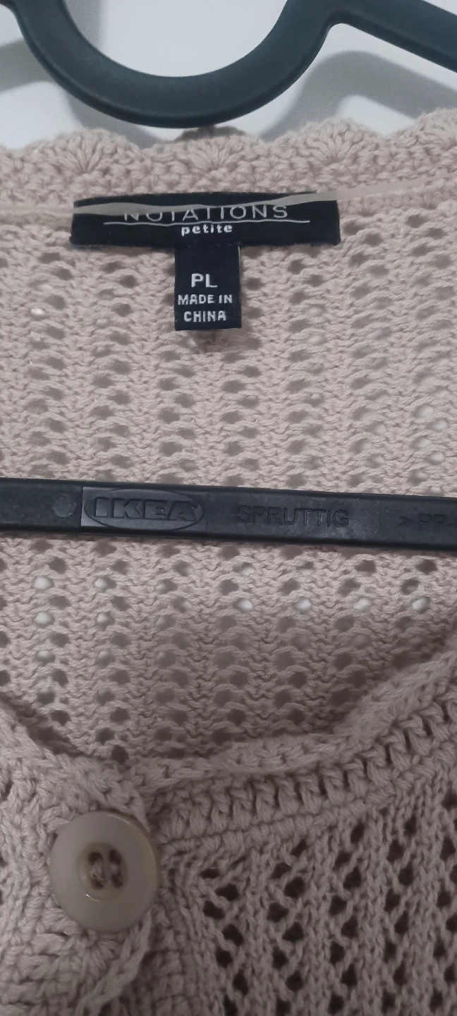 Cozy Notations Petite cardigan in size PL. It's a lovely neutral colour and perfect for layering. The open knit design makes it breathable and stylish. Great for adding a touch of warmth and texture to any outfit!