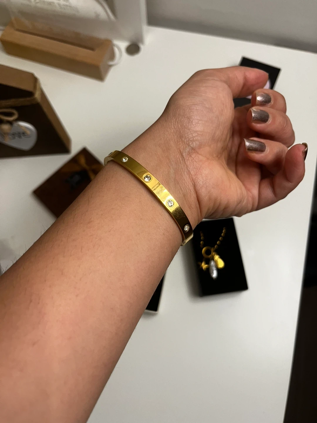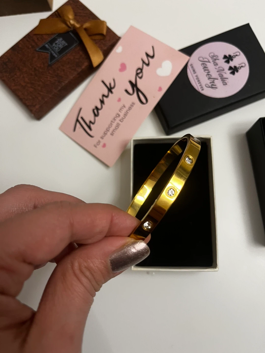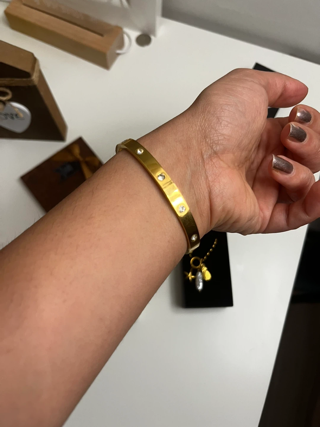 Selling a beautiful gold plated steel waterproof bangle bracelet from Sha Nahla Jewelry! It's in great condition and comes with the box. Perfect for adding a touch of elegance to any outfit