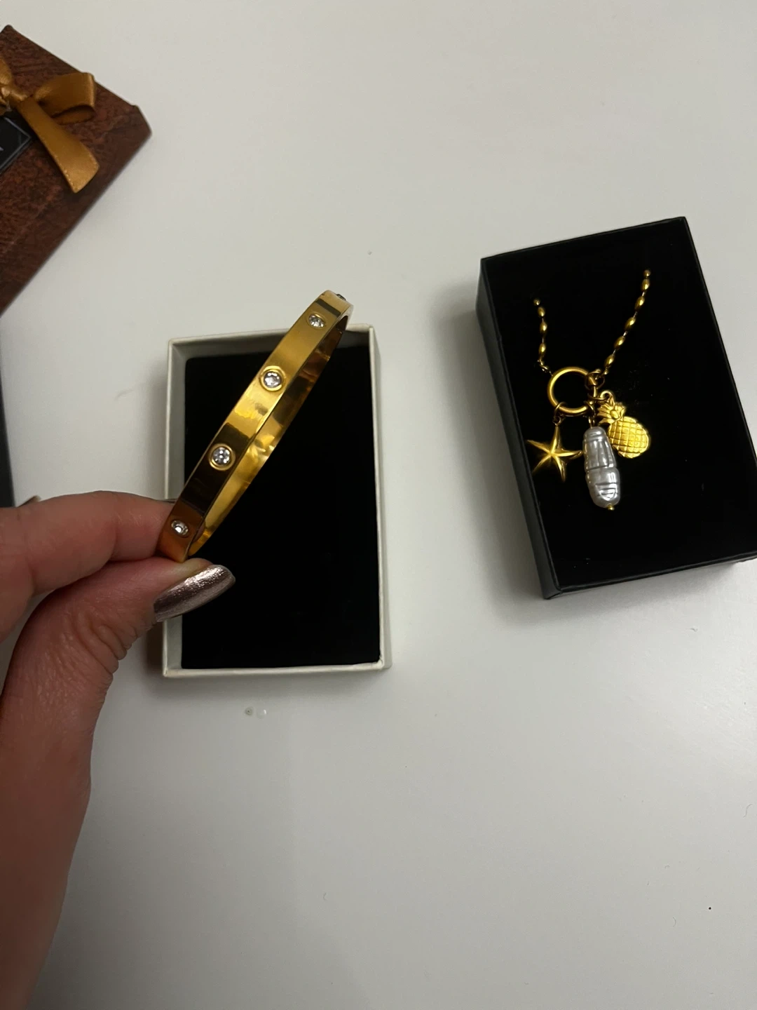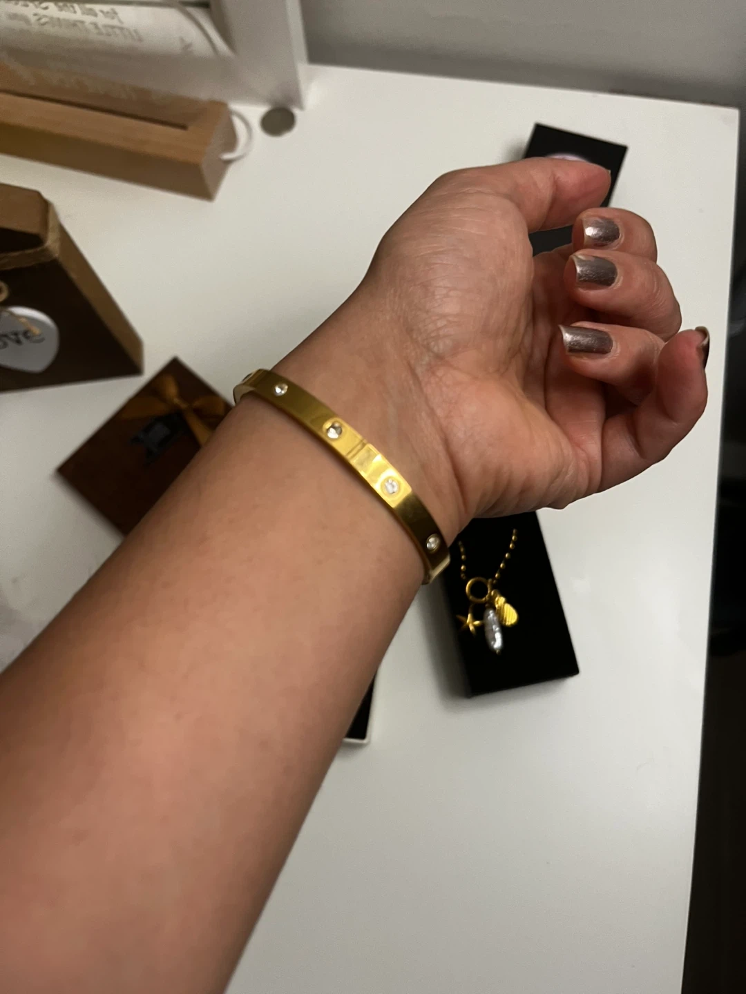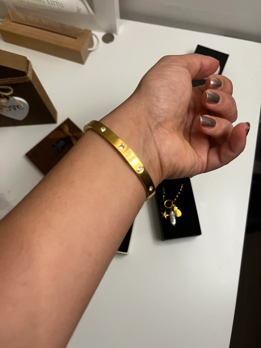 Selling a beautiful gold plated steel waterproof bangle bracelet from Sha Nahla Jewelry! It's in great condition and comes with the box. Perfect for adding a touch of elegance to any outfit
