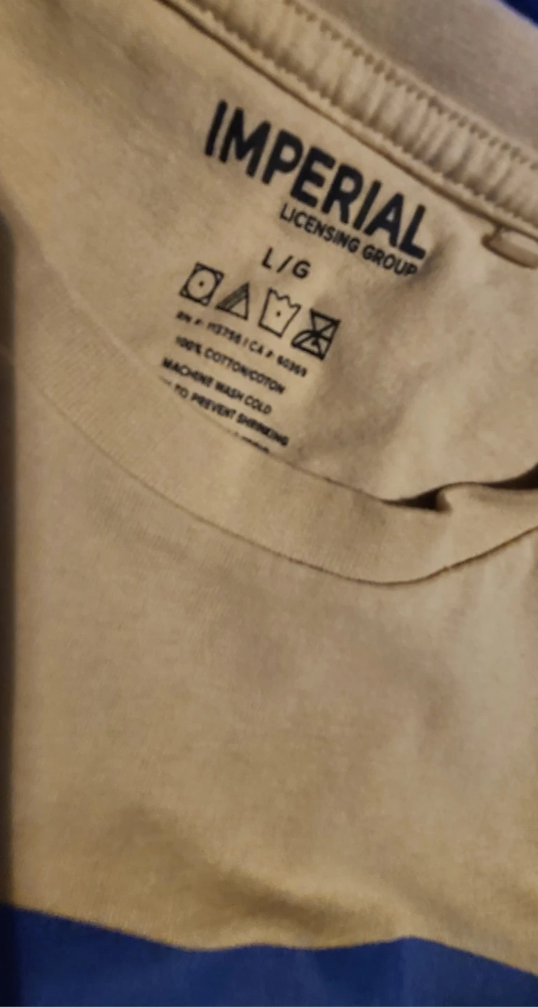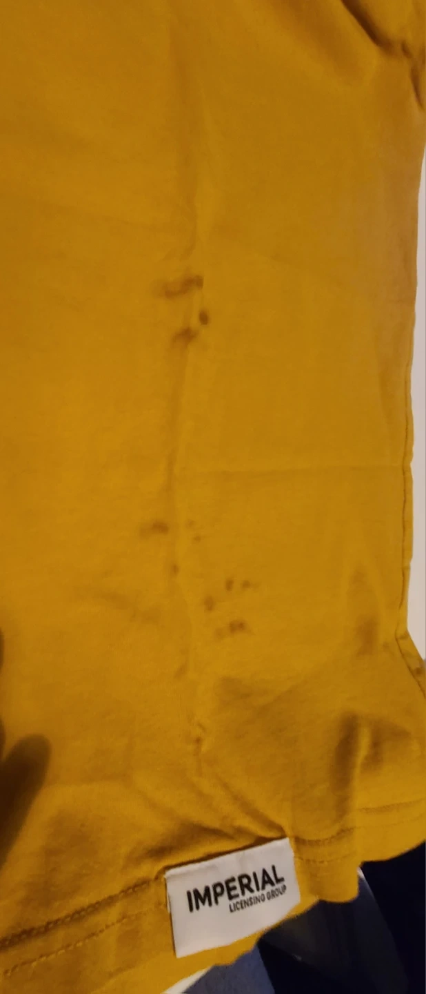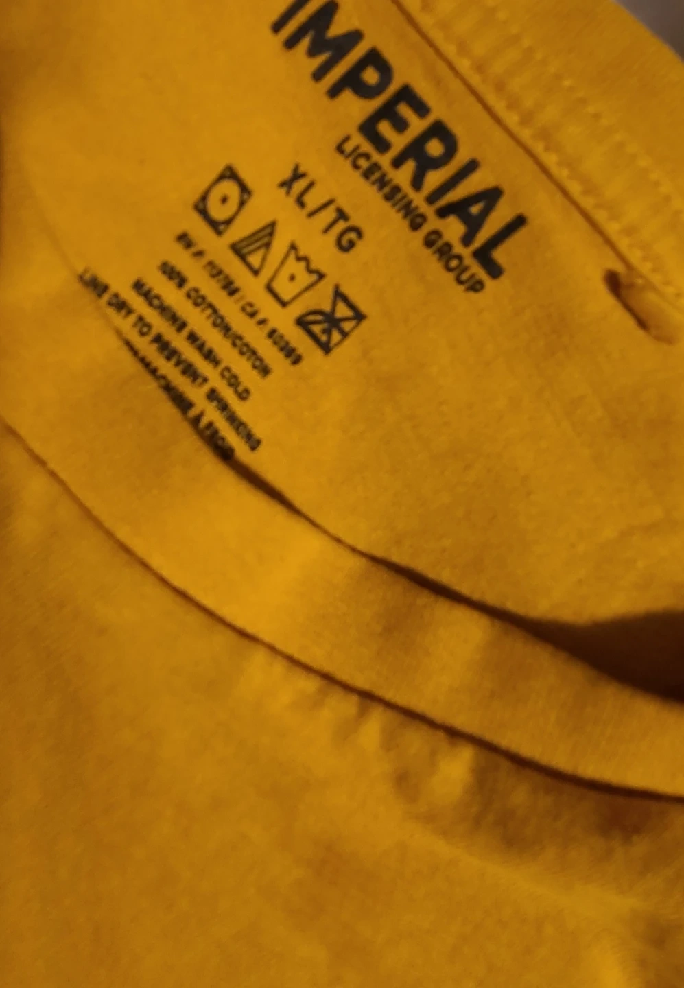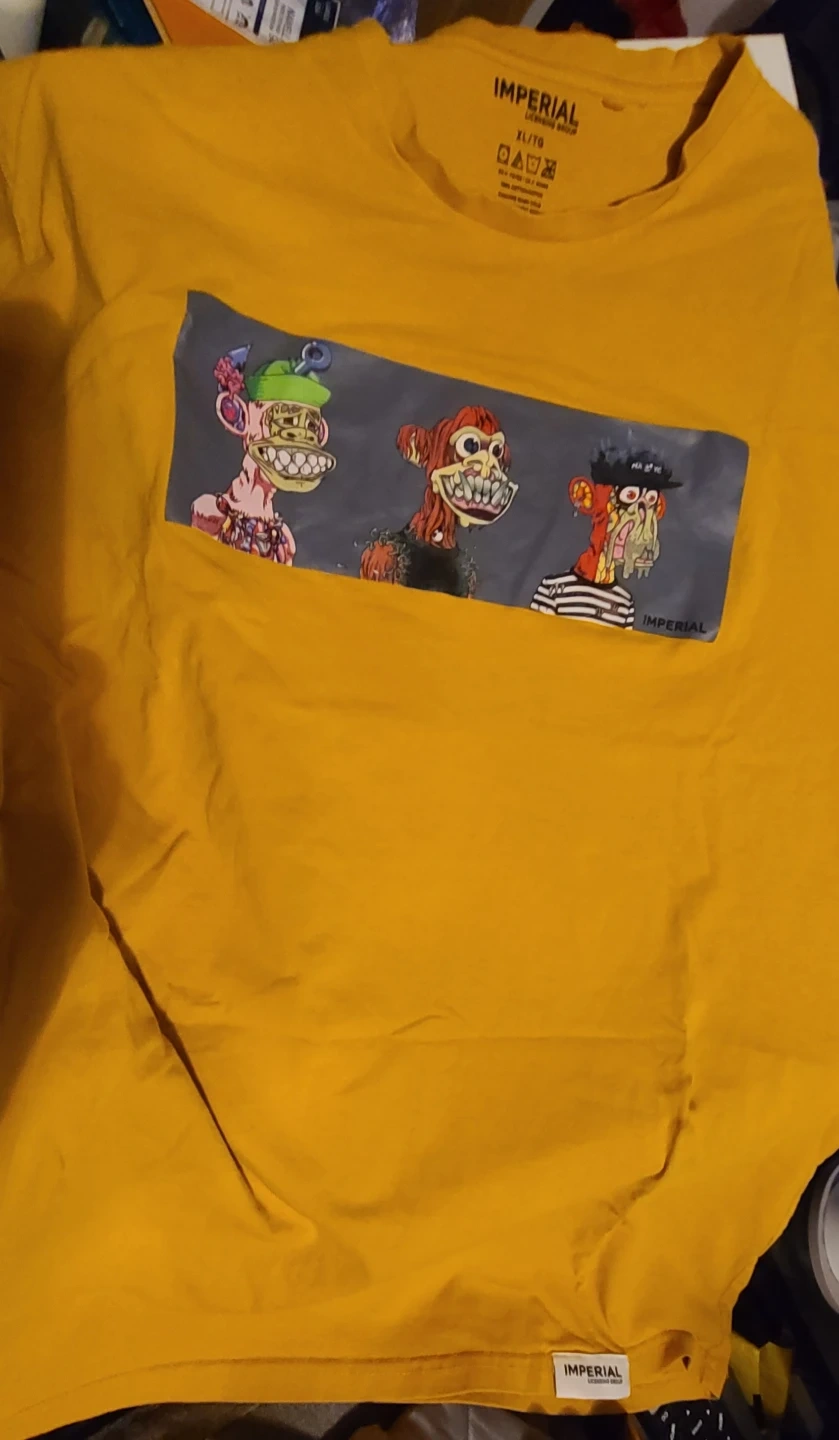 Here's a yellow Imperial Licensing Group T-shirt in size XL and Lrg. Both have a graphic print on the front. Please note there are some stains on 1 shirt.