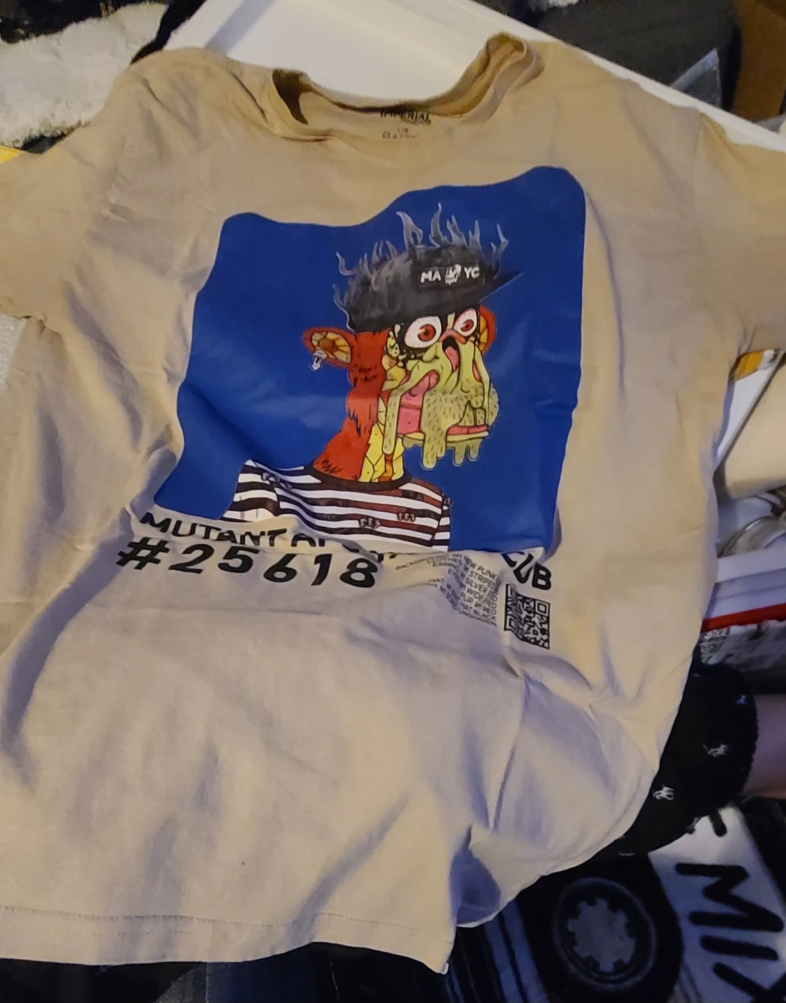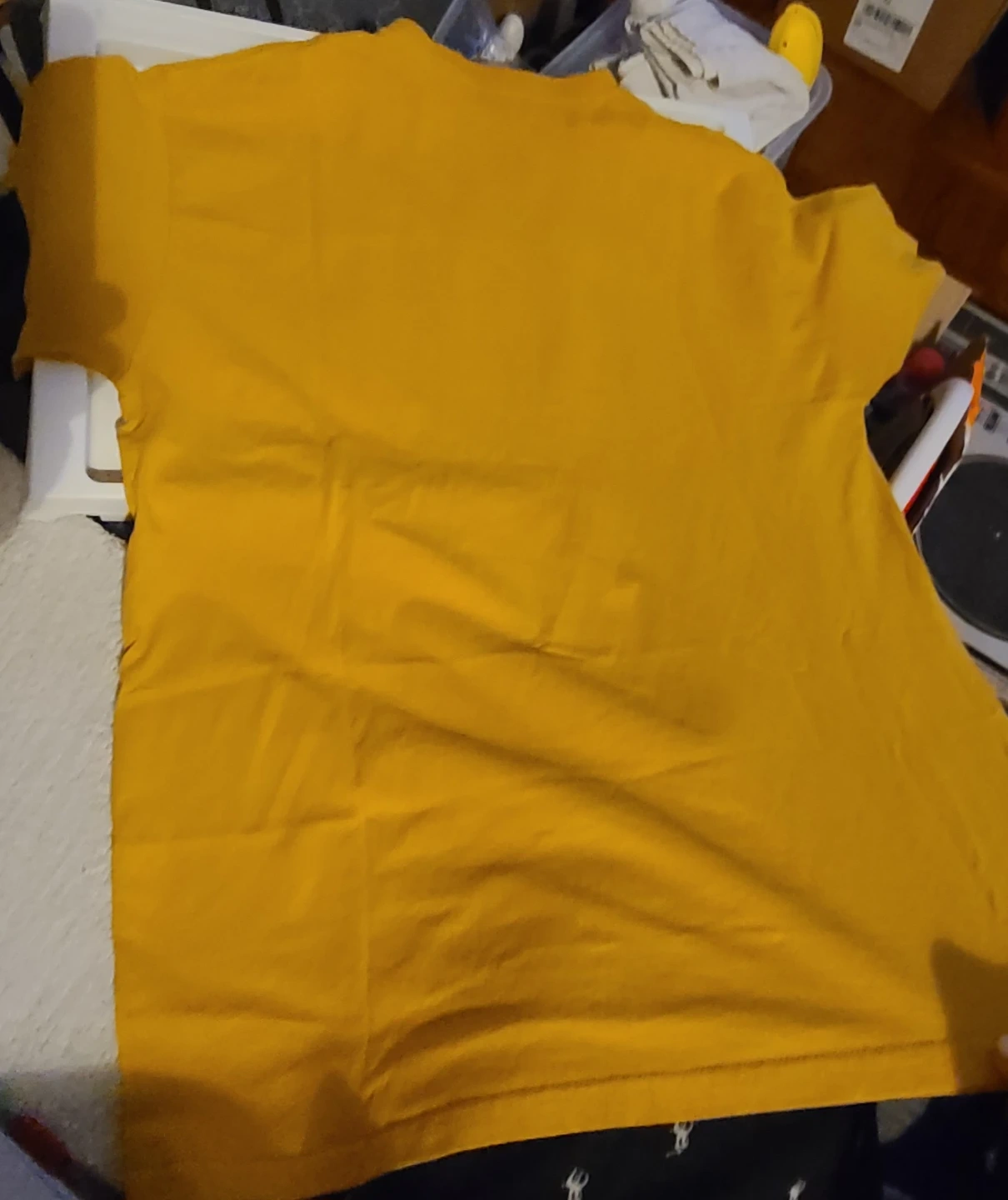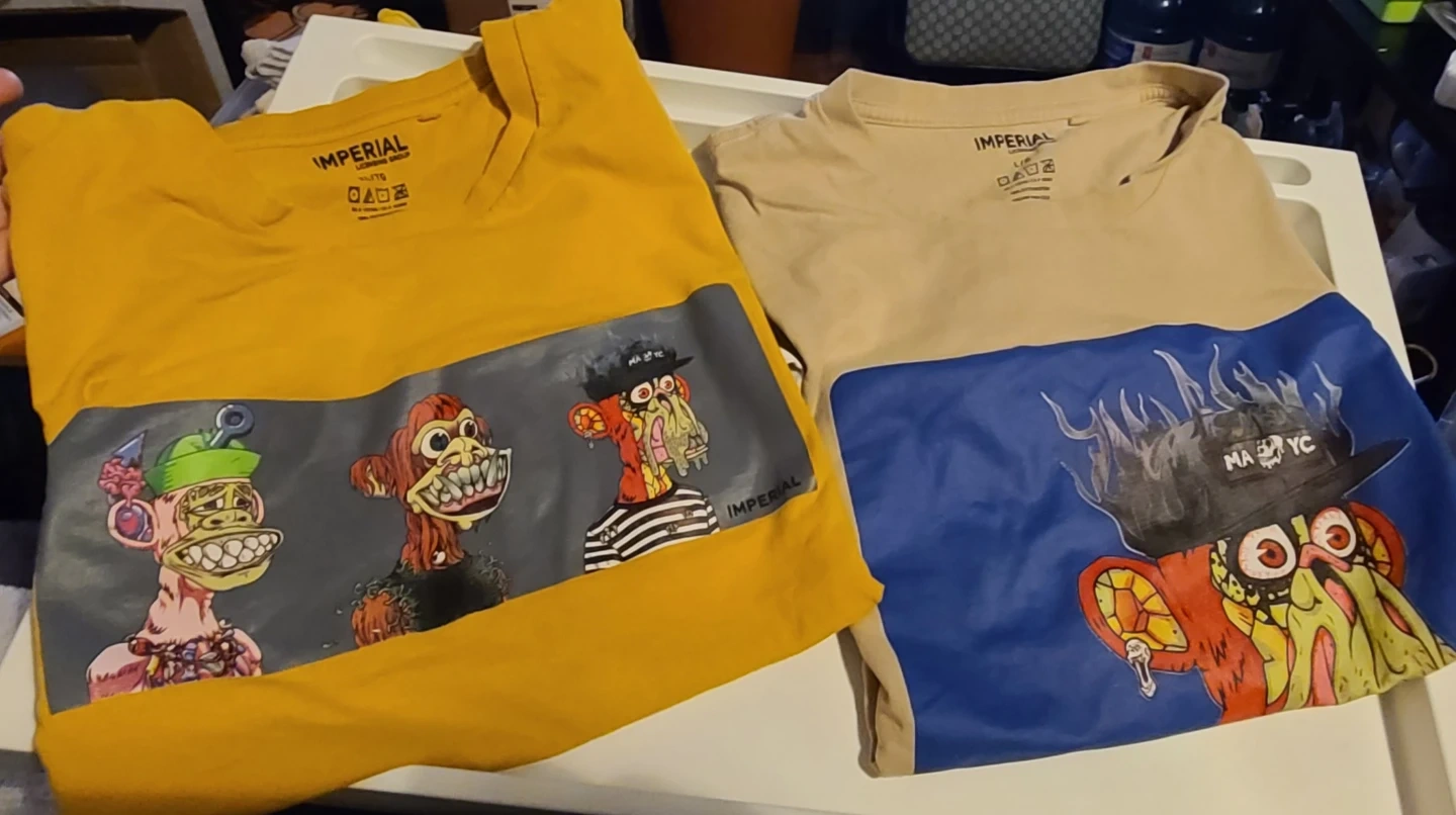Here's a yellow Imperial Licensing Group T-shirt in size XL and Lrg. Both have a graphic print on the front. Please note there are some stains on 1 shirt.
