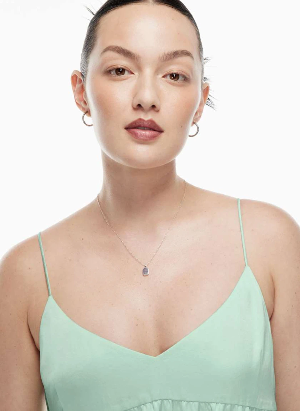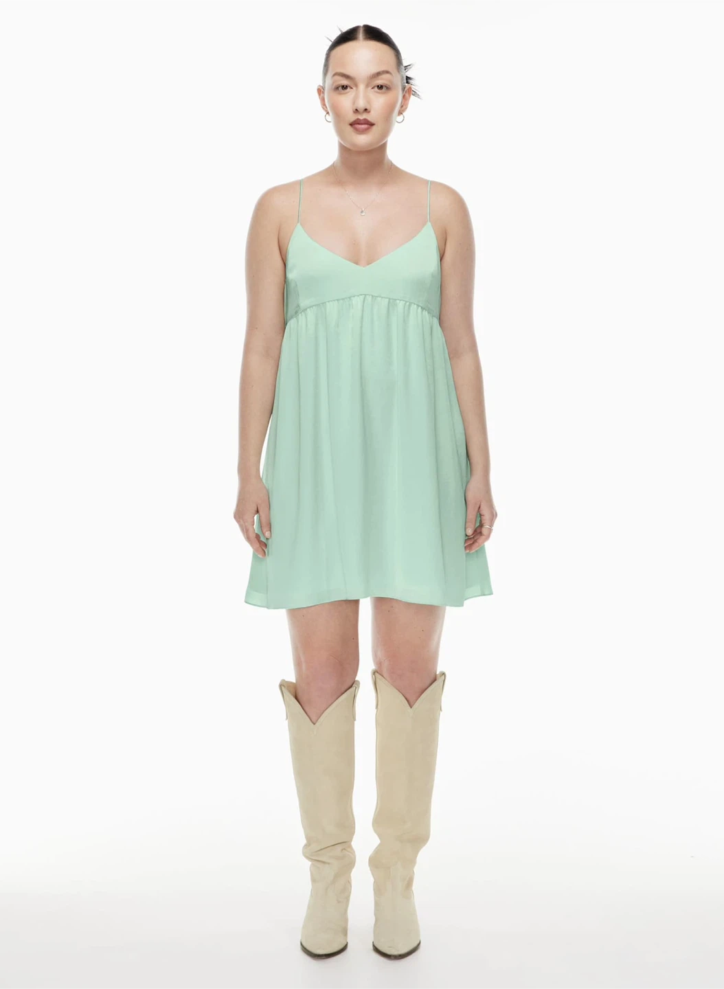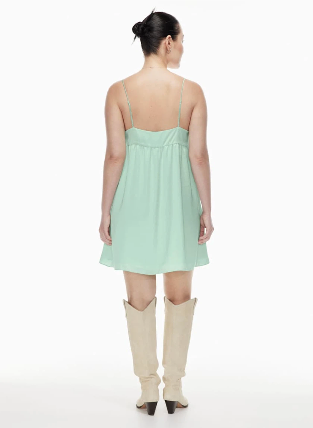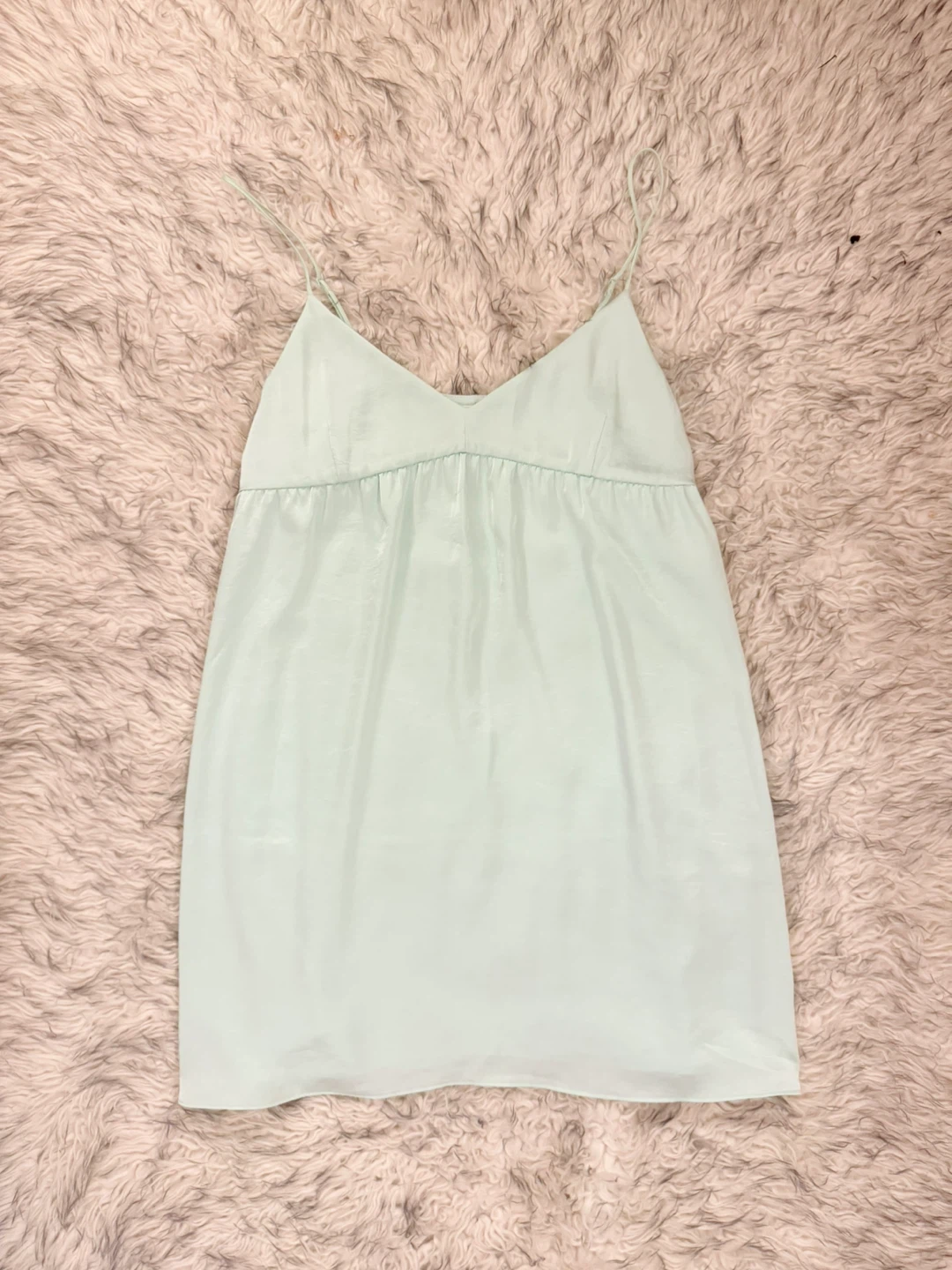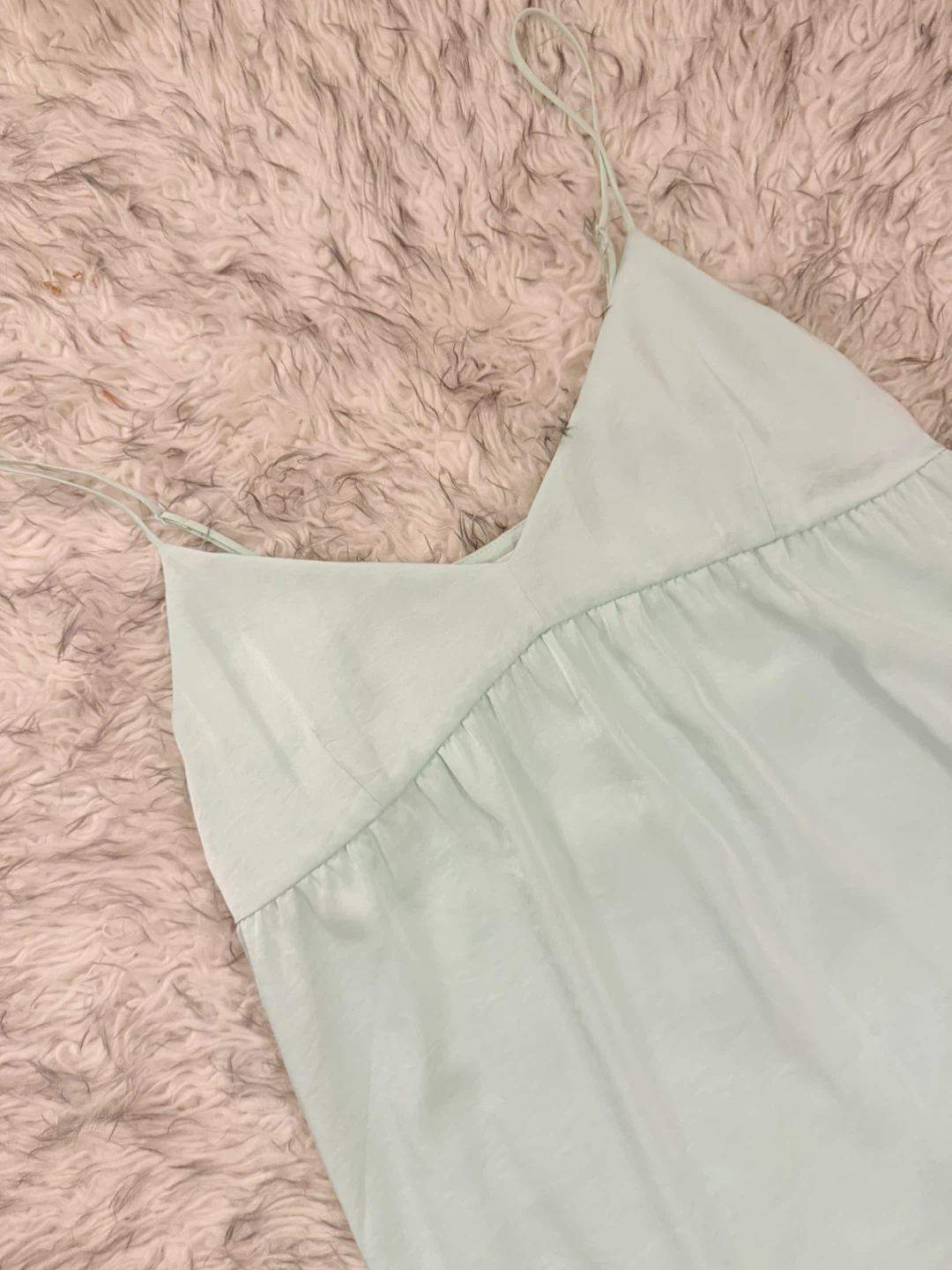 V-neck babydoll dress with adjustable straps, an empire waist and a darted bust for shaping. It's made from Effortless Satin™ — drapey, lightweight Japanese satin with a glossy look and feel. Worn once. Like new. No rips or stains. Size S.