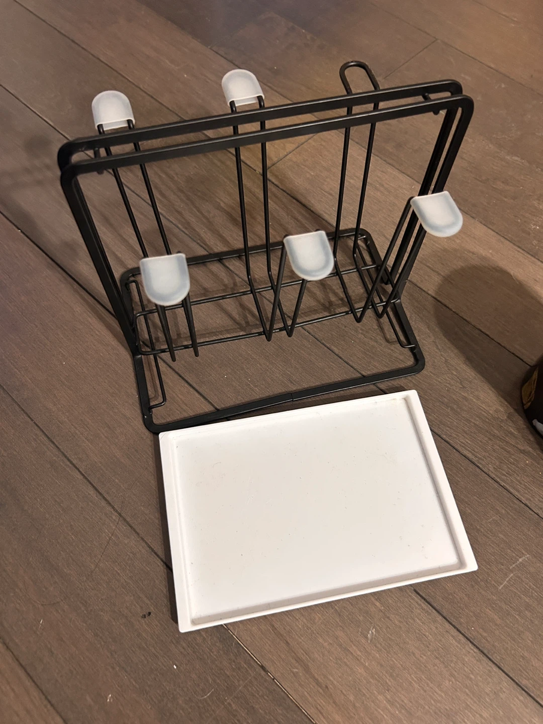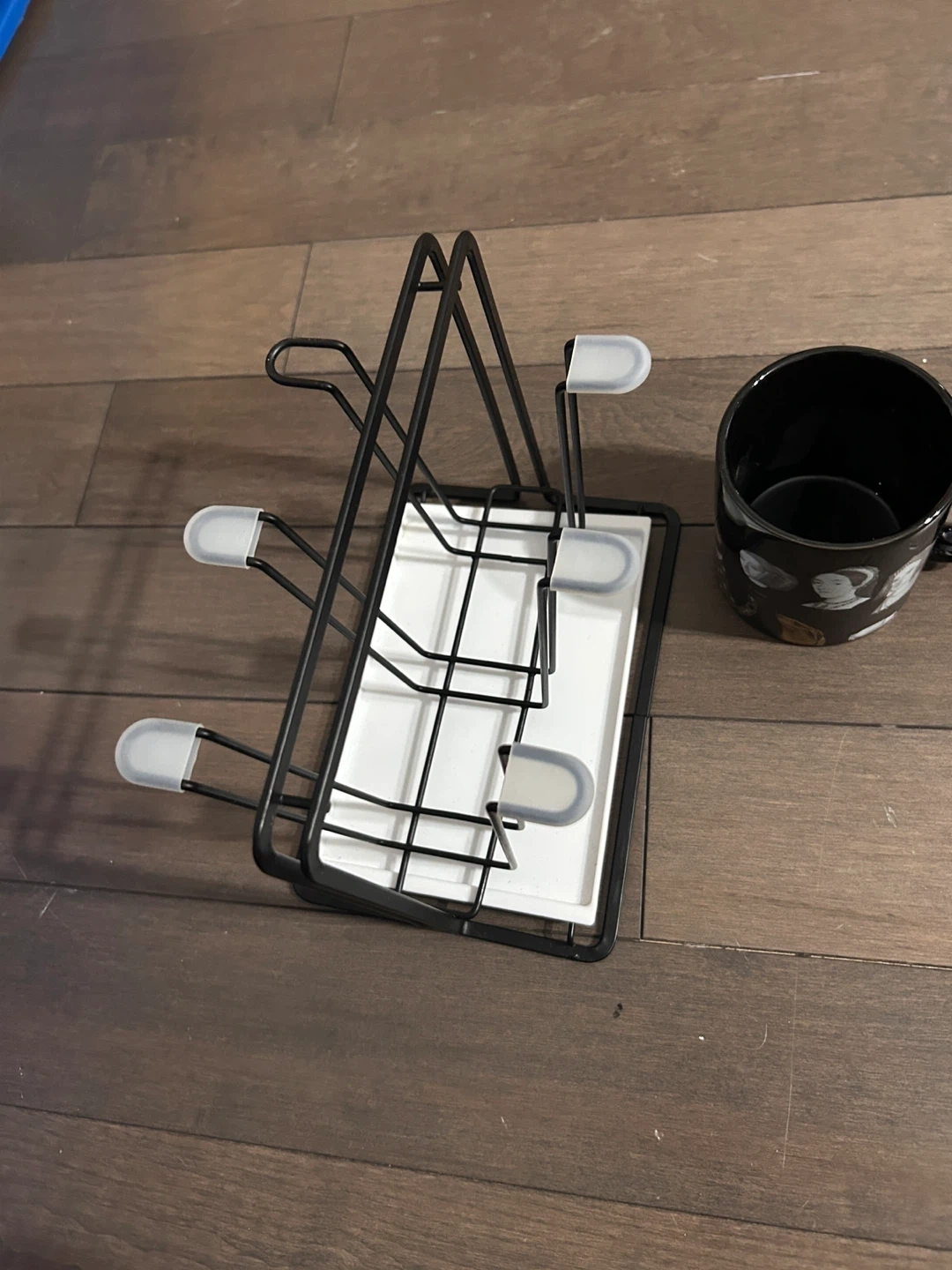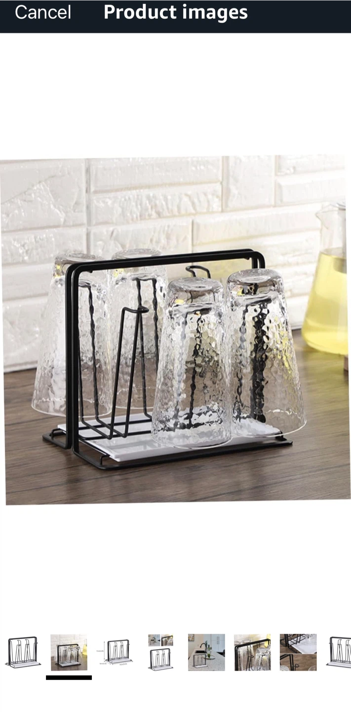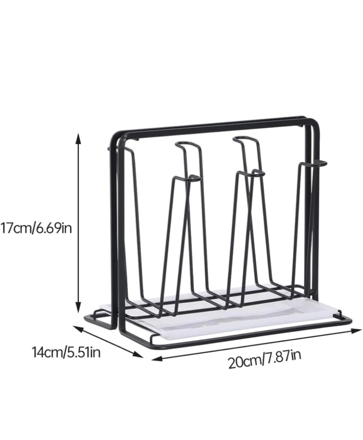 Selling a black metal drying rack for glasses or mugs. It's in great shape and measures approximately 17cm (6.69in) in height, 14cm (5.51in) in depth, and 20cm (7.87in) in width. Perfect for keeping your countertops tidy!