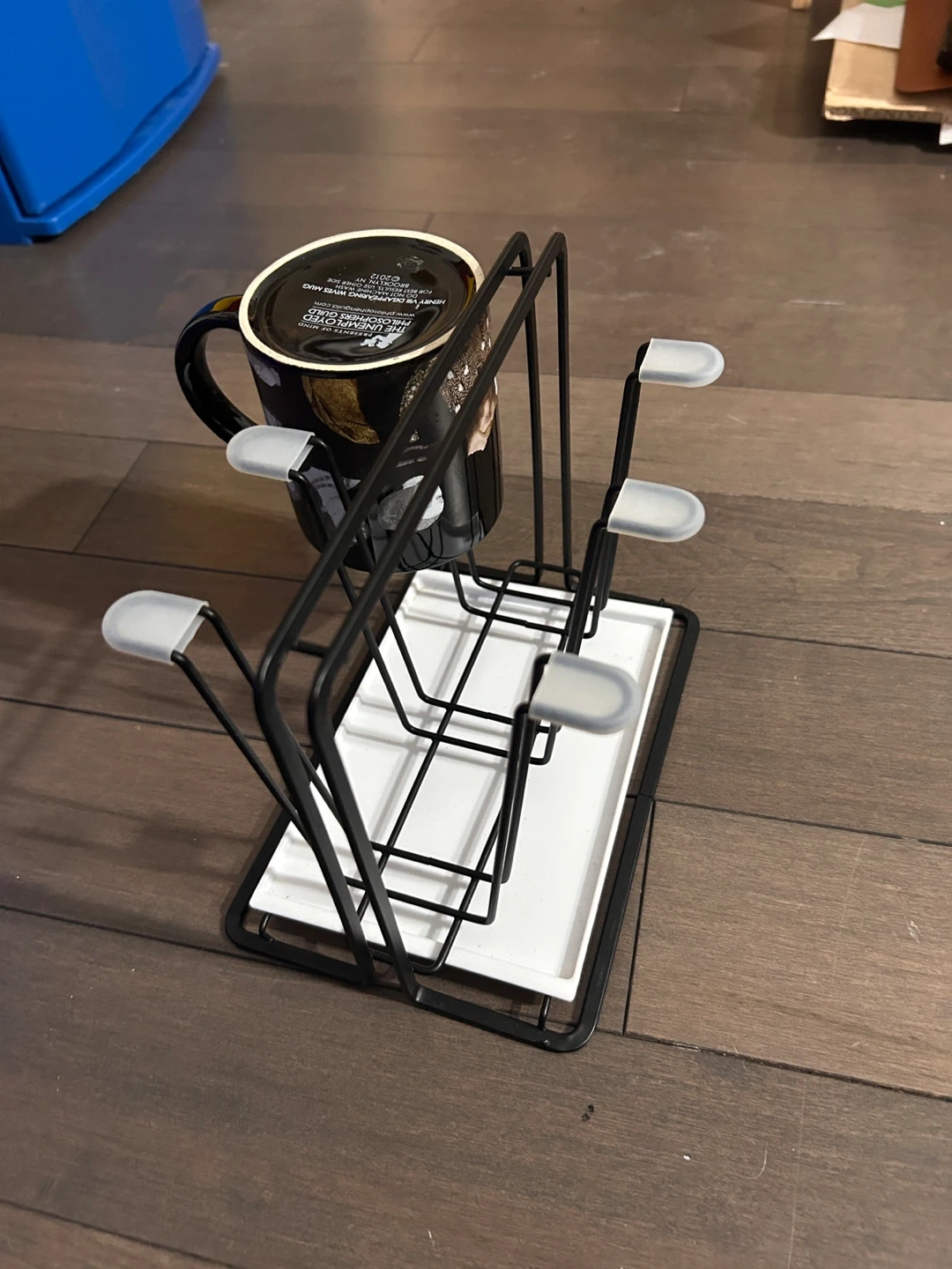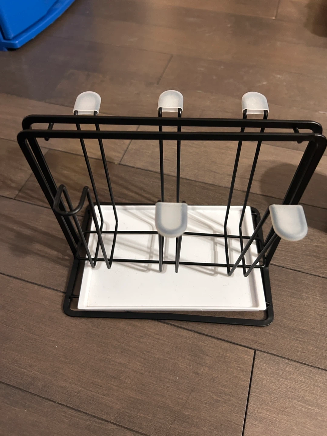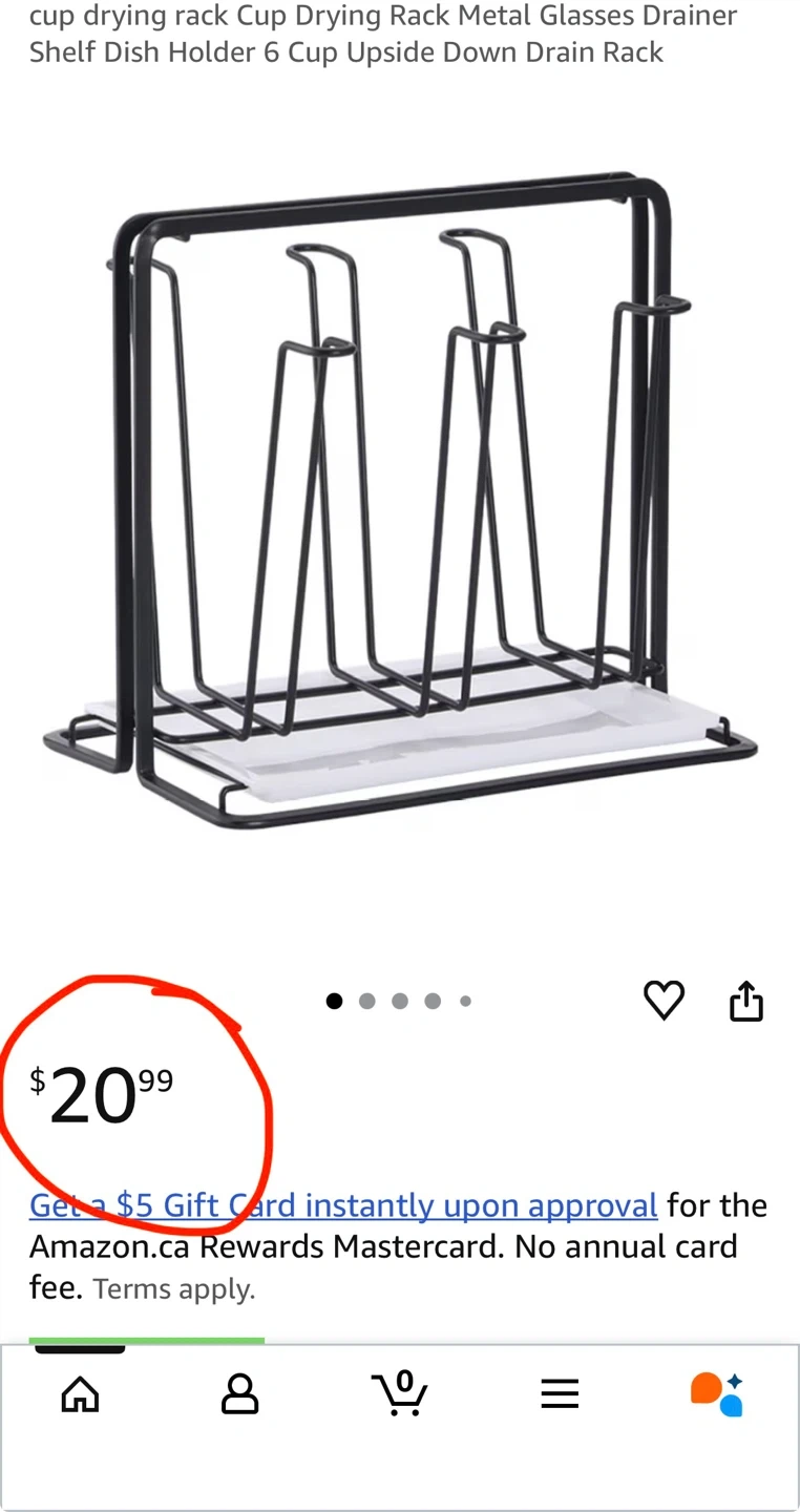 Selling a black metal drying rack for glasses or mugs. It's in great shape and measures approximately 17cm (6.69in) in height, 14cm (5.51in) in depth, and 20cm (7.87in) in width. Perfect for keeping your countertops tidy!