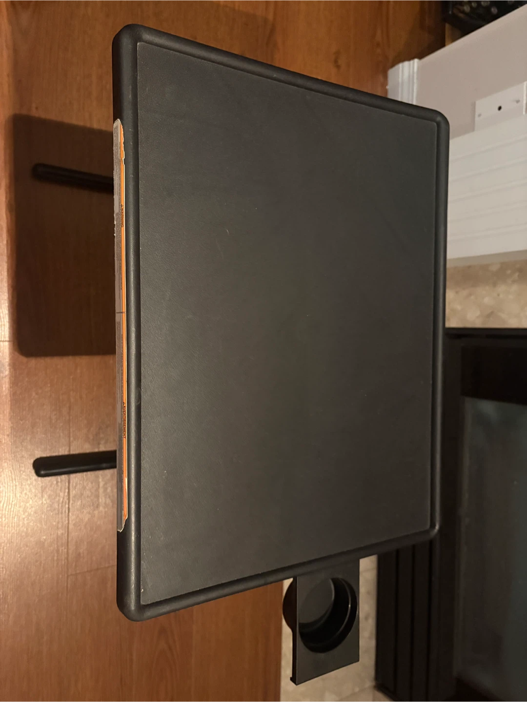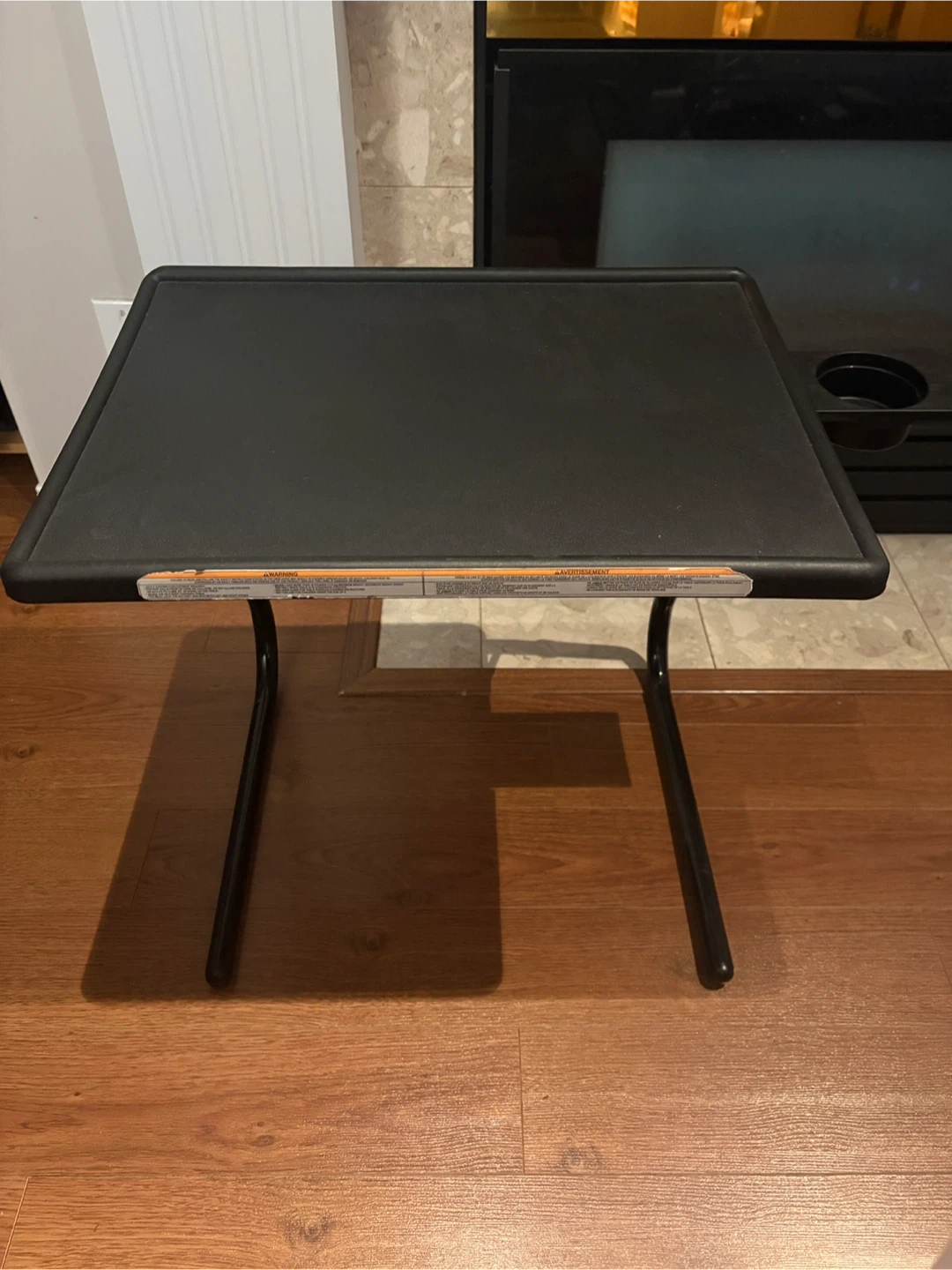 Selling two Table-Mate TV tray tables. They adjust from 22”-29” high. They have a hide-away cup holder and fold flat. The table top can adjust to three different angles.