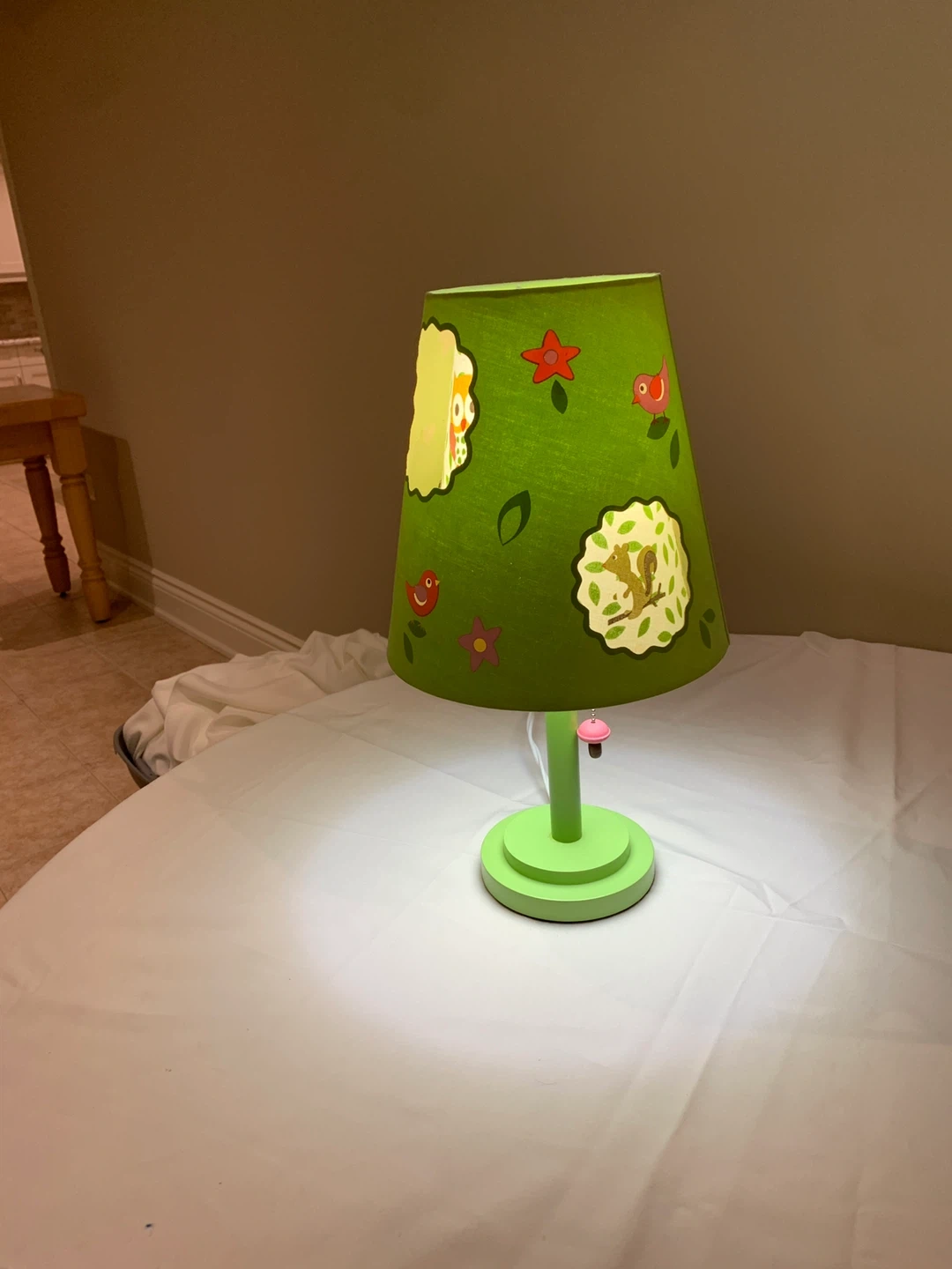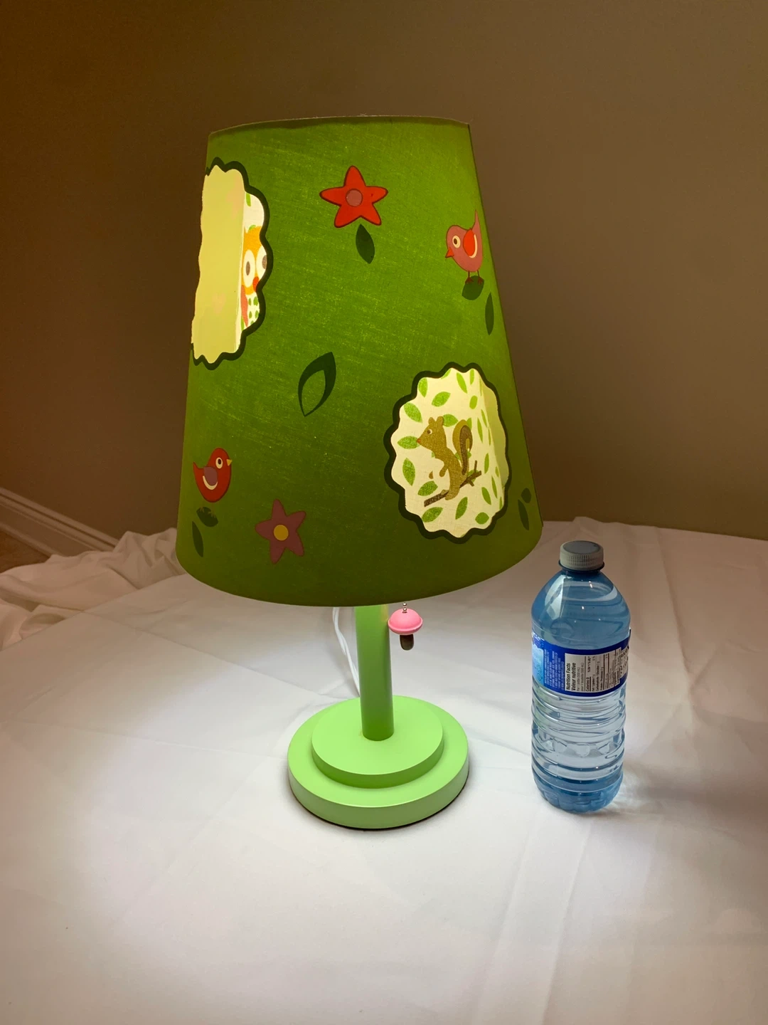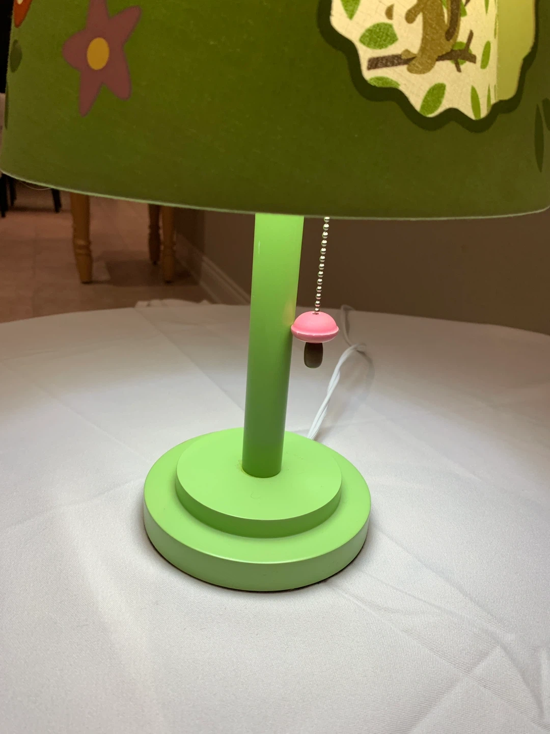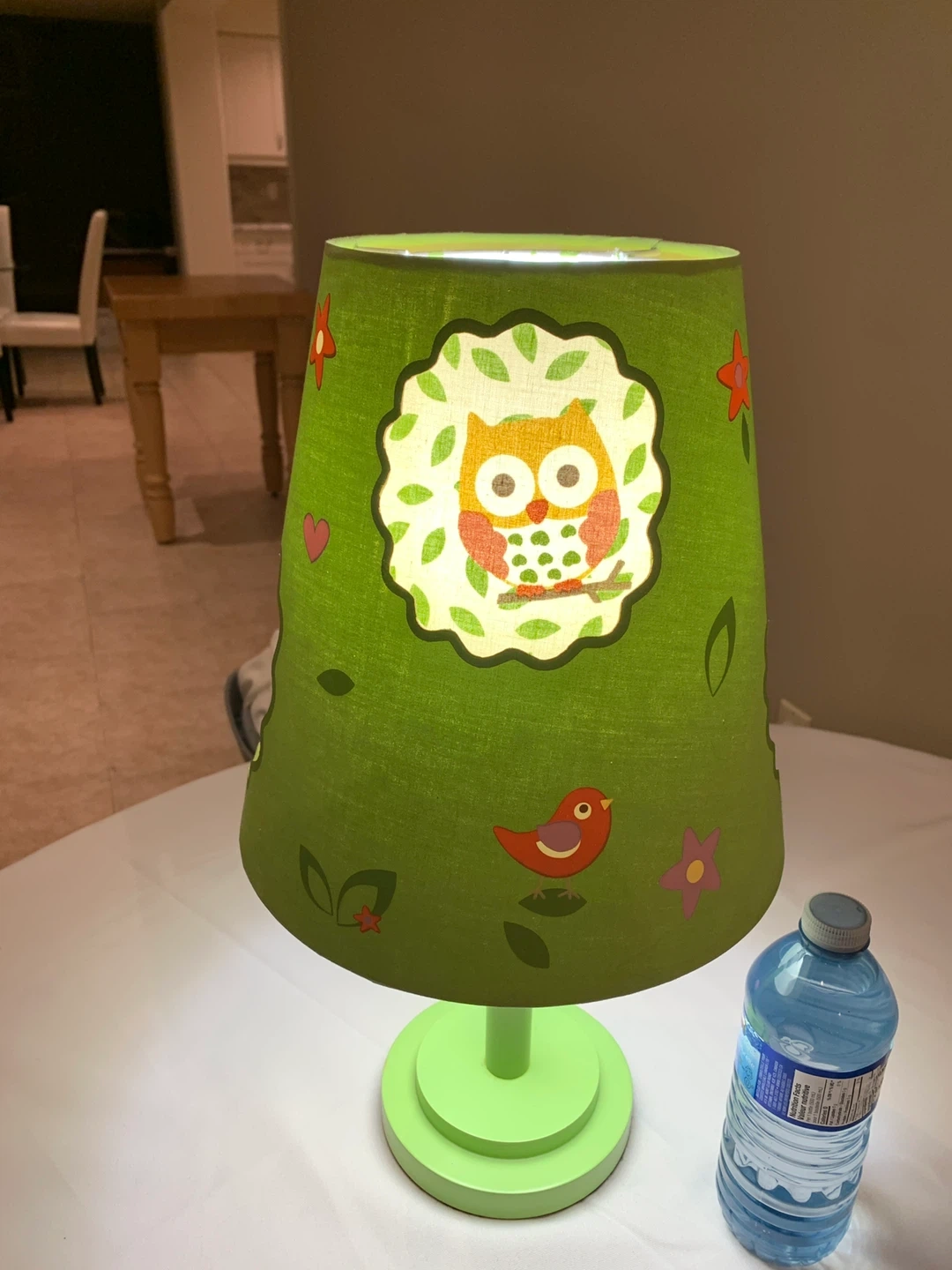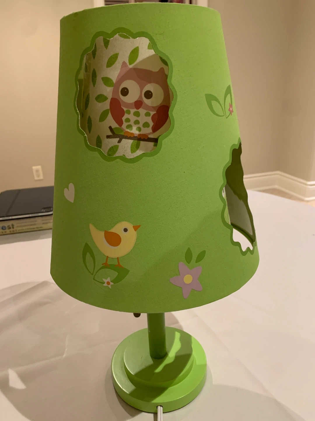 A cute green table lamp, perfect for a kid's room! It features an adorable owl and bird design, adding a touch of whimsy to any space