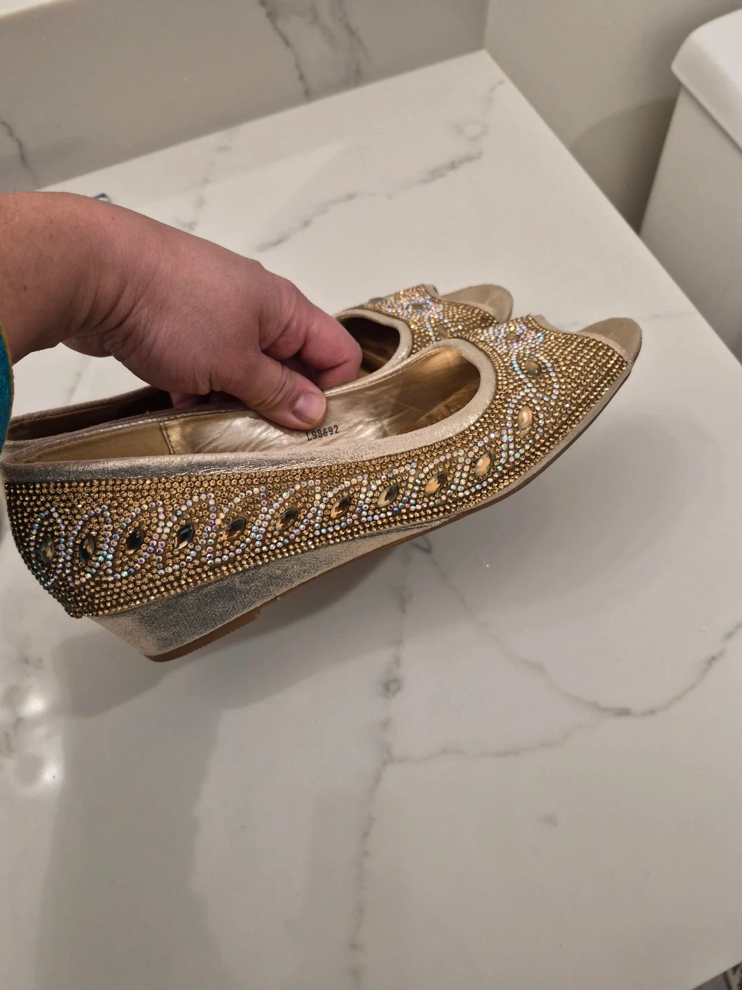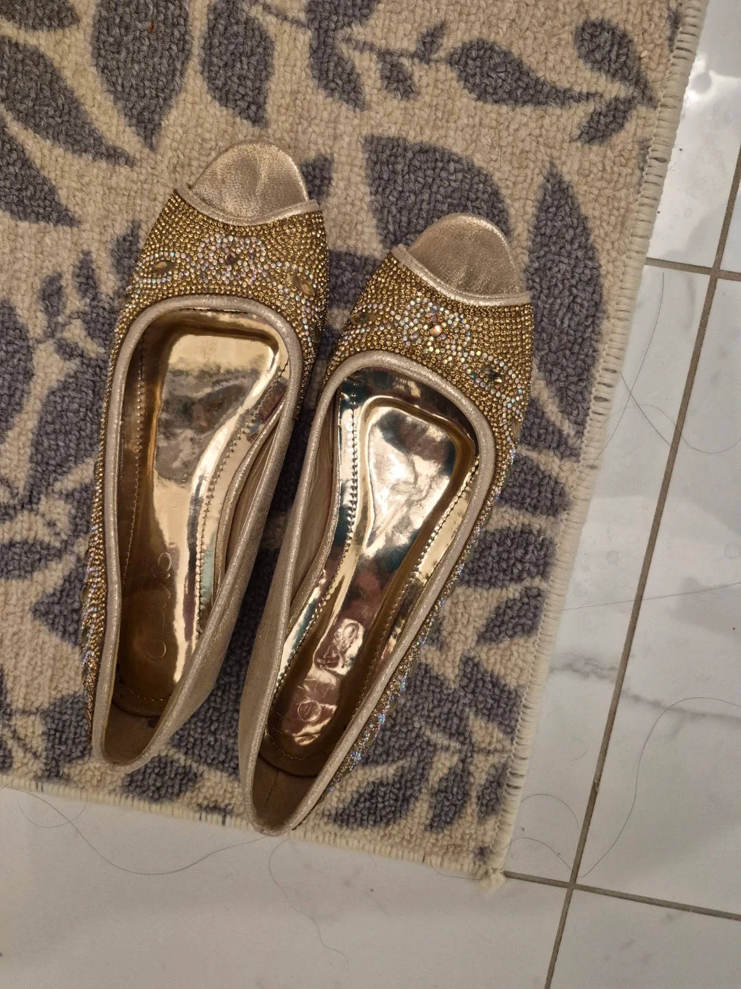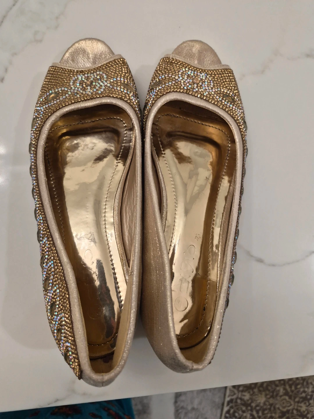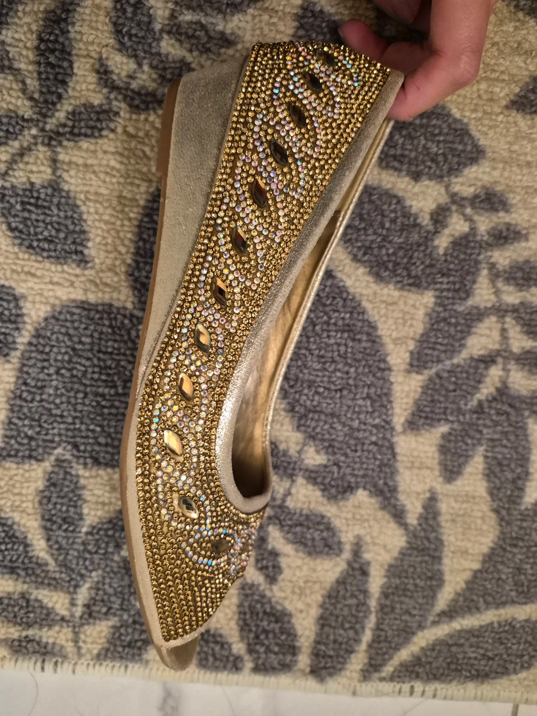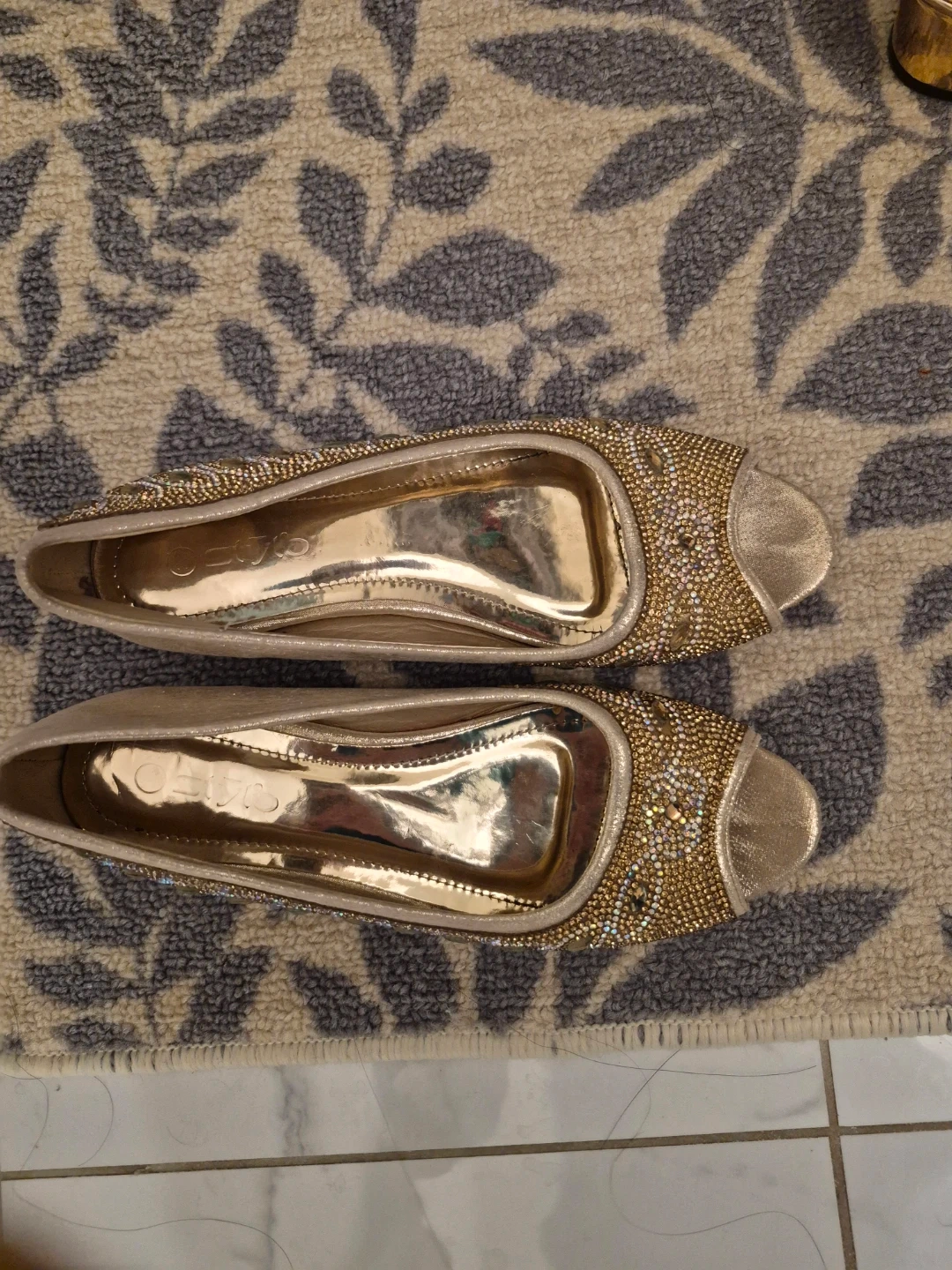 These gold flats are so sparkly and fun! They are embellished with rhinestones and beads. Size 8.used very less.