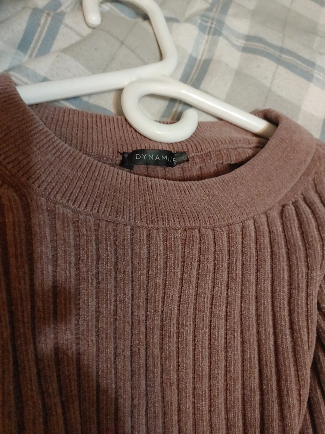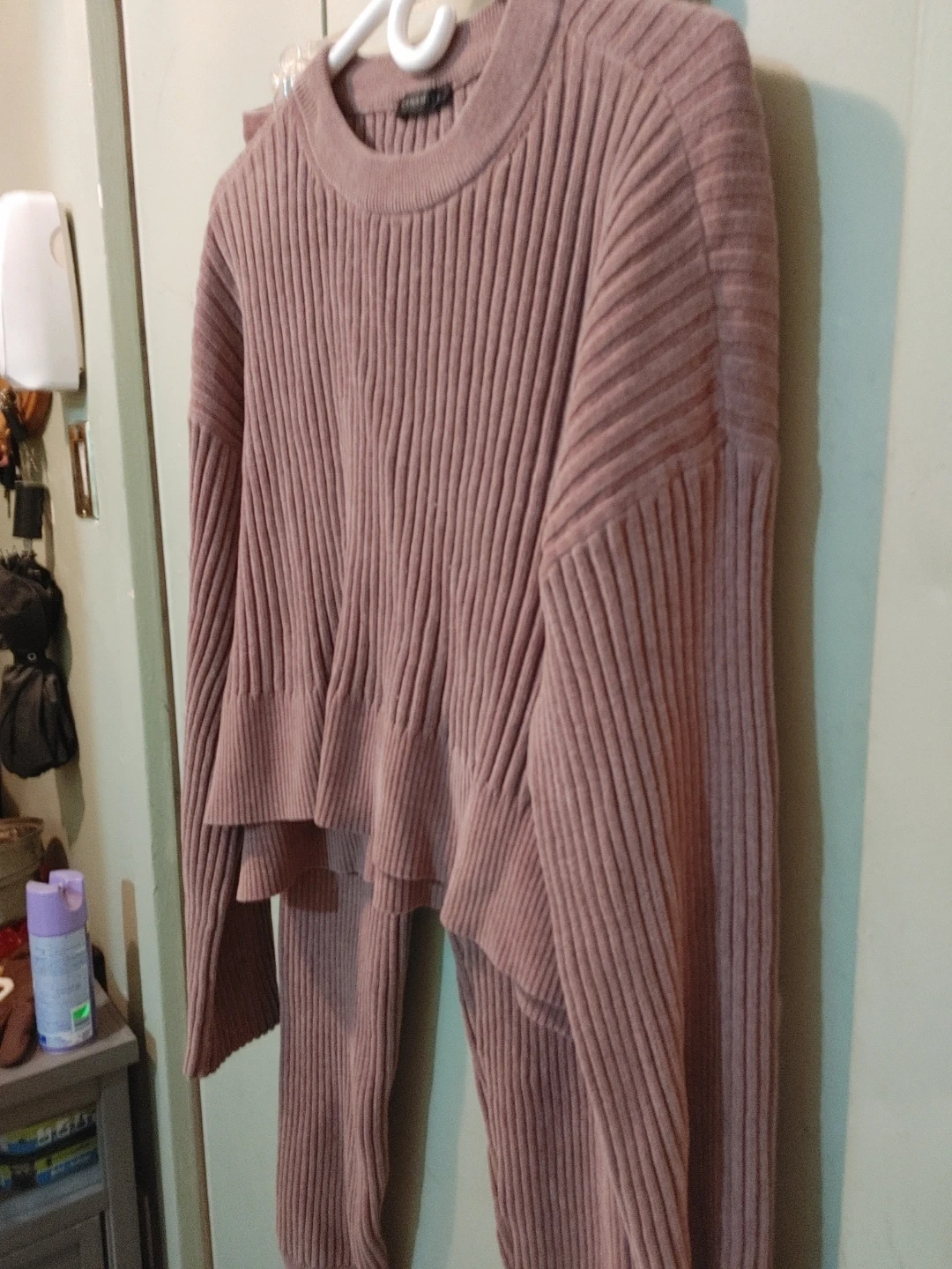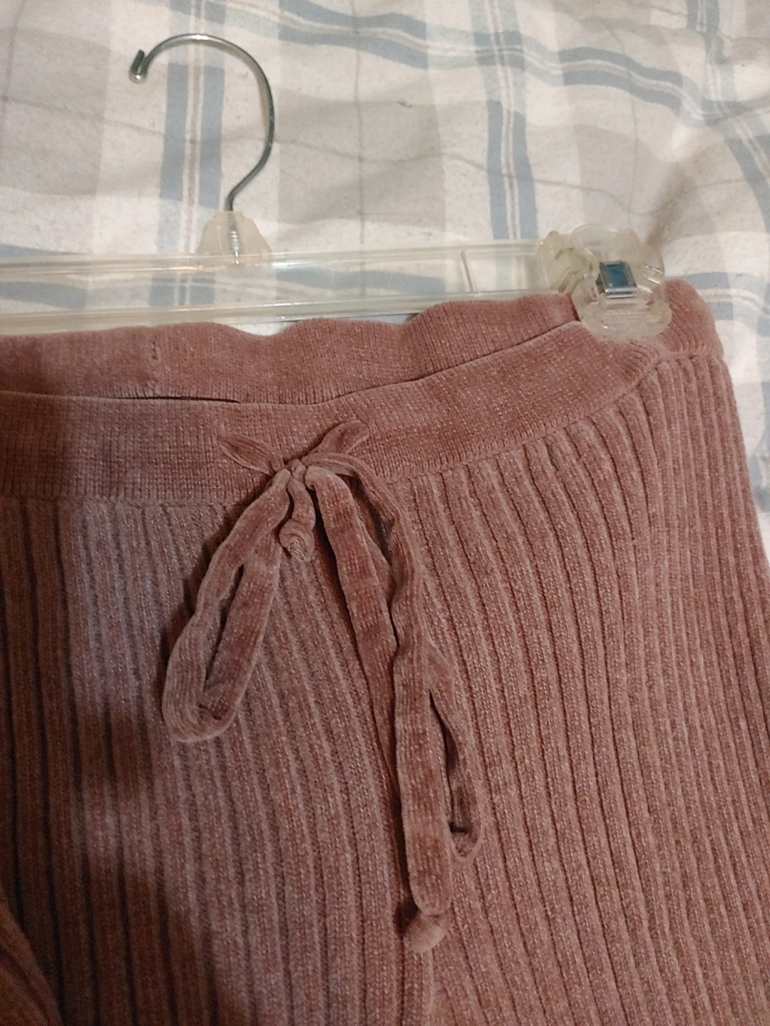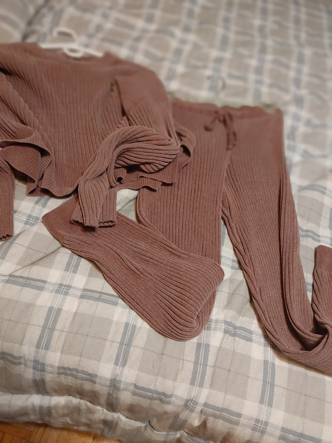 Cozy up in this Dynamite ribbed knit lounge set! The set includes a long-sleeved top and pants with a drawstring waist. Perfect for relaxing at home or running errands in style. The colour is a lovely brown