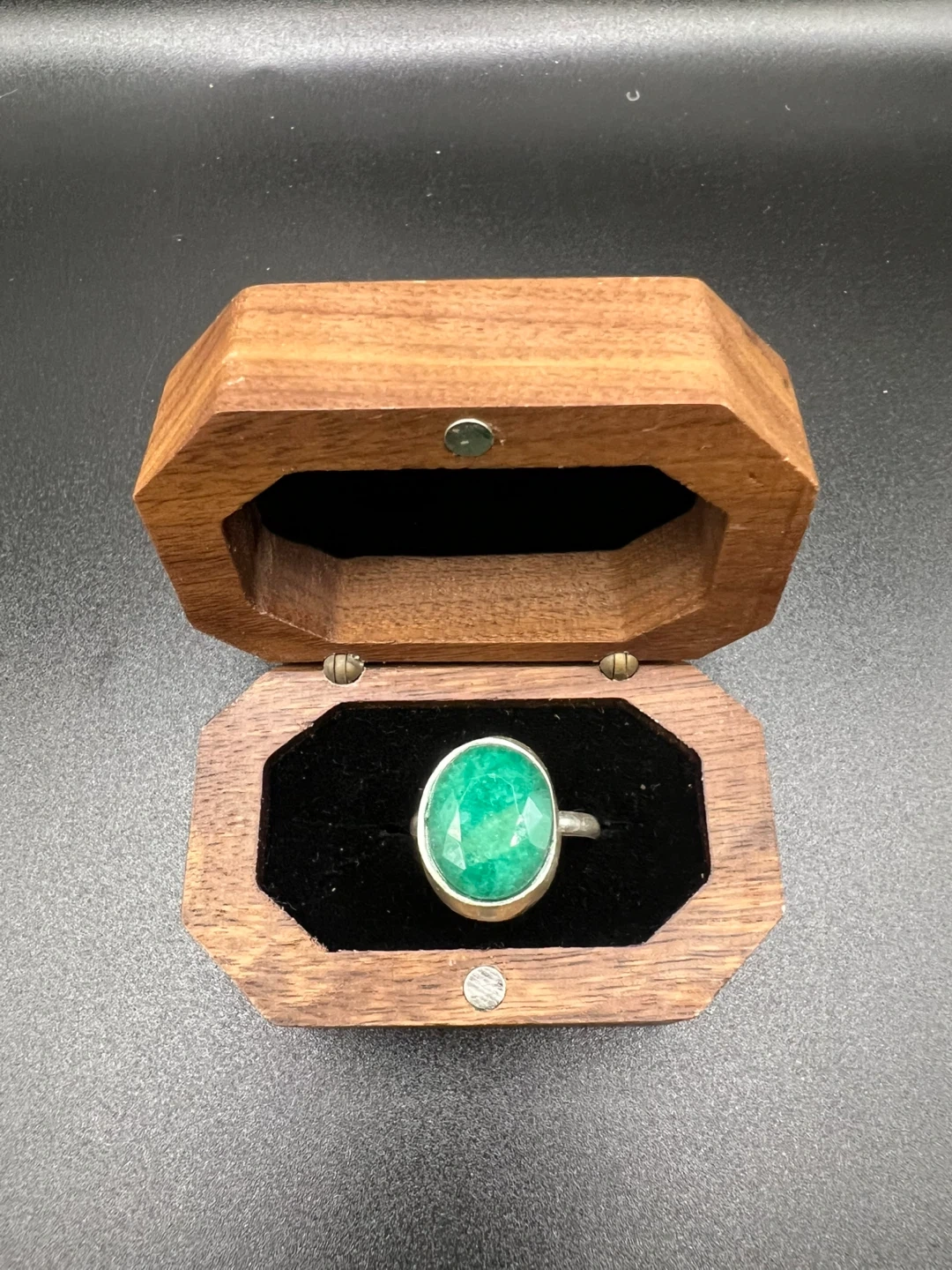 Selling a beautiful emerald ring. The stone is a natural emerald with an oval cut. It weighs 8.75 carats and has AA clarity, described as Naturally Included. The color grade is green with strong saturation. The appraisal certificate estimates a retail replacement value of $8,750.00 Canadian dollars