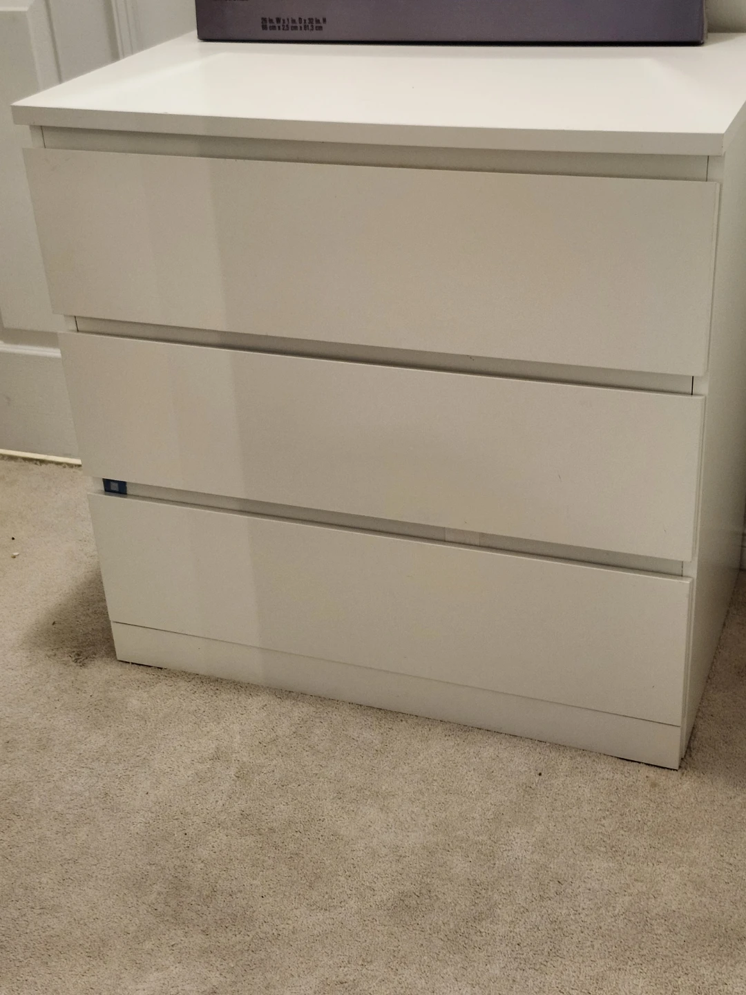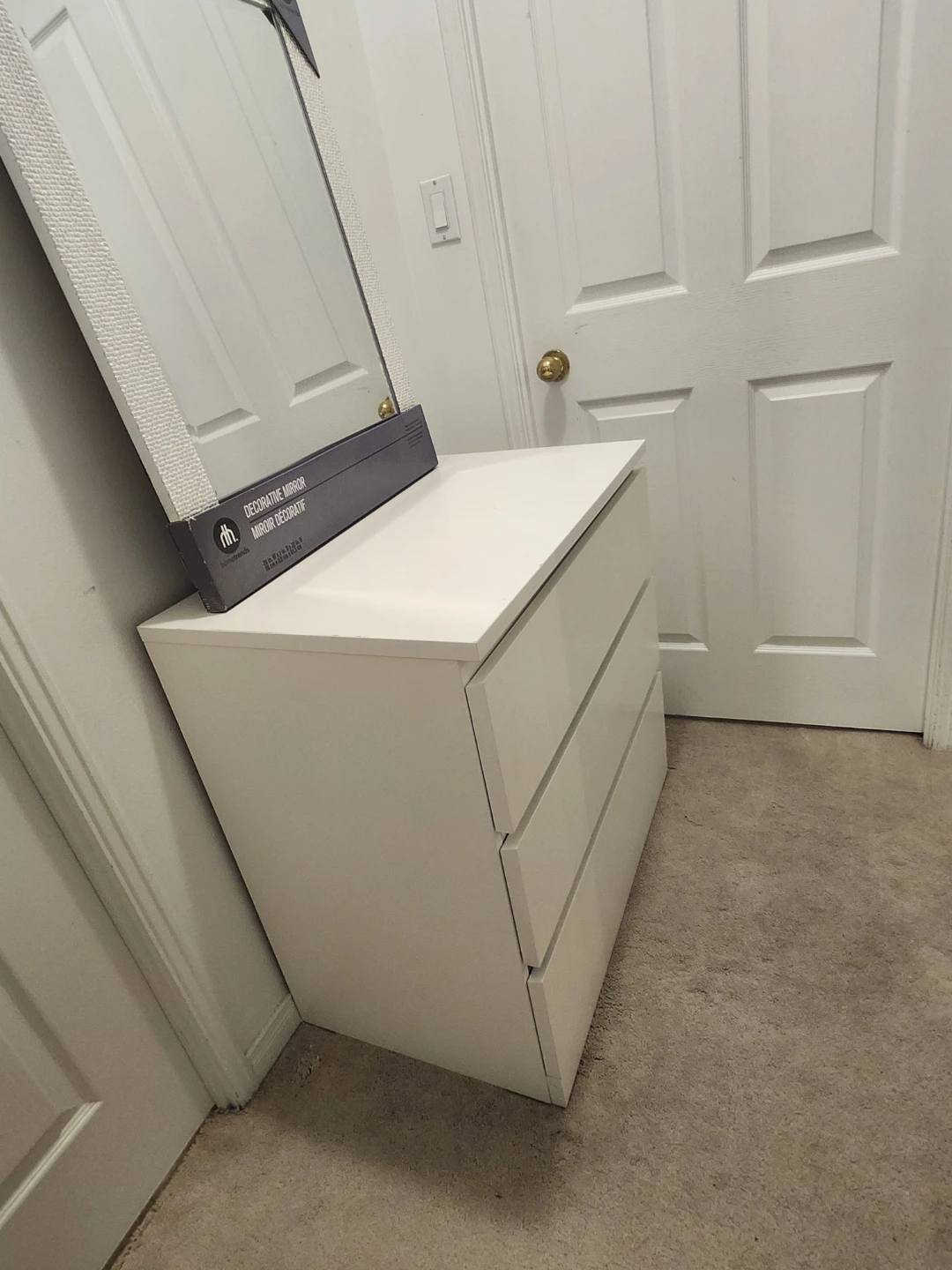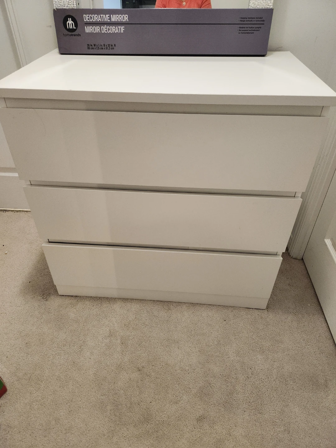 Selling a white 3-drawer dresser. It's in great shape and ready for a new home. Perfect for adding storage to any room