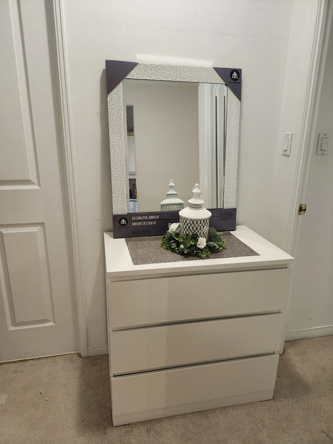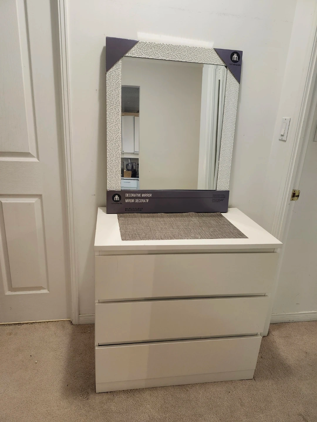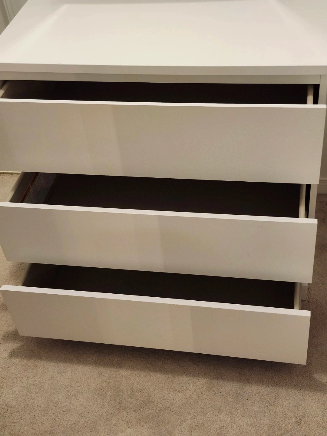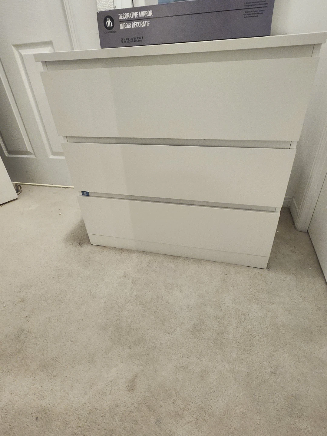 Selling a white 3-drawer dresser. It's in great shape and ready for a new home. Perfect for adding storage to any room