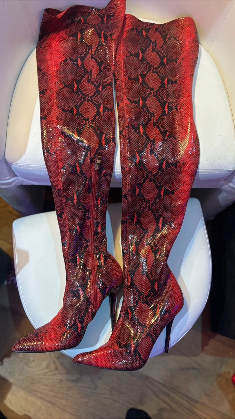 These striking red snakeskin over-the-knee boots are sure to turn heads! They feature a bold snakeskin pattern and a sleek stiletto heel. Perfect for adding a touch of edgy glamour to any outfit