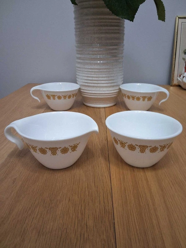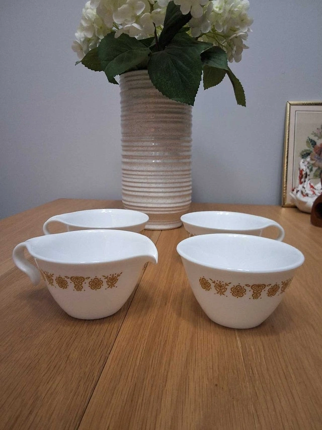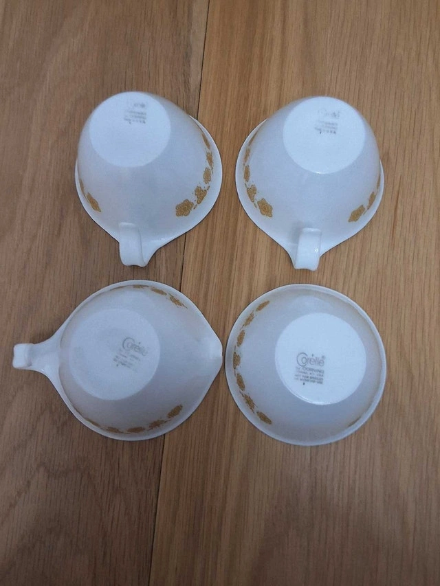 Corelle by Corning Butterfly Gold hook handle creamer and sugar bowl set with two coffee cups. Excellent condition, no chips or cracks. See our other ads.