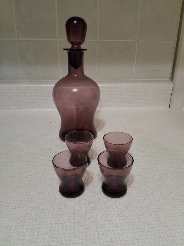 Vintage amethyst purple glass decanter and four glasses. Decanter has imperfection in the glass near the top (no cracks) - see third photo. See our other ads.