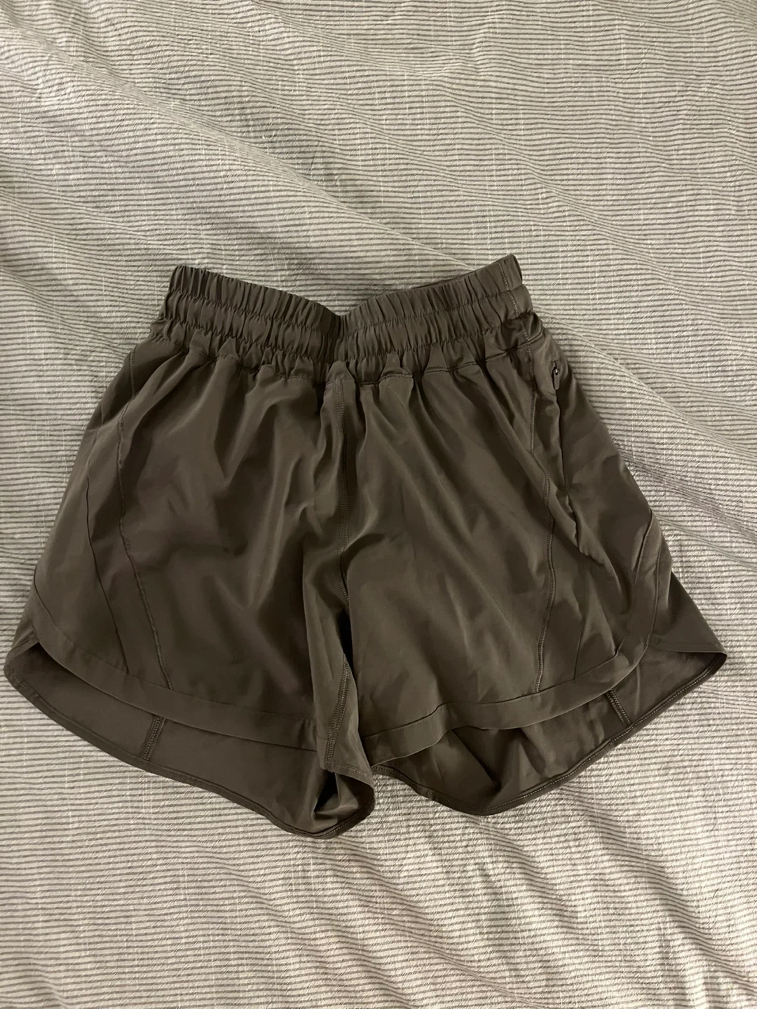 Selling a pair of Lululemon high rise lined shorts in an olive green colour. These are a size 6 (size small - fits 26-27 inch waist). In like new condition (worn less than 5 times). Perfect for running or just lounging around.