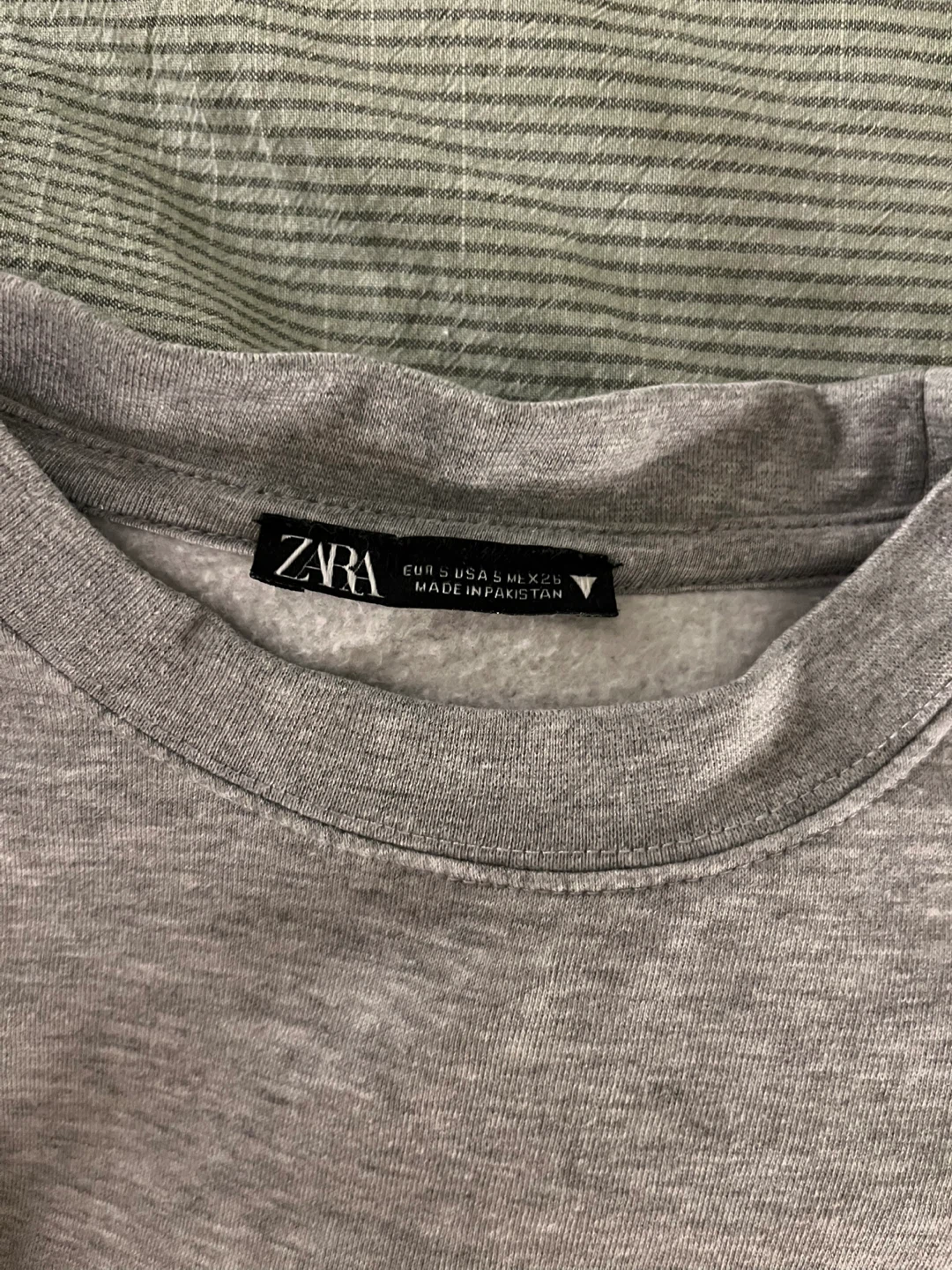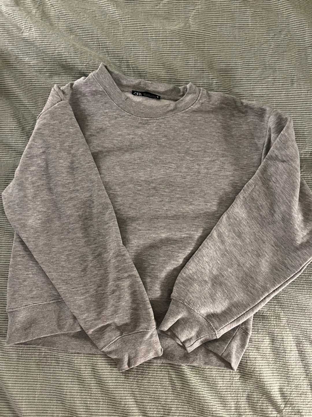 Selling a comfy grey cropped sweatshirt from Zara, perfect for layering or lounging! It's a size small and in great condition. The material is soft and cozy.