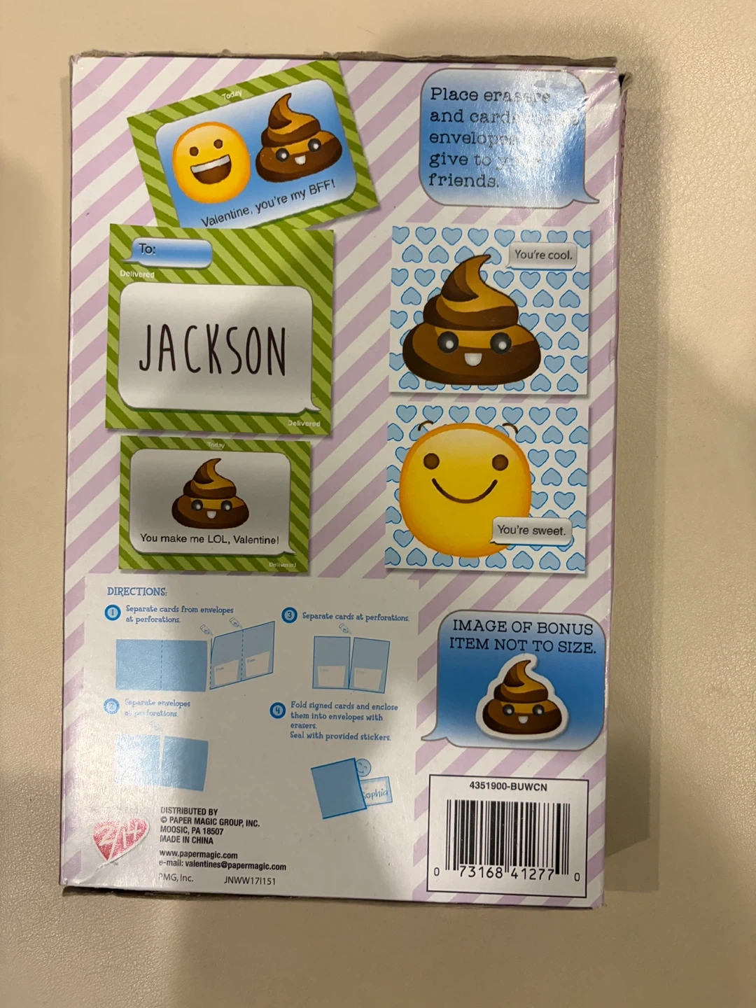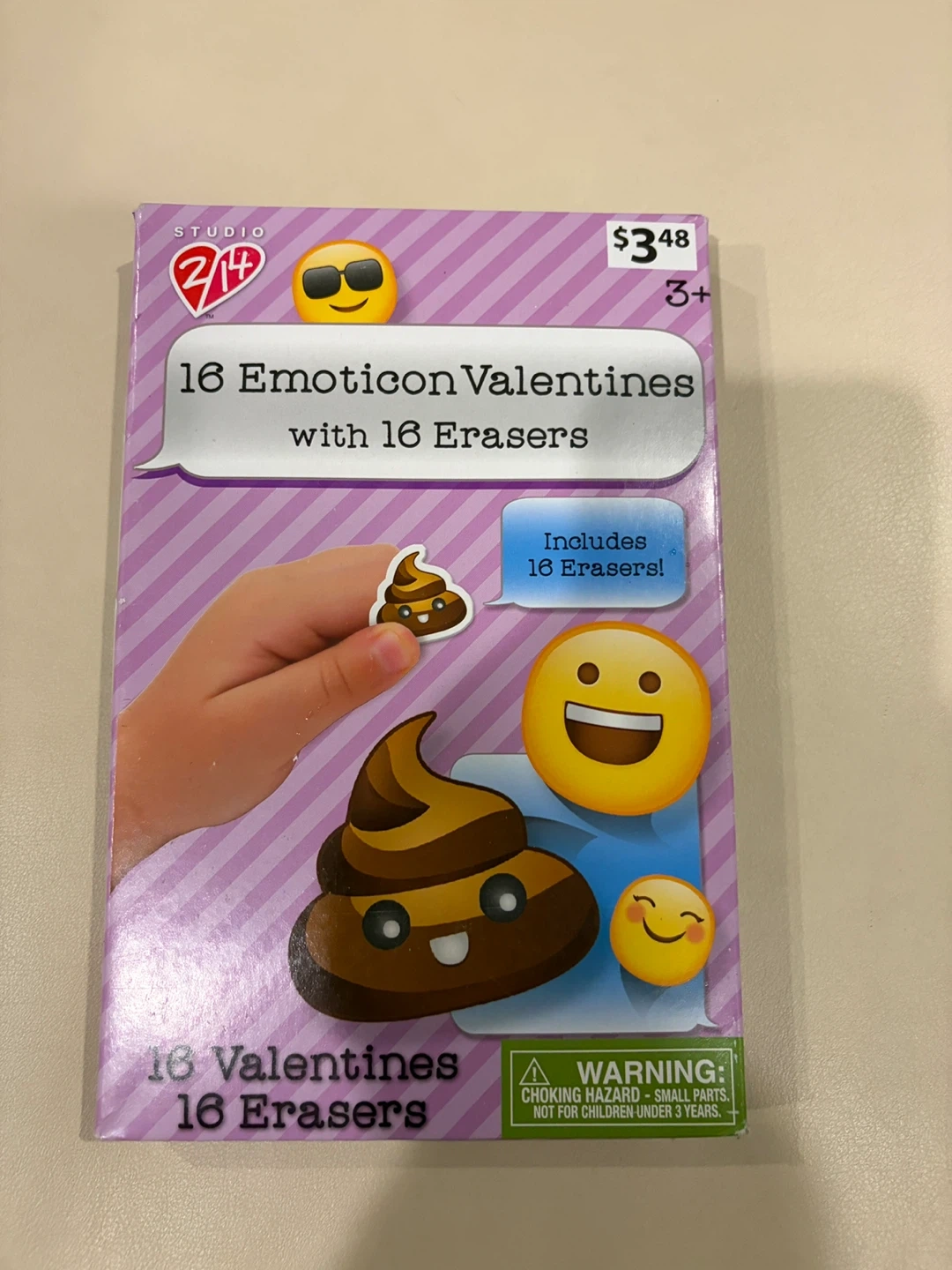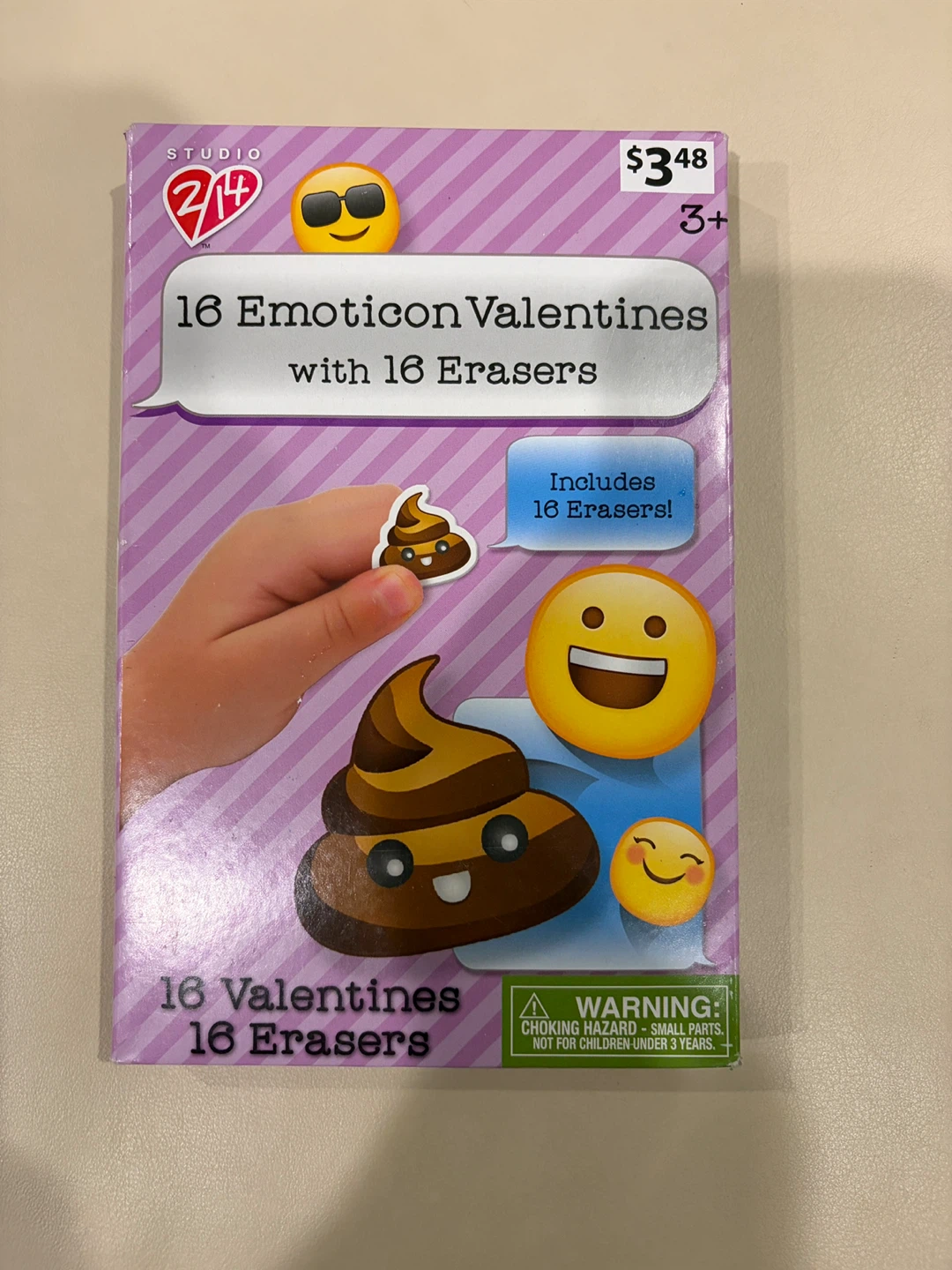 Selling a pack of Studio 2/14 Emoticon Valentines with 16 erasers. It is suitable for ages 3+. Each pack includes 16 valentines and 16 erasers