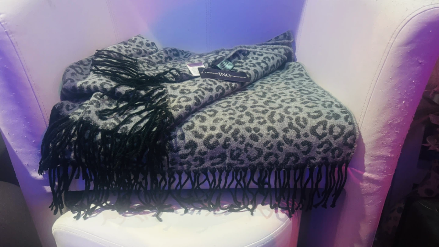Keep cozy with this INC International Concepts throw blanket! It has a stylish grey leopard print and fringe. Originally bought for $59.99, it's in great condition and ready to add a touch of flair to your home