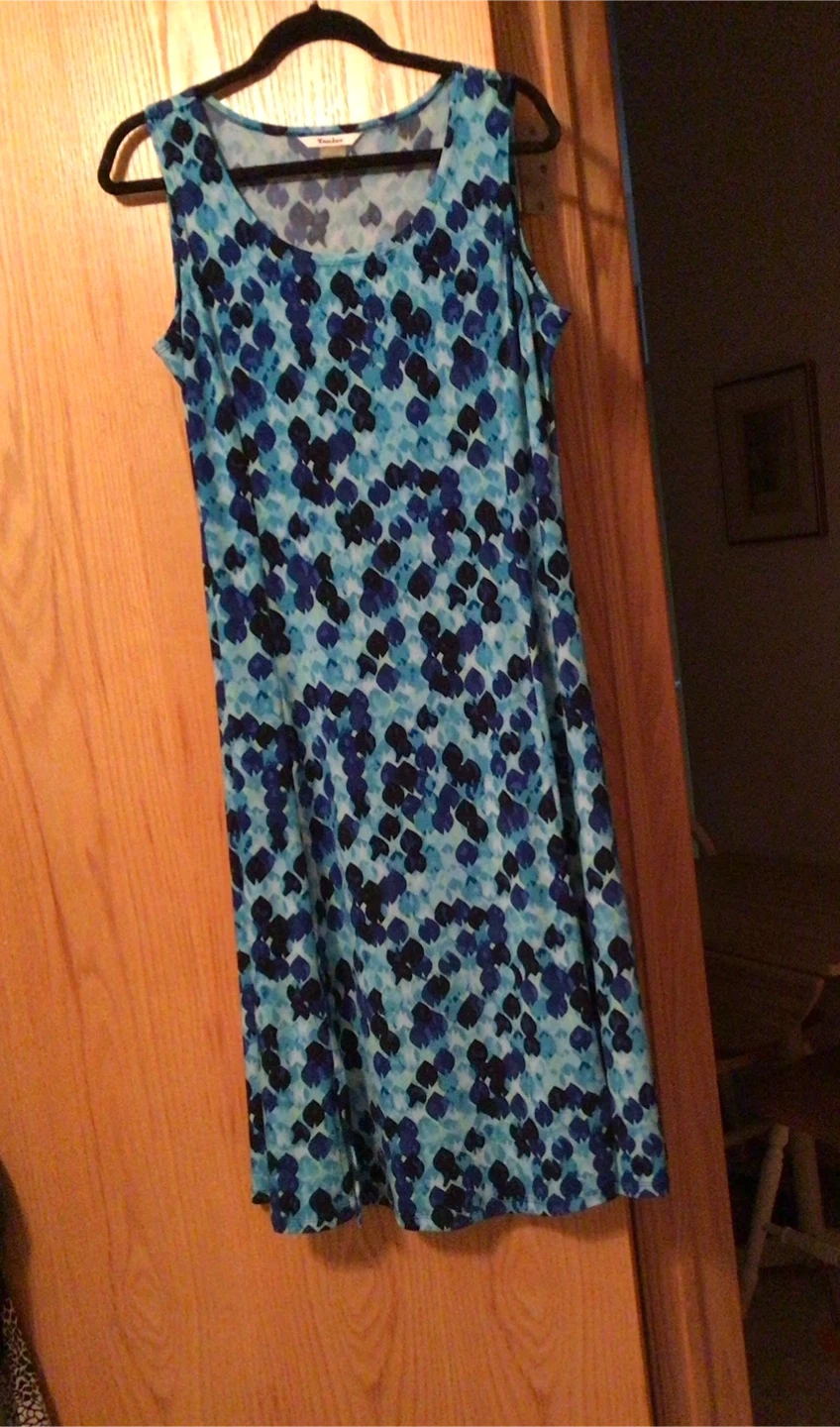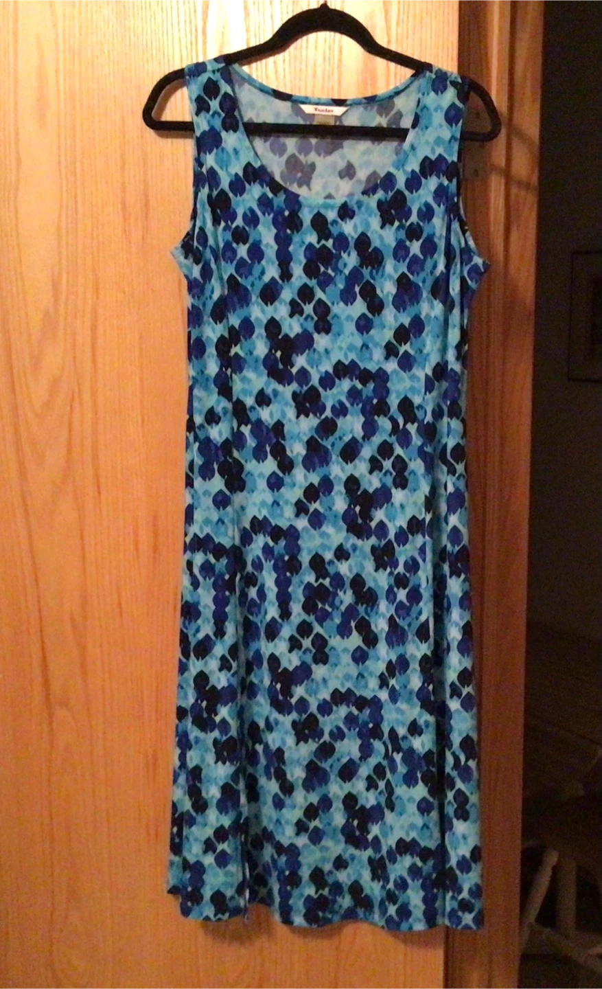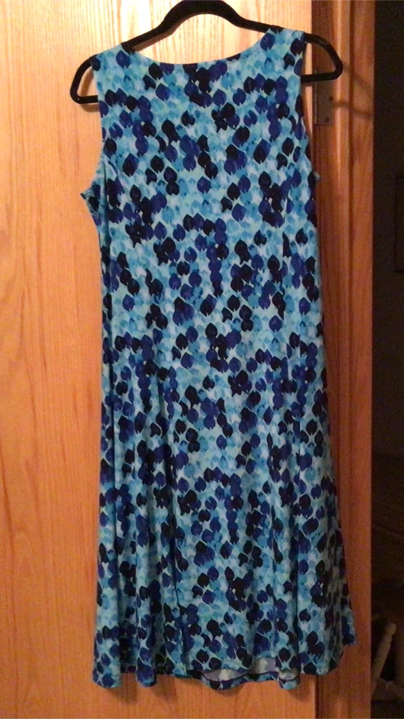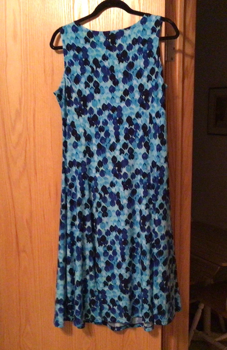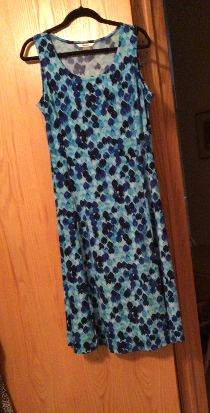 Here's a lovely dress with a blue pattern. It's sleeveless and perfect for warmer weather