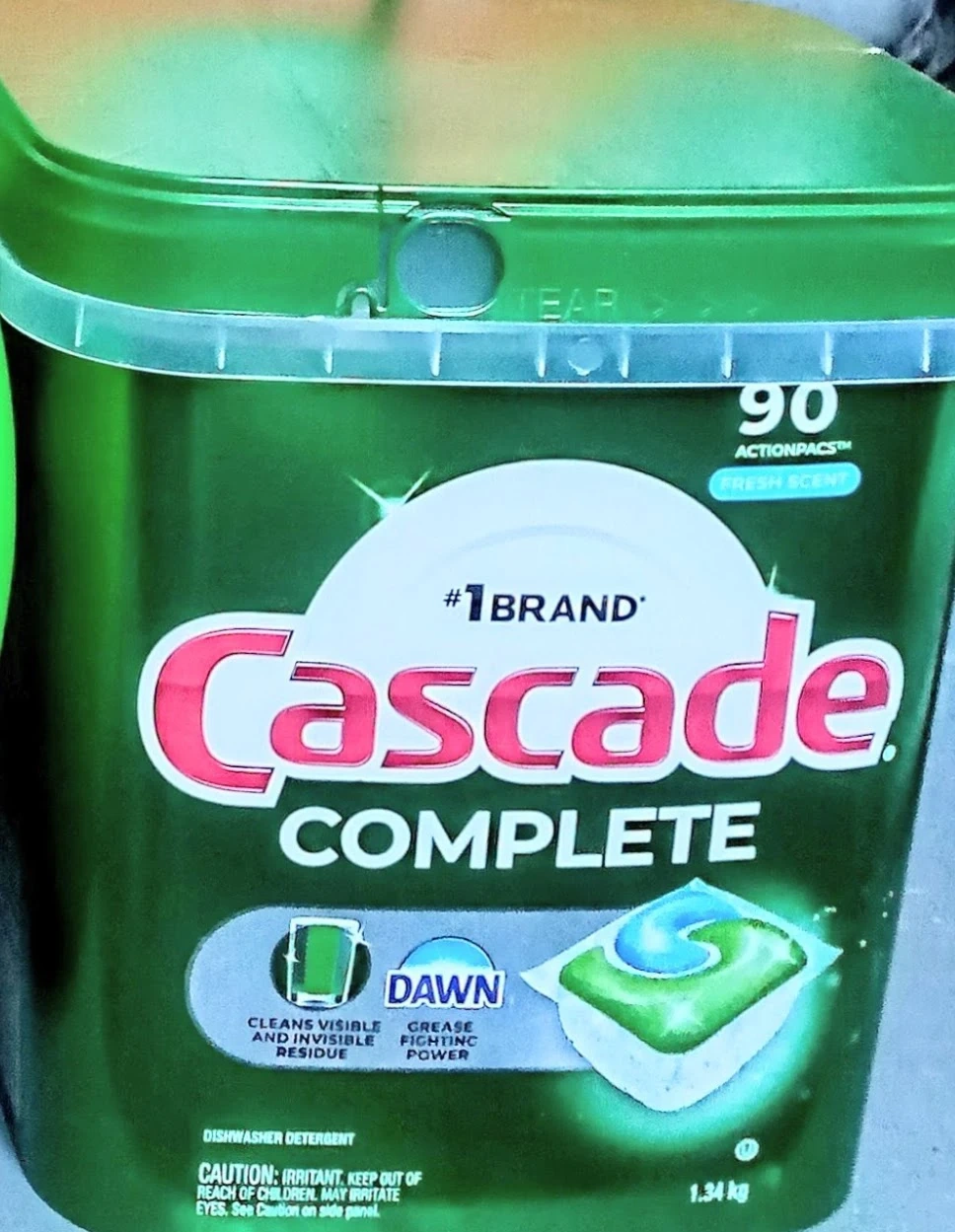 Selling a container of Cascade Complete dishwasher detergent pacs. This container has is only missing two pieces Actionpacs with a fresh scent. They clean visible and invisible residue and have Dawn grease-fighting power!