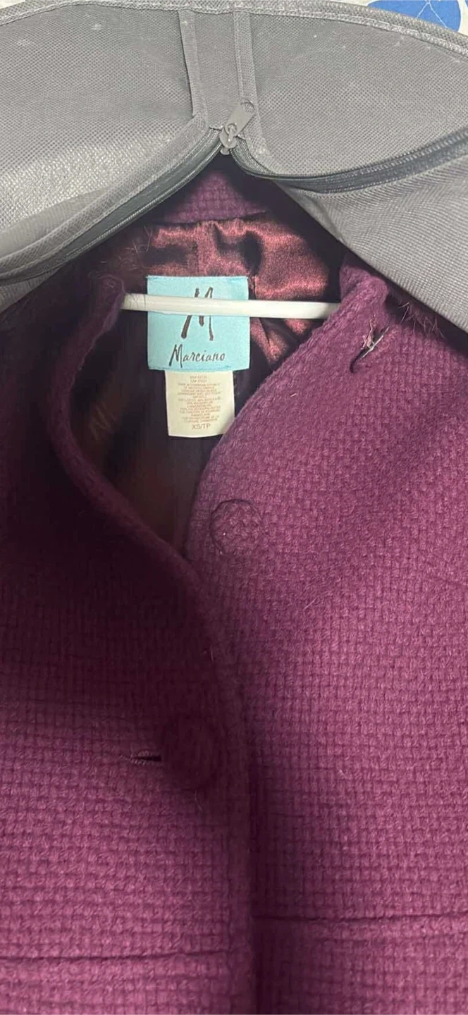 Selling a stylish Marciano purple wool coat in size XS/TP! It features a beautiful fur collar and is in great condition. Perfect for staying warm and fashionable this winter! Pick up cash only