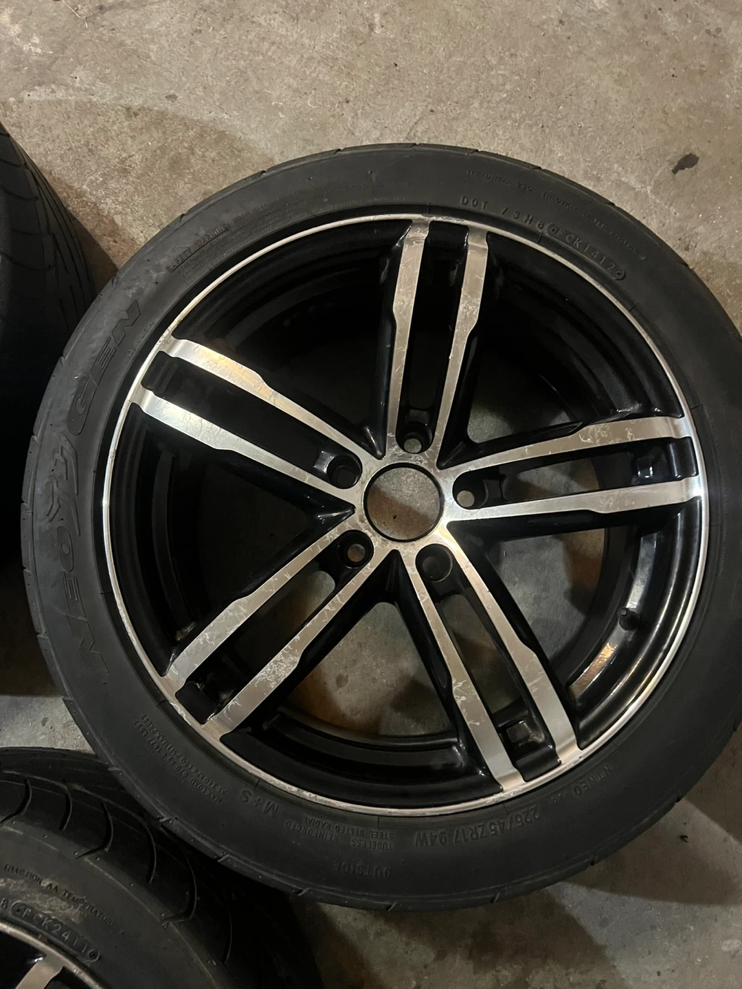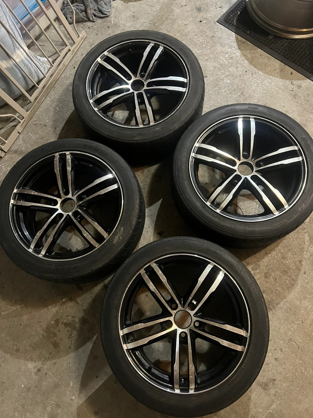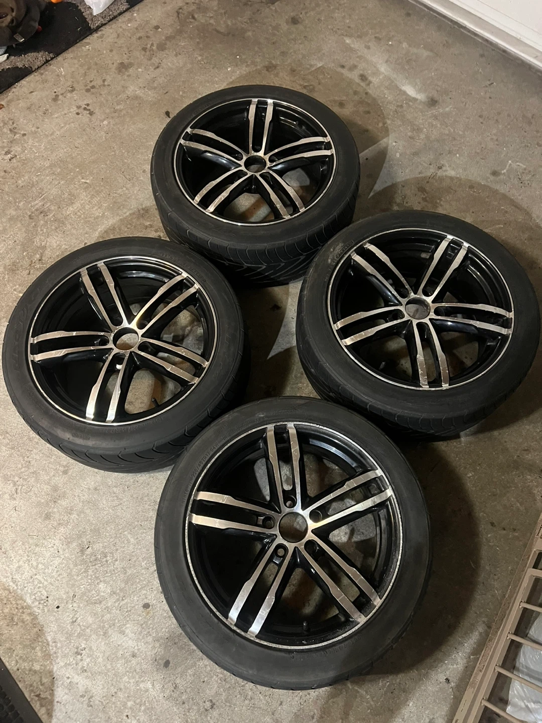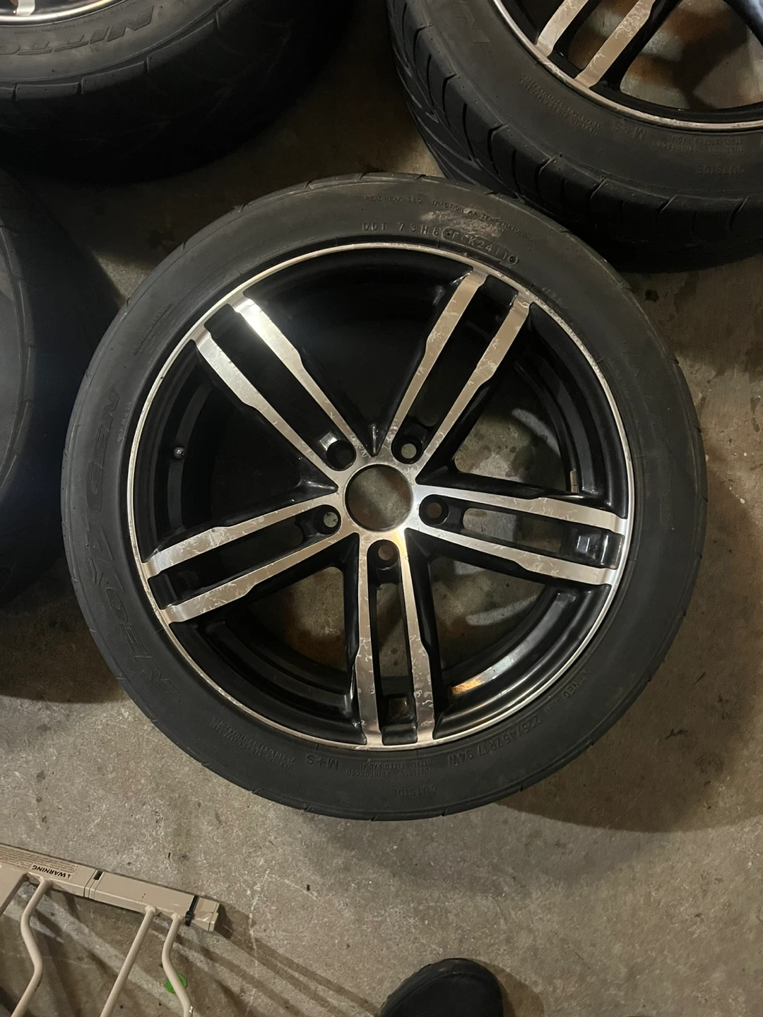 Selling this bmw style rims that fit Toyota,honda mazda,Kia, these are 5x114.3 aftermarket tires are shot and need replacing price is for the rims no cracks to bends some scratches as seen in the pictures.
