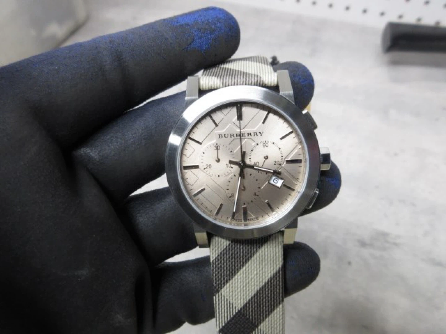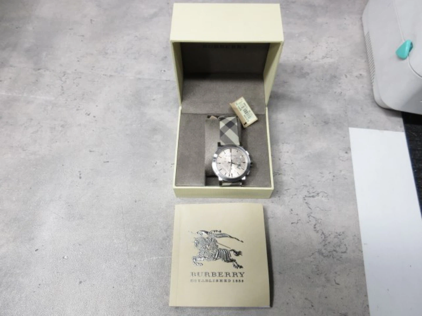 Selling a Burberry watch! It comes with its original box and documentation. The watch features a chronograph dial and a stylish striped band. Great for everyday wear or a special occasion. Retails for 959