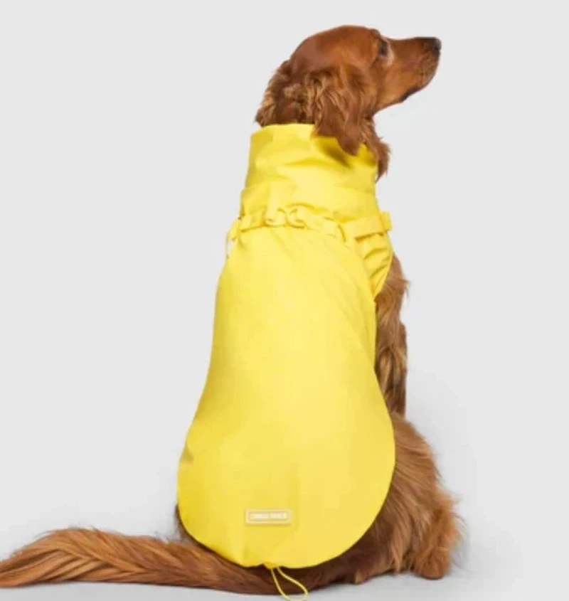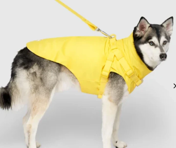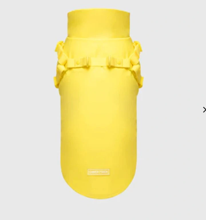 Keep your furry friend dry and stylish with this Canada Pooch yellow harness raincoat! Designed for maximum comfort without restricting movement, it's perfect for those rainy day walks. Ensure the jacket fits snugly but not too loose in the chest, and you should be able to comfortably fit two fingers between your dog's chest and the jacket for a secure and comfortable fit