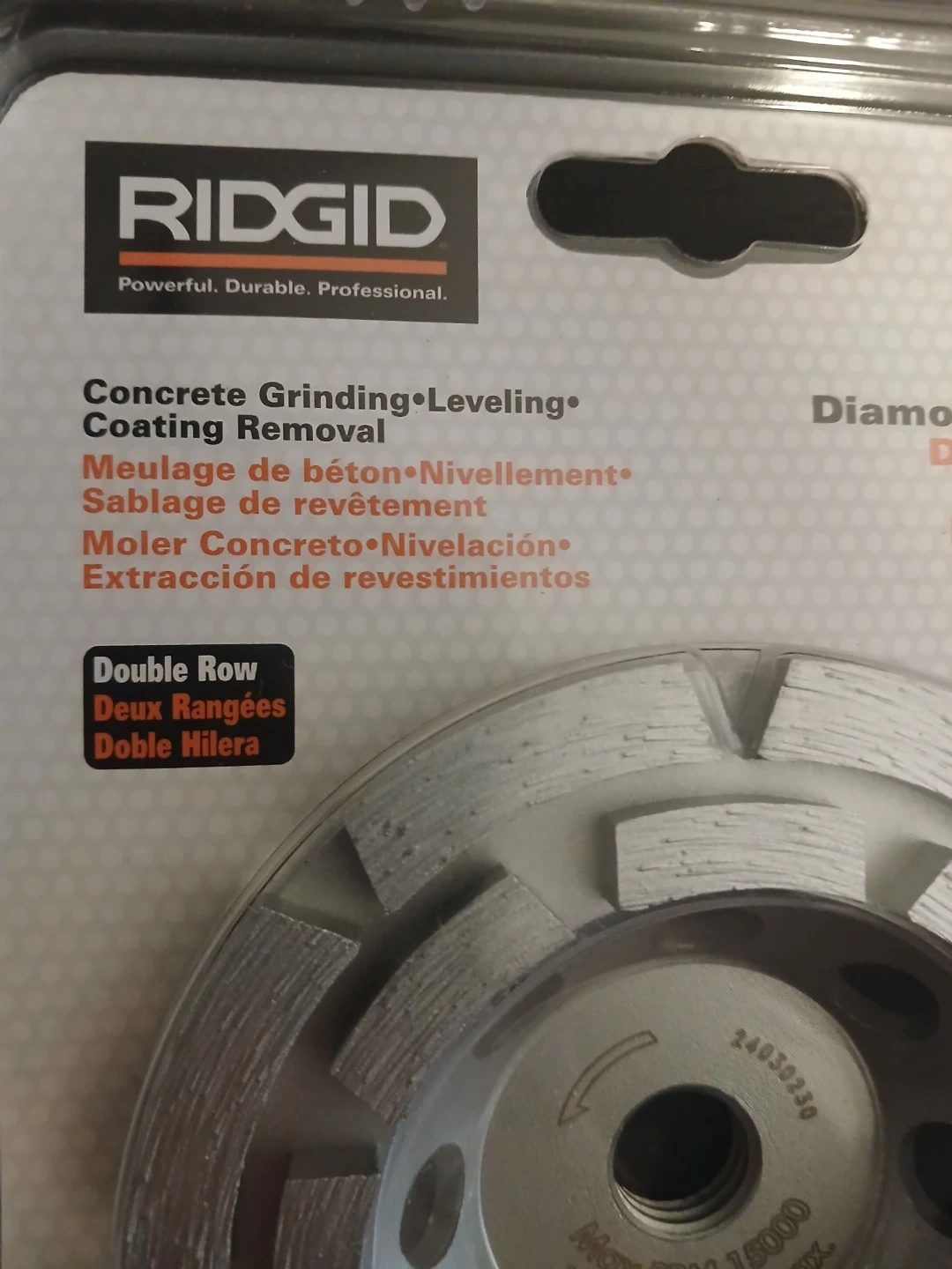 Selling a Ridgid 4" diamond cup wheel, perfect for concrete grinding, leveling, and coating removal. It features a double row design for efficient material removal. Great for both professional and DIY projects!