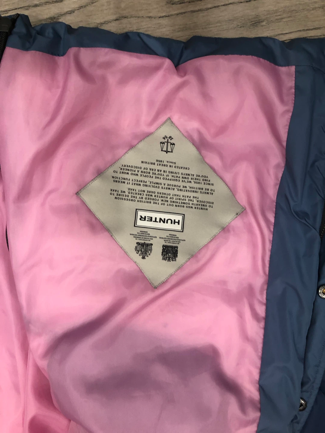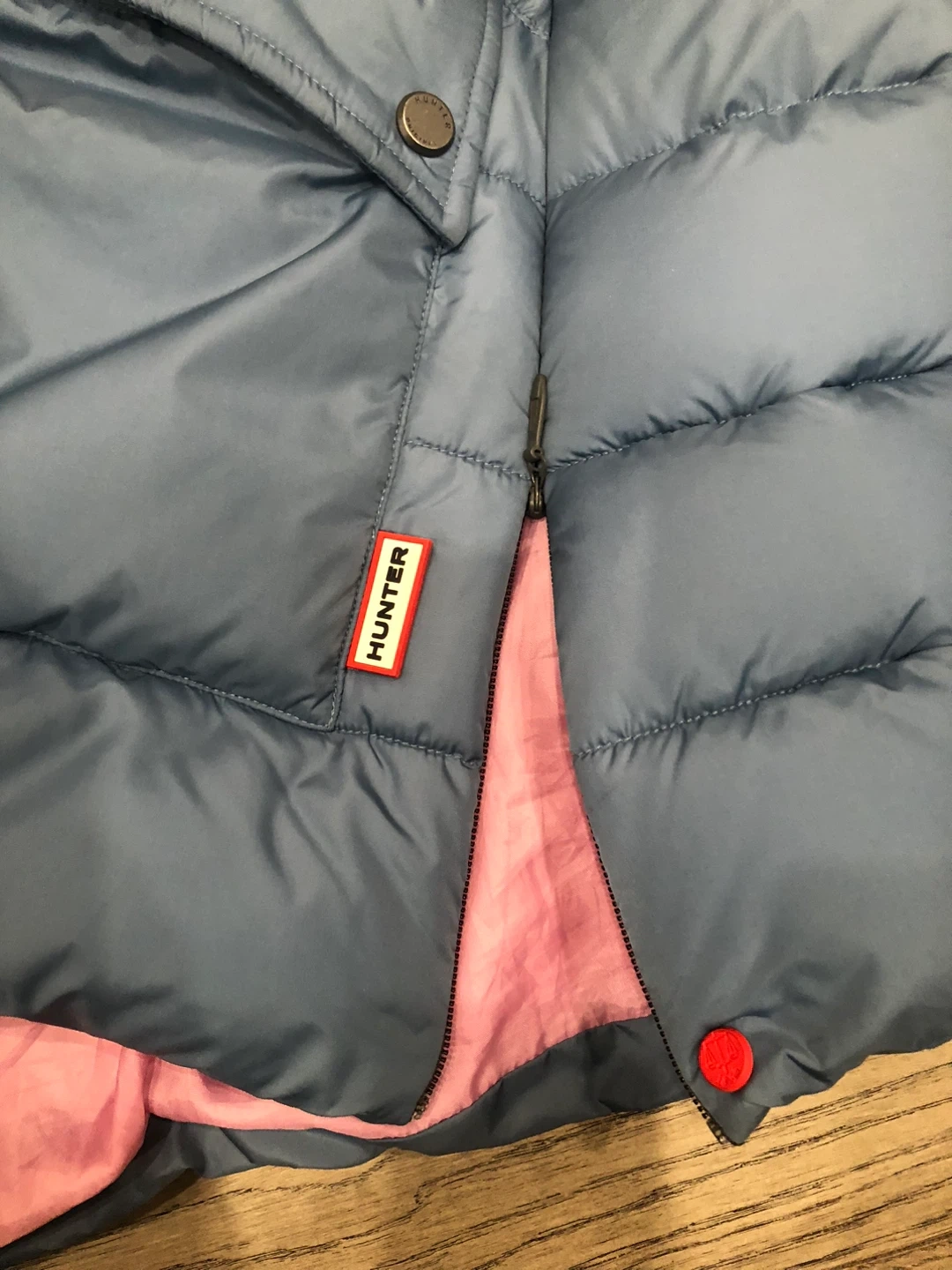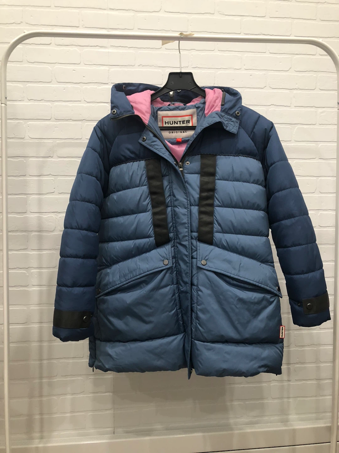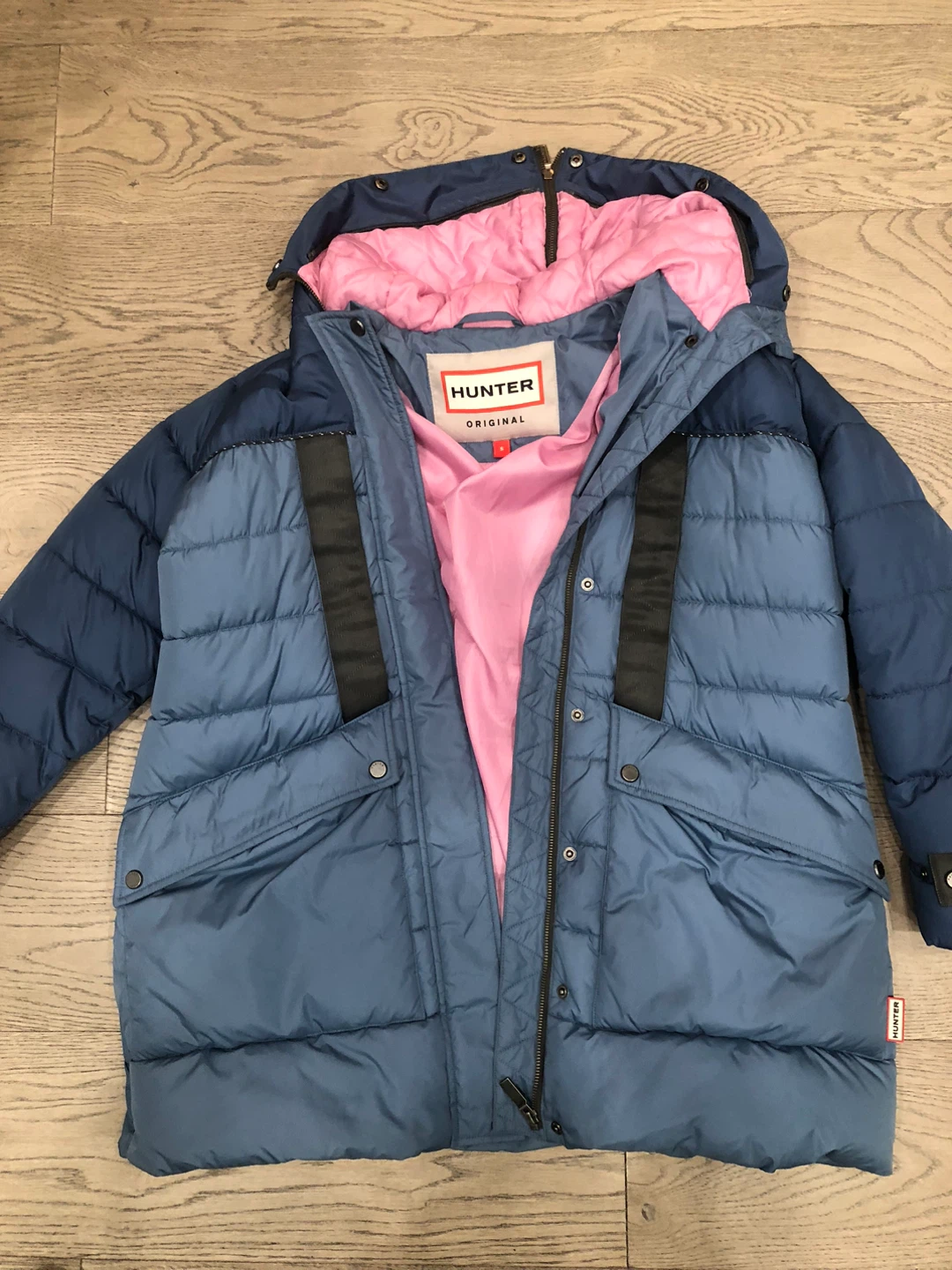 Selling a Hunter Original puffer coat. It's a stylish and warm jacket, perfect for the colder months. The coat features a blue exterior with a pink lining.