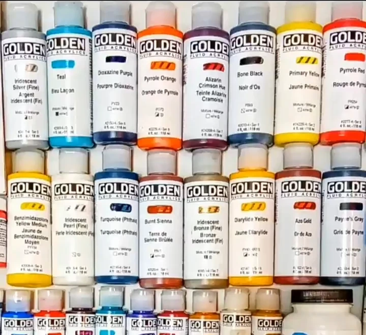 A collection of Golden Fluid Acrylic paints in various colours. Perfect for artists and crafters looking for high-quality pigments and smooth consistency. These paints are known for their versatility and vibrant colours, making them ideal for a wide range of artistic techniques