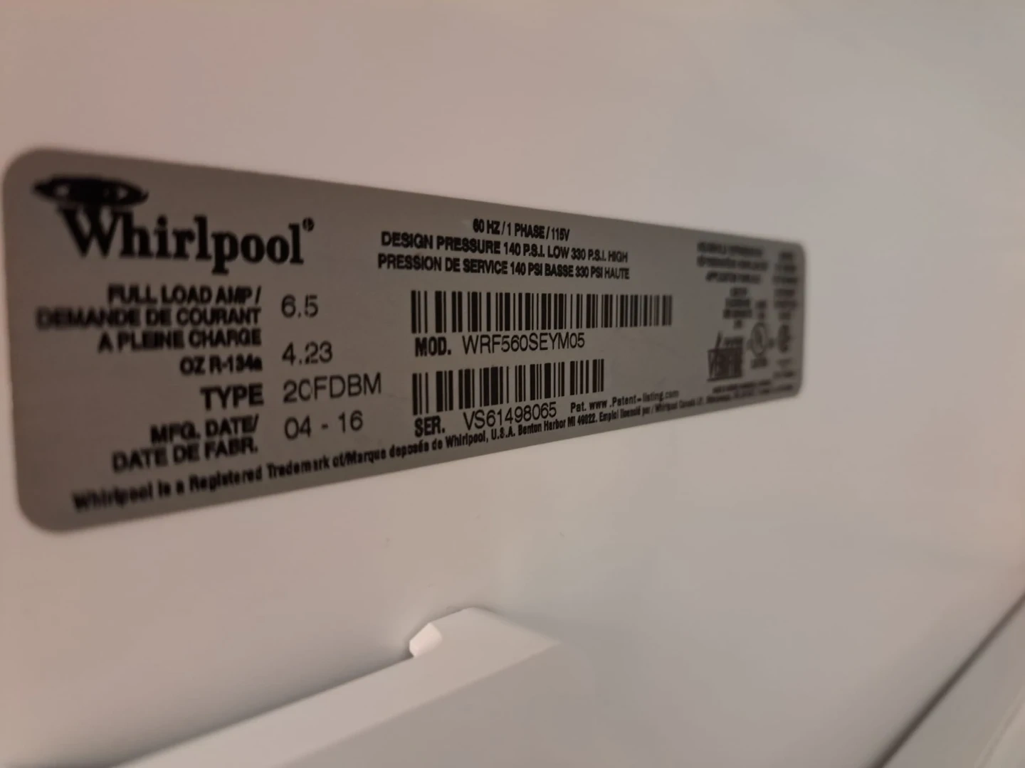 Selling a Whirlpool refrigerator, model WRF560SEYM05. It features a water filter and adjustable temperature settings for the freezer and fridge. The manufacturing date is April 2016.