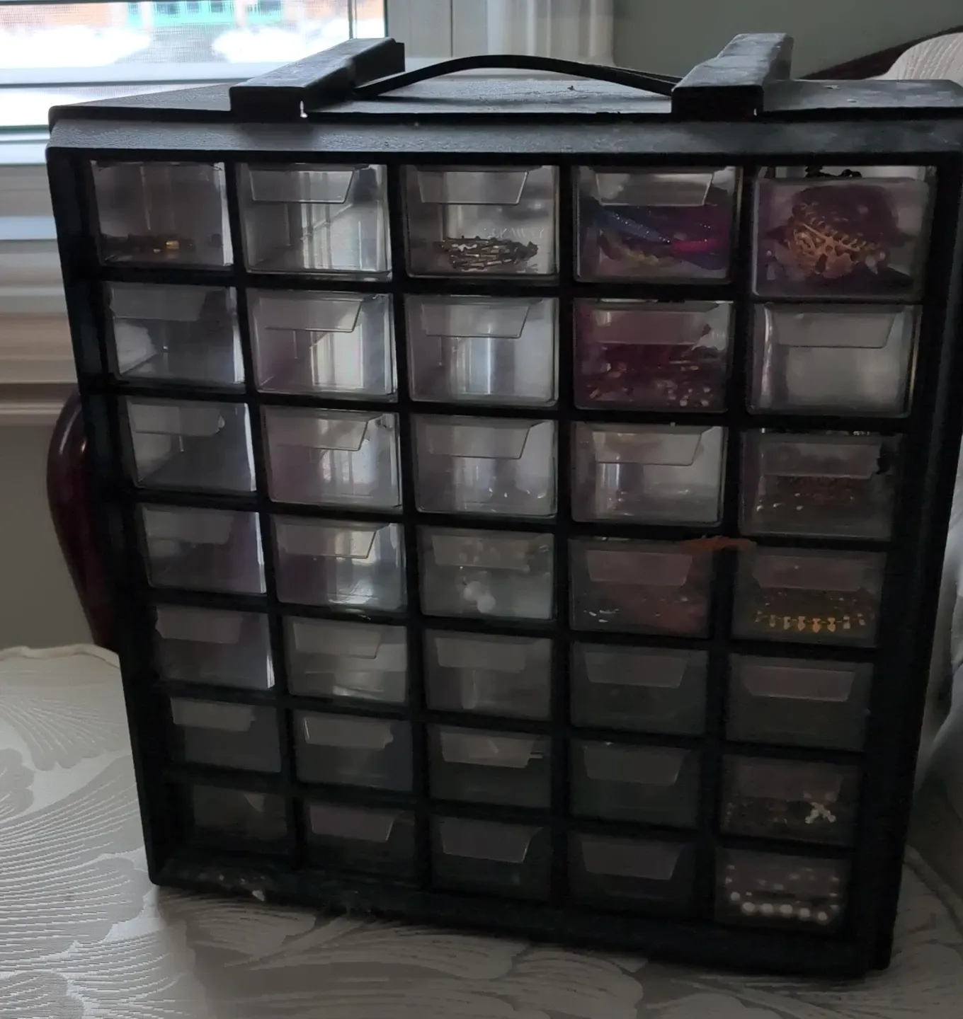 Here's a handy storage cabinet with lots of little drawers! Perfect for organizing small items like beads, jewelry, or craft supplies. It's in great shape and ready to help you get organized