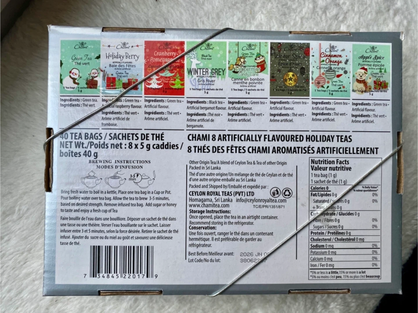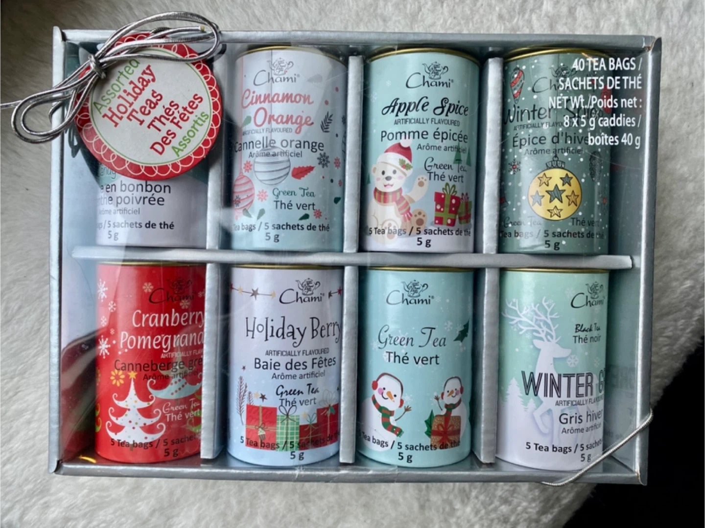 Unopened. Enjoy a variety of flavours with this Chami Holiday Teas Assorted set! Includes 40 tea bags in eight different flavours