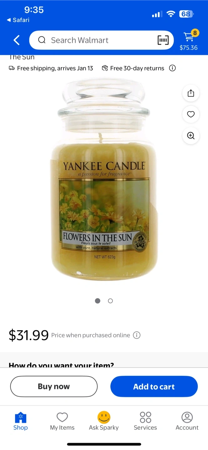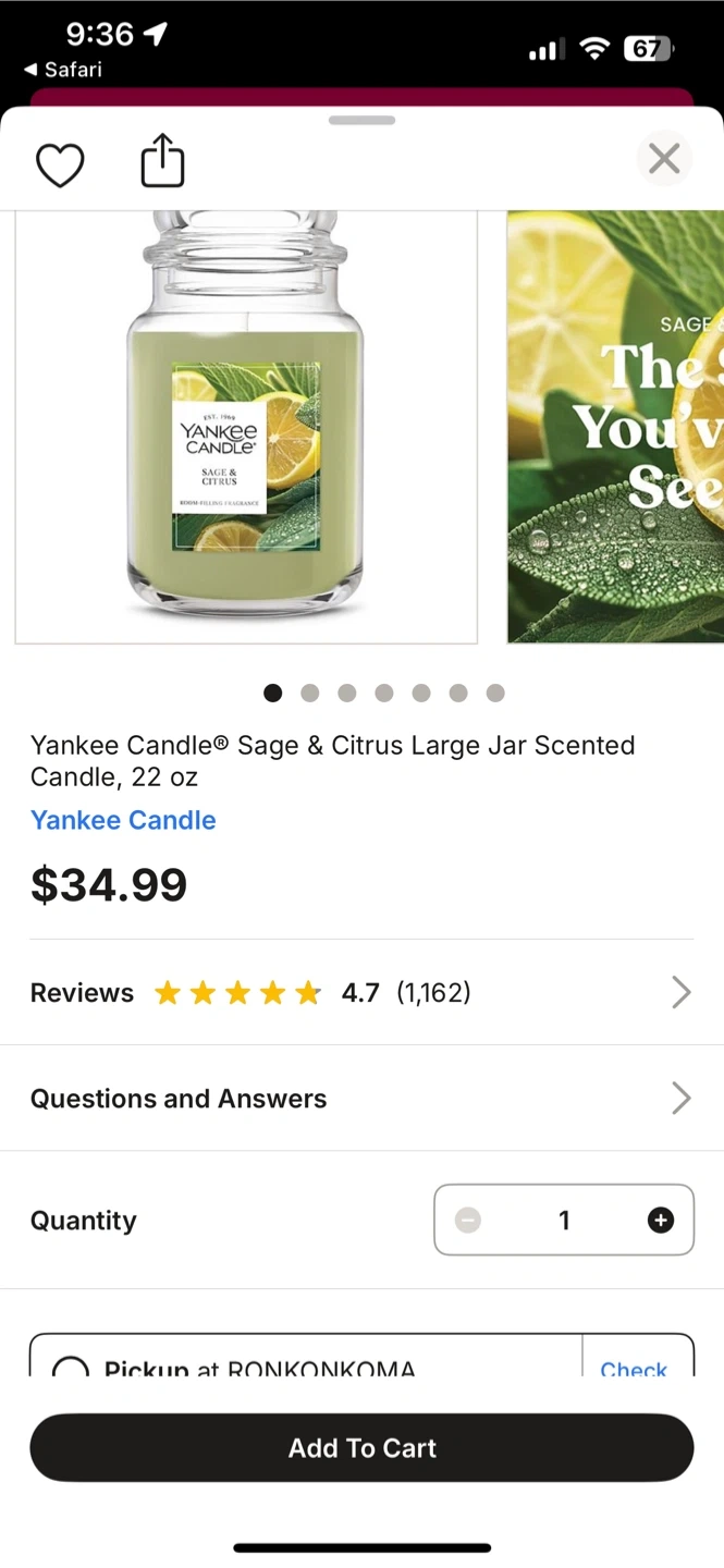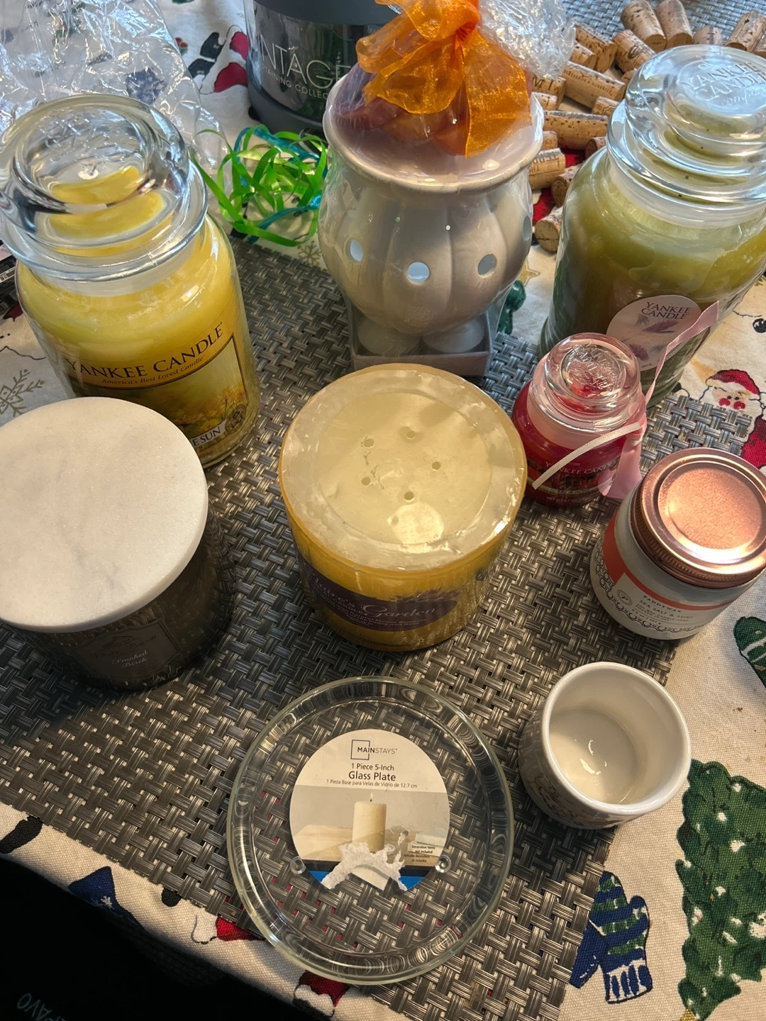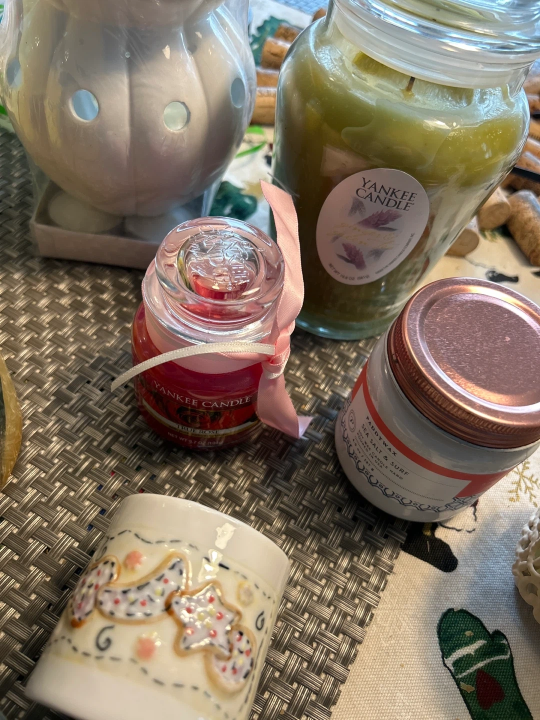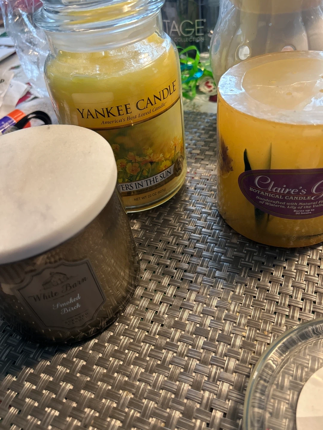 A variety of candles including Yankee Candle and White Barn. Different scents and sizes are available. Great for creating a cozy atmosphere!