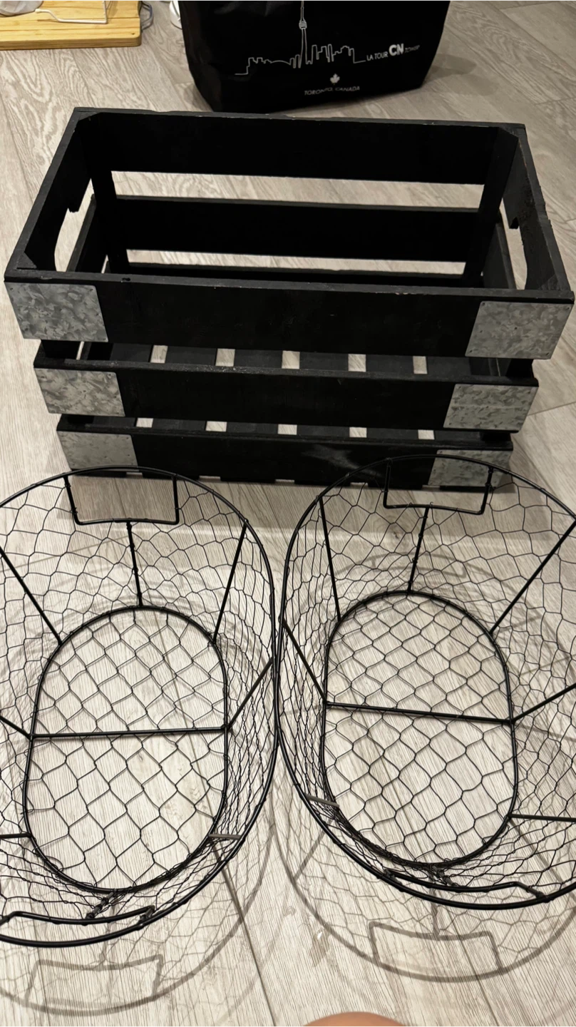 Selling a black wooden crate with metal accents and two wire baskets. They're in great shape and perfect for organizing items around the house!
