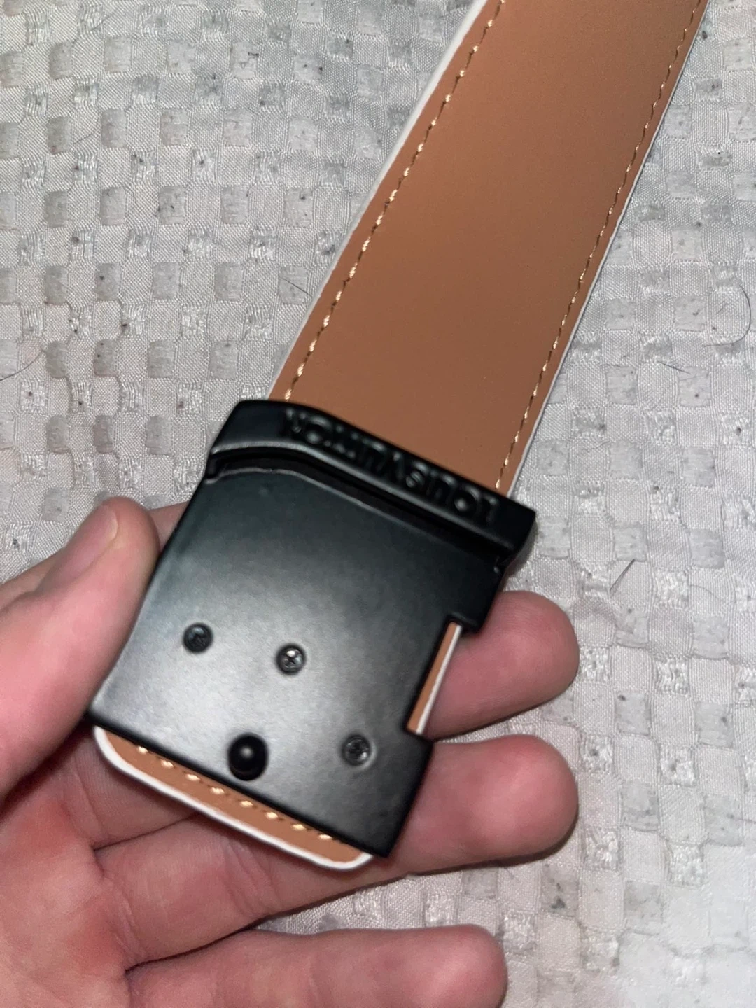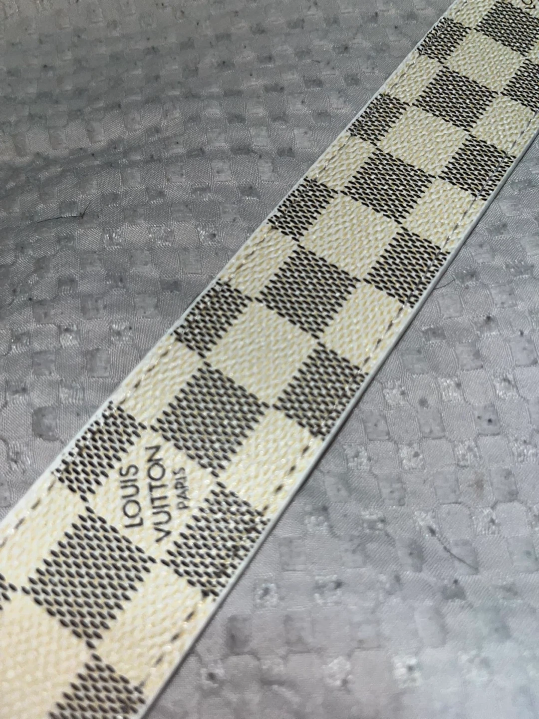 Selling a Louis Vuitton belt in the Damier Azur pattern. It's reversible with a tan leather on the other side. The buckle is black. It's in perfect condition