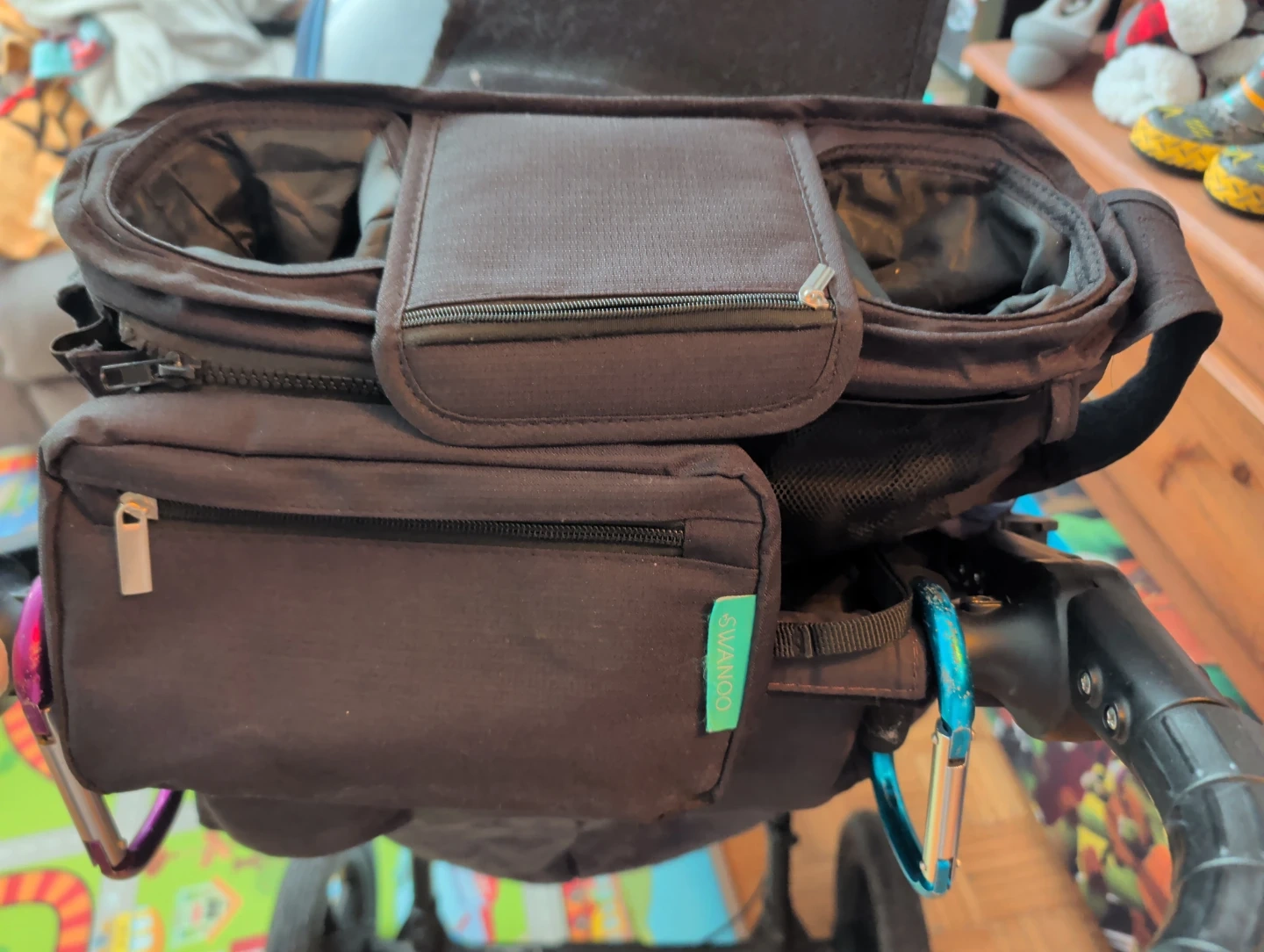 Keep your essentials organized with this handy Swanoo stroller organizer! It features multiple compartments for bottles, diapers, and other necessities, plus a convenient mirror for quick checks on your little one. The black colour ensures it will match any stroller.