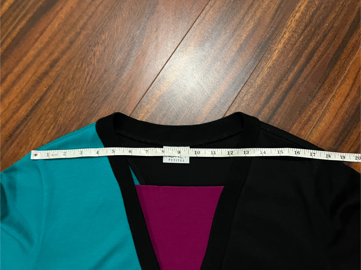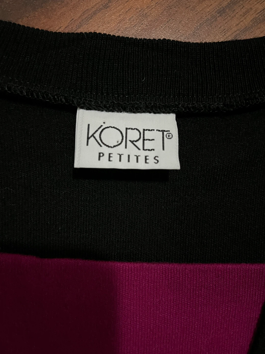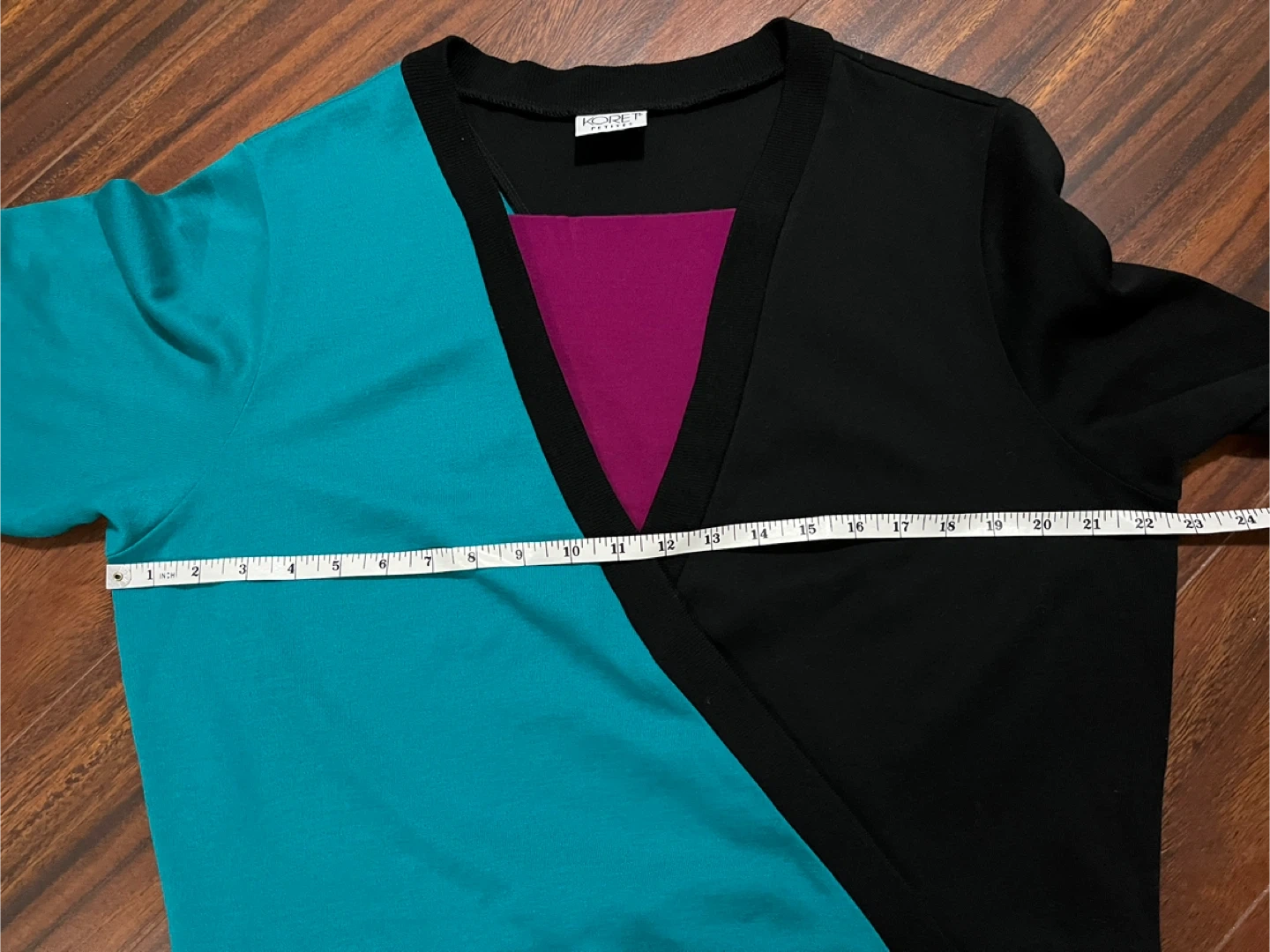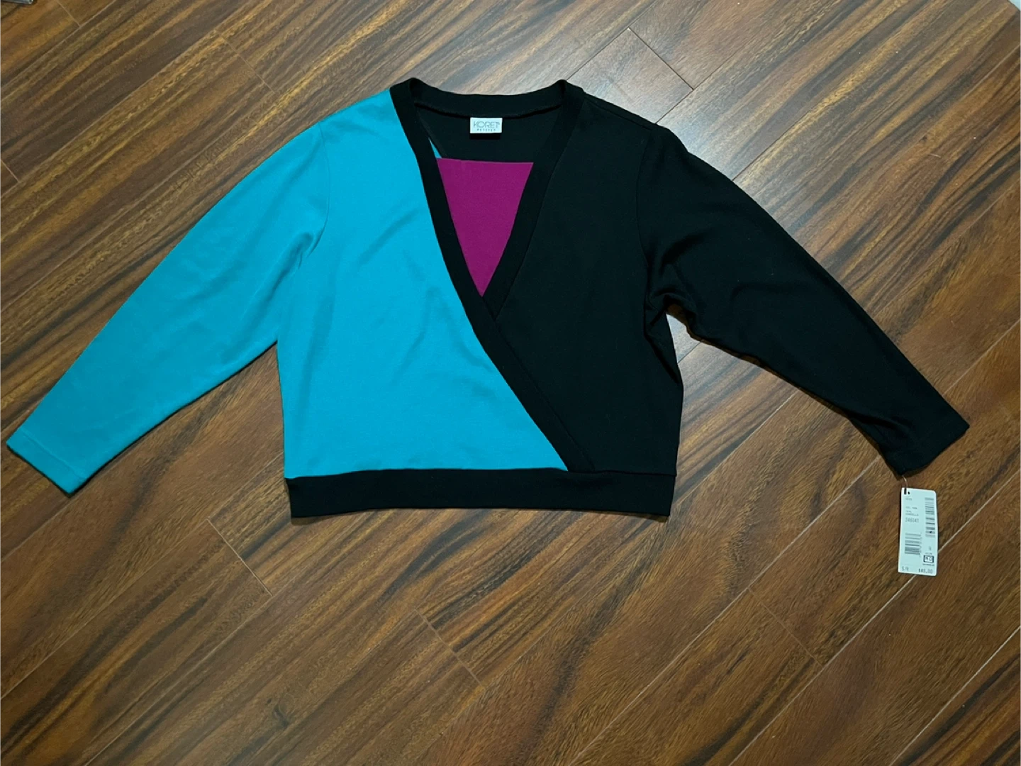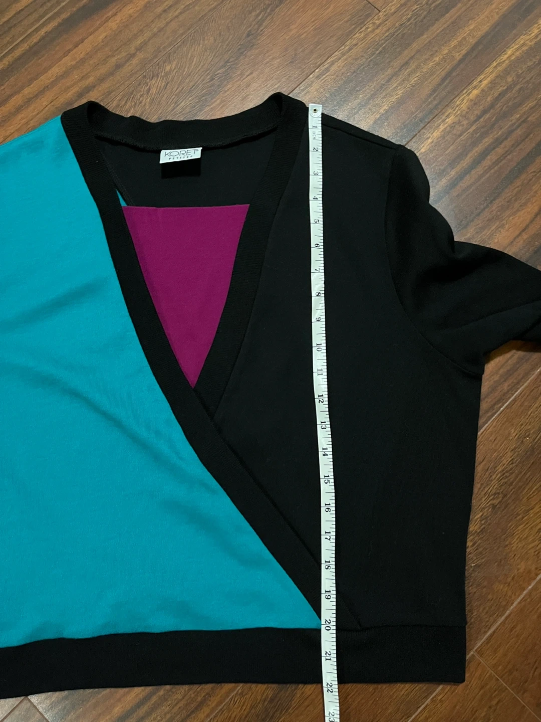 Vintage Koret Petites knit top with bold colour blocking in black, teal and magenta. New with tags. Cropped shape with V-neck and long sleeves. Canadian made acrylic knit with great structure. Petite label but generous fit.