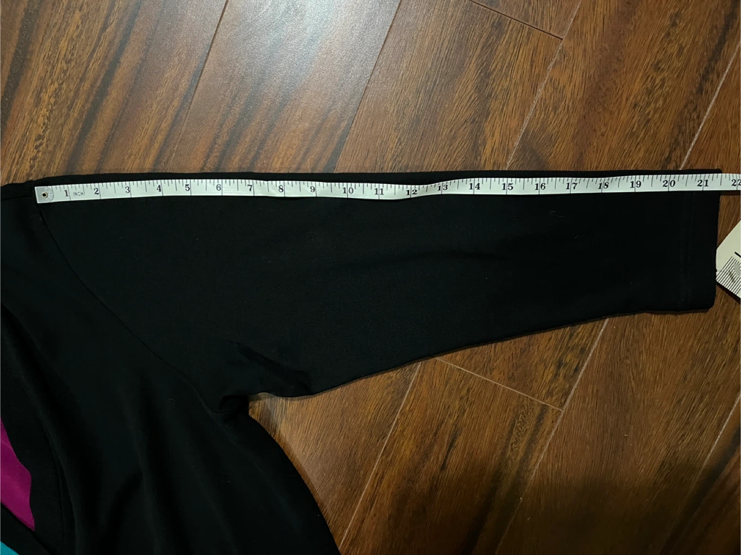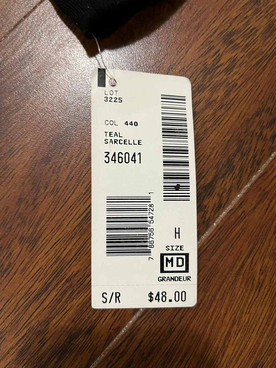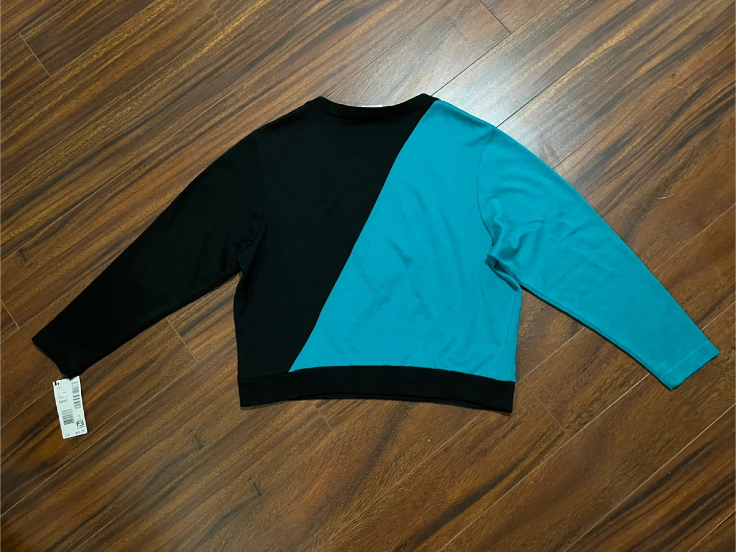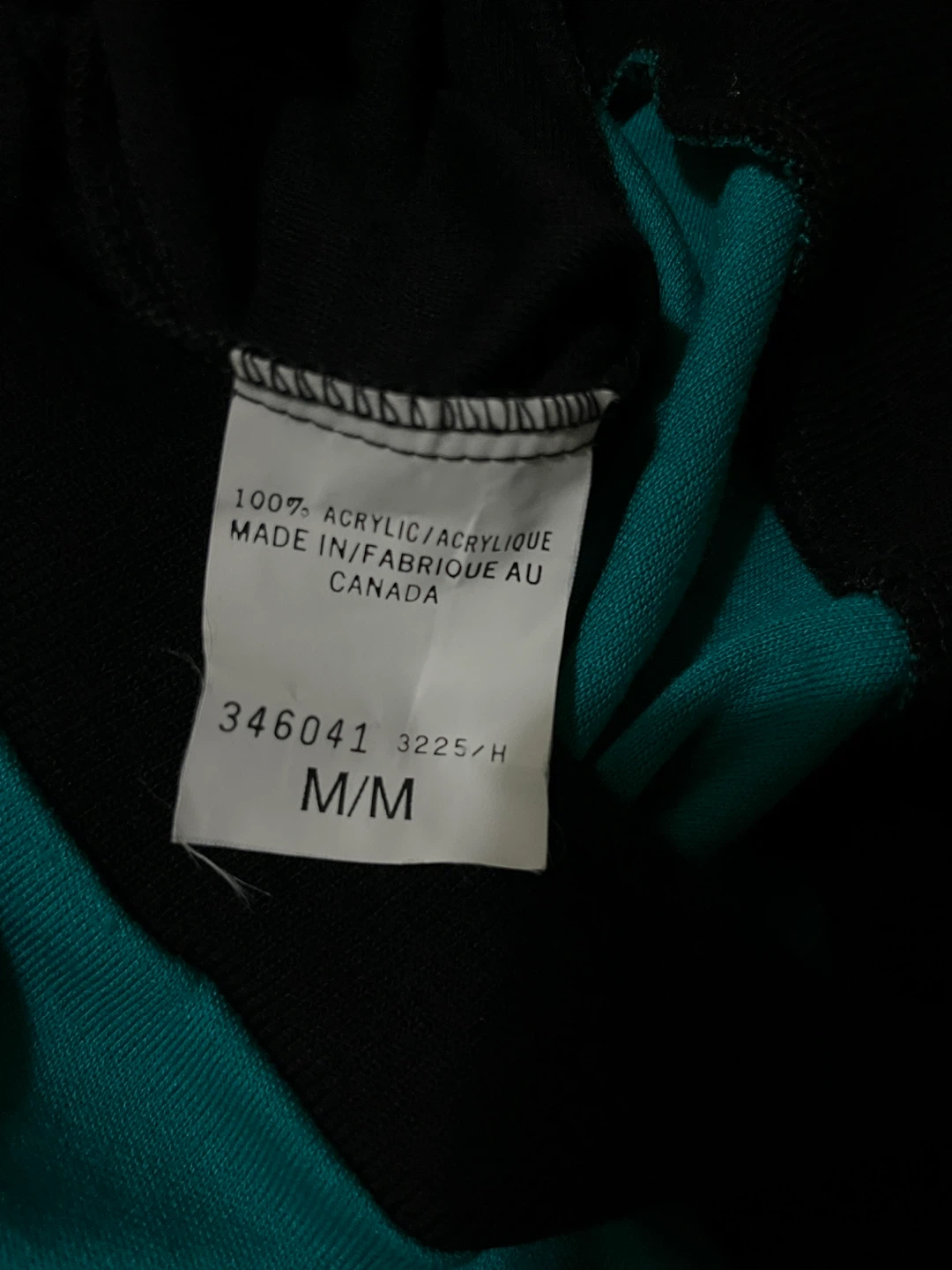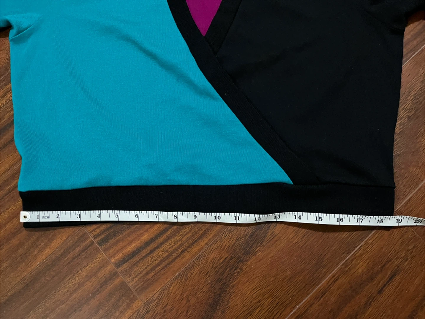 Vintage Koret Petites knit top with bold colour blocking in black, teal and magenta. New with tags. Cropped shape with V-neck and long sleeves. Canadian made acrylic knit with great structure. Petite label but generous fit.