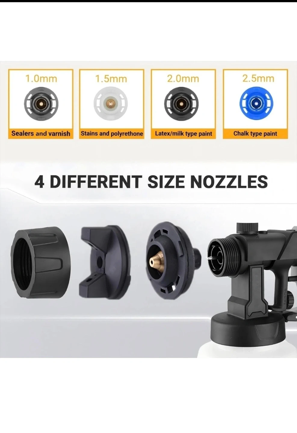 This paint sprayer is new and was never used. Still in sealed box. It has 700 watts of power and a long cord, equipped w/ 3 different spray patterns and 4 nozzles (see pictures). The sprayer is also lightweight to avoid fatigue and there's a knob to control paint output from a 800ml container. The design is user friendly and makes painting much easier.