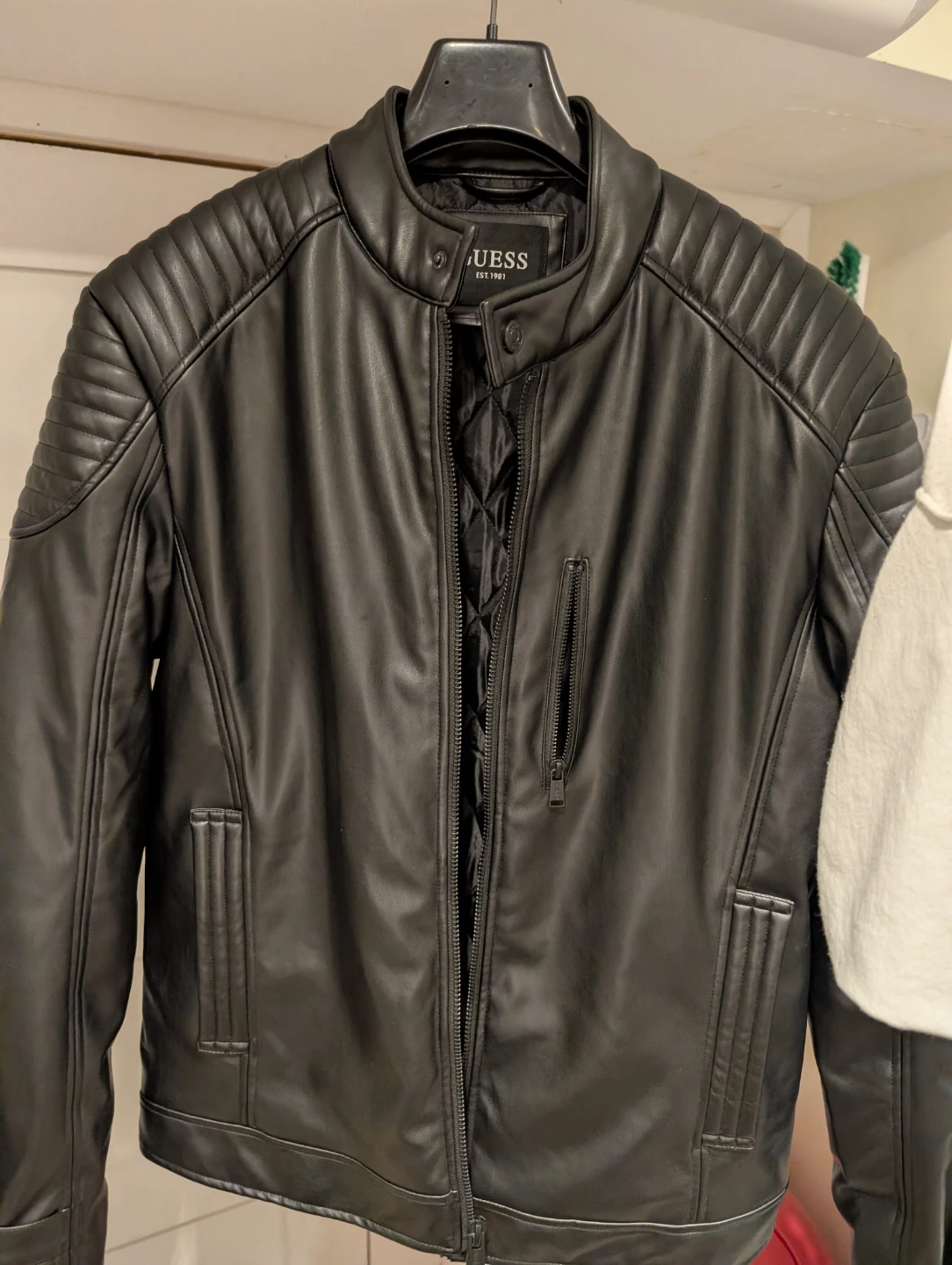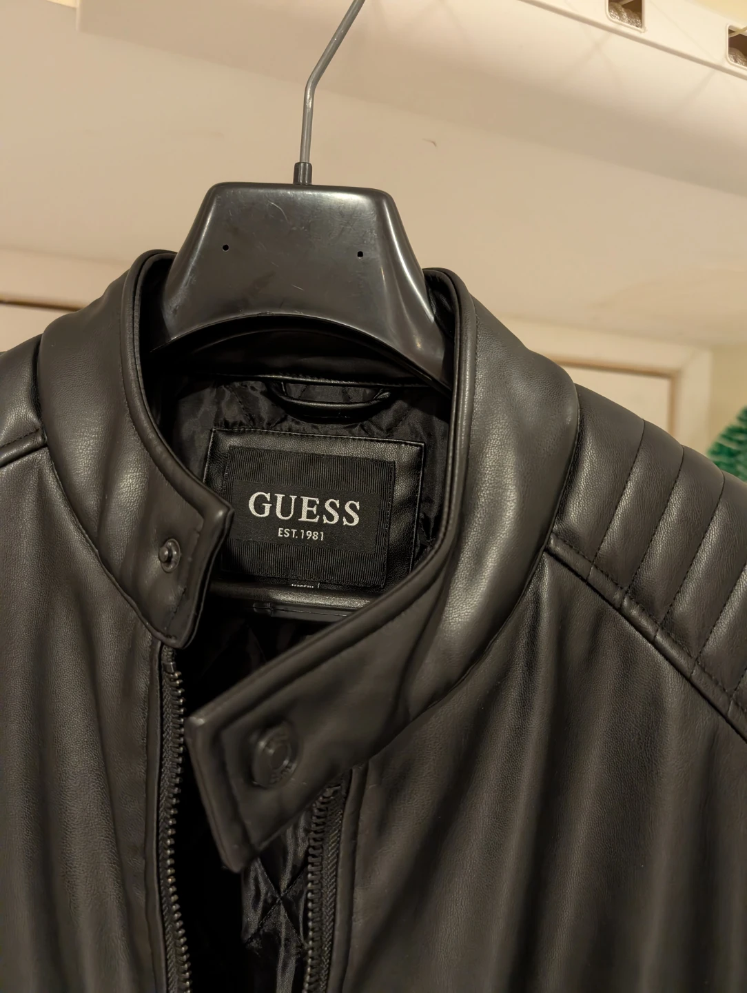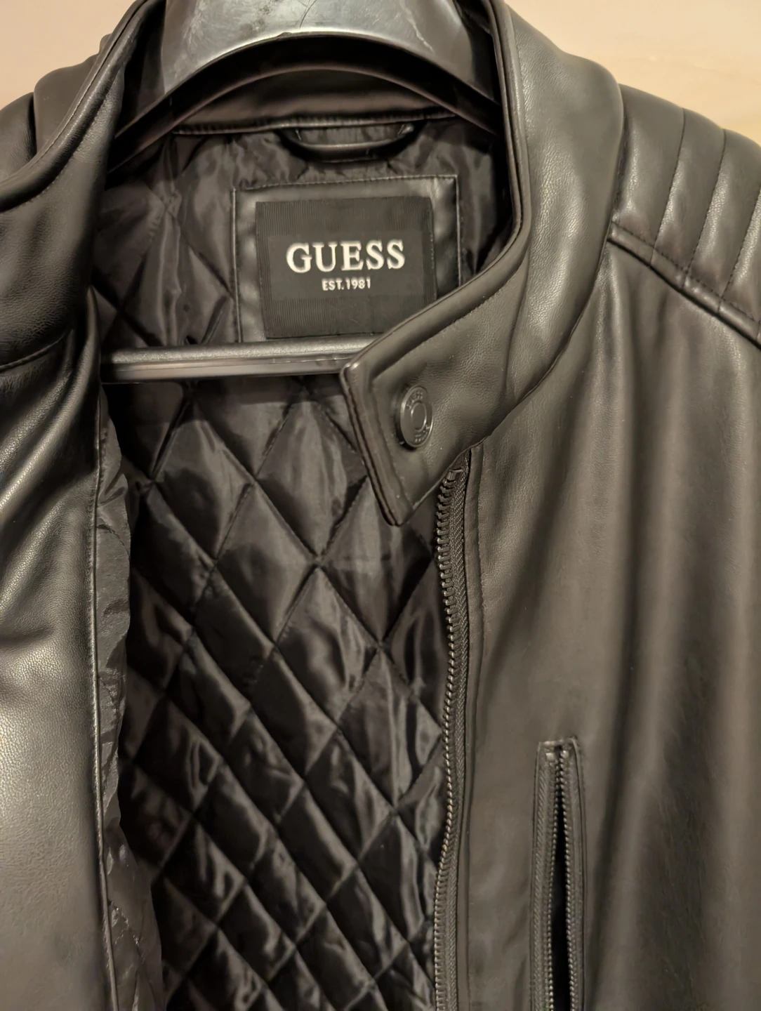 Stylish black faux leather Guess jacket with a quilted lining for extra comfort.