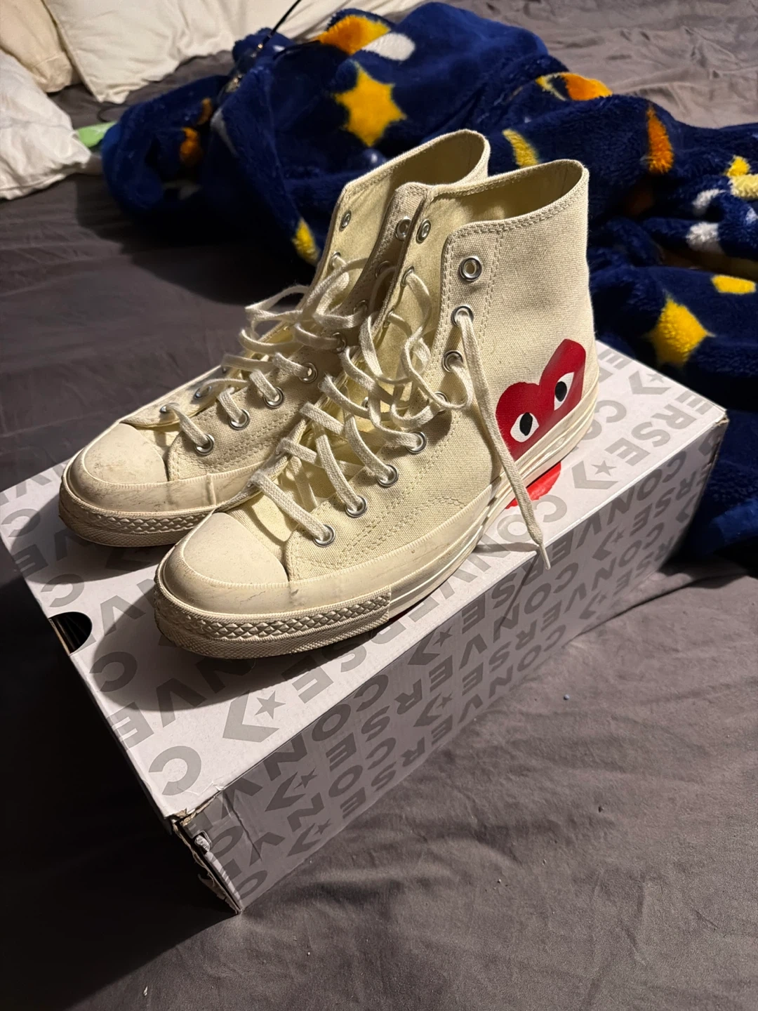 Selling a pair of Converse x Comme des Garçons Chuck Taylor All Star '70 sneakers in US size 12. These iconic high-tops feature the signature red heart logo. Comes with the original box!