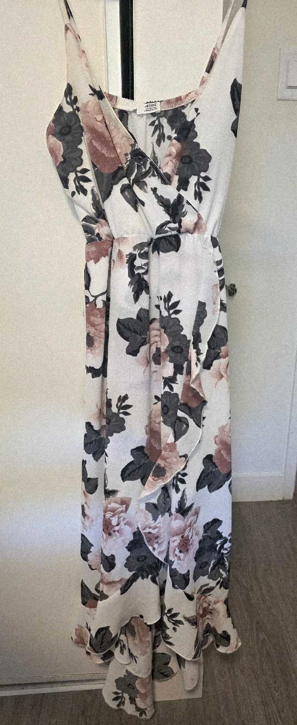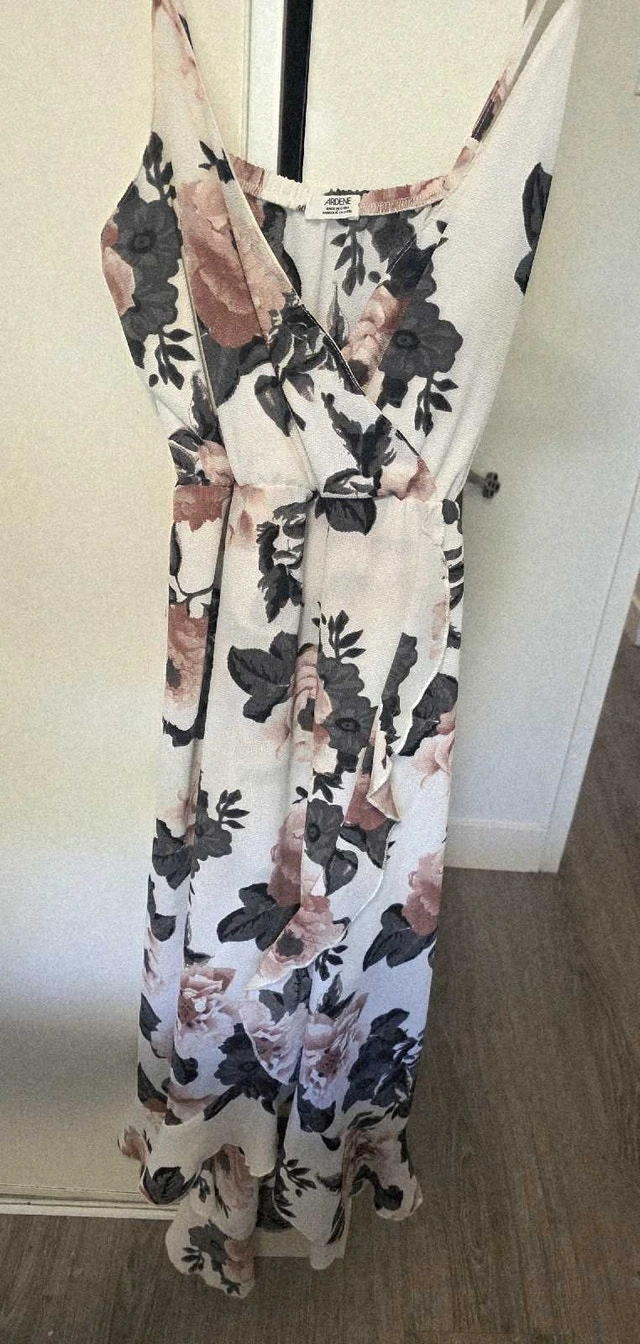 This is a lovely, used floral sundress, perfect for a casual summer day. The dress features a flattering wrap style and a lightweight fabric that's ideal for warm weather. The floral pattern is eye-catching and feminine. It's in good condition. There is slight wear, but it's ready for a new home and more sunny adventures! If the ad is up, the dress is still available.
